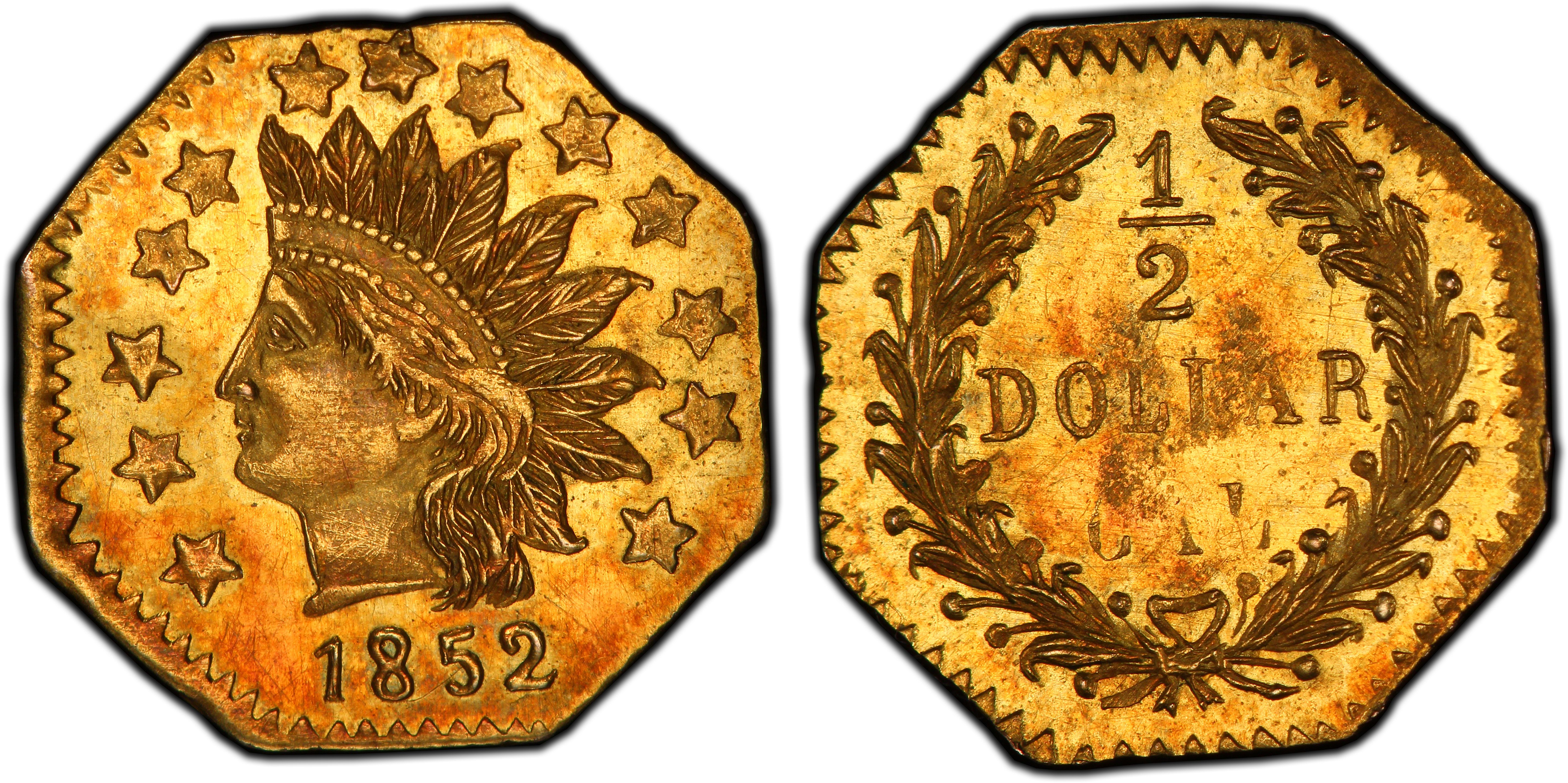 The 1852 BG-963 octagonal half dollar is a quintessential artifact from the chaotic, formative years of the California Gold Rush. Following the discovery of gold at Sutter's Mill in 1848, a massive influx of prospectors and merchants flooded into California, creating a vibrant but haphazard economy. While vast quantities of raw gold dust and nuggets were extracted, the region suffered from a severe, chronic shortage of circulating small-denomination coinage. Daily transactions for essentials like food, lodging, and tools were incredibly cumbersome, often relying on imprecise 'pinches' of gold dust, a system ripe for dispute and inconsistency. The United States government was slow to respond; the San Francisco Mint would not begin full operations until 1854. Into this economic vacuum stepped enterprising private jewelers and metallurgists, many of French origin, located primarily in San Francisco. Beginning in 1852, they began striking fractional denominations—quarter dollars, half dollars, and dollars—to facilitate everyday commerce. These initial issues, known as 'Period One' (1852-1857) fractionals, are considered by numismatists to be legitimate, circulating media of exchange born of necessity. The BG-963, with its crude but earnest 'Indian Princess' design, was struck during this earliest phase. The production methods were primitive, often involving hand-cut dies and manual screw presses or even the hammer method, resulting in coins of varying strike quality and irregular planchets. Though accepted in trade, these coins were technically underweight for their face value, a fact generally overlooked in the inflationary boom economy where any form of convenient currency was welcome. As federal coinage became more plentiful after 1854, the need for these private issues waned, and they transitioned from essential currency to popular souvenirs of the Gold Rush, eagerly purchased by miners to send back east. The Coinage Act of 1864 officially outlawed private currency, but the law wasn't strictly enforced until 1883, allowing a second period of 'jeweler's issues' (struck mainly as keepsakes) to flourish. The BG-963, as a Period One issue, remains a direct, tangible link to the initial crisis of commerce that defined one of America's most pivotal economic and social transformations.