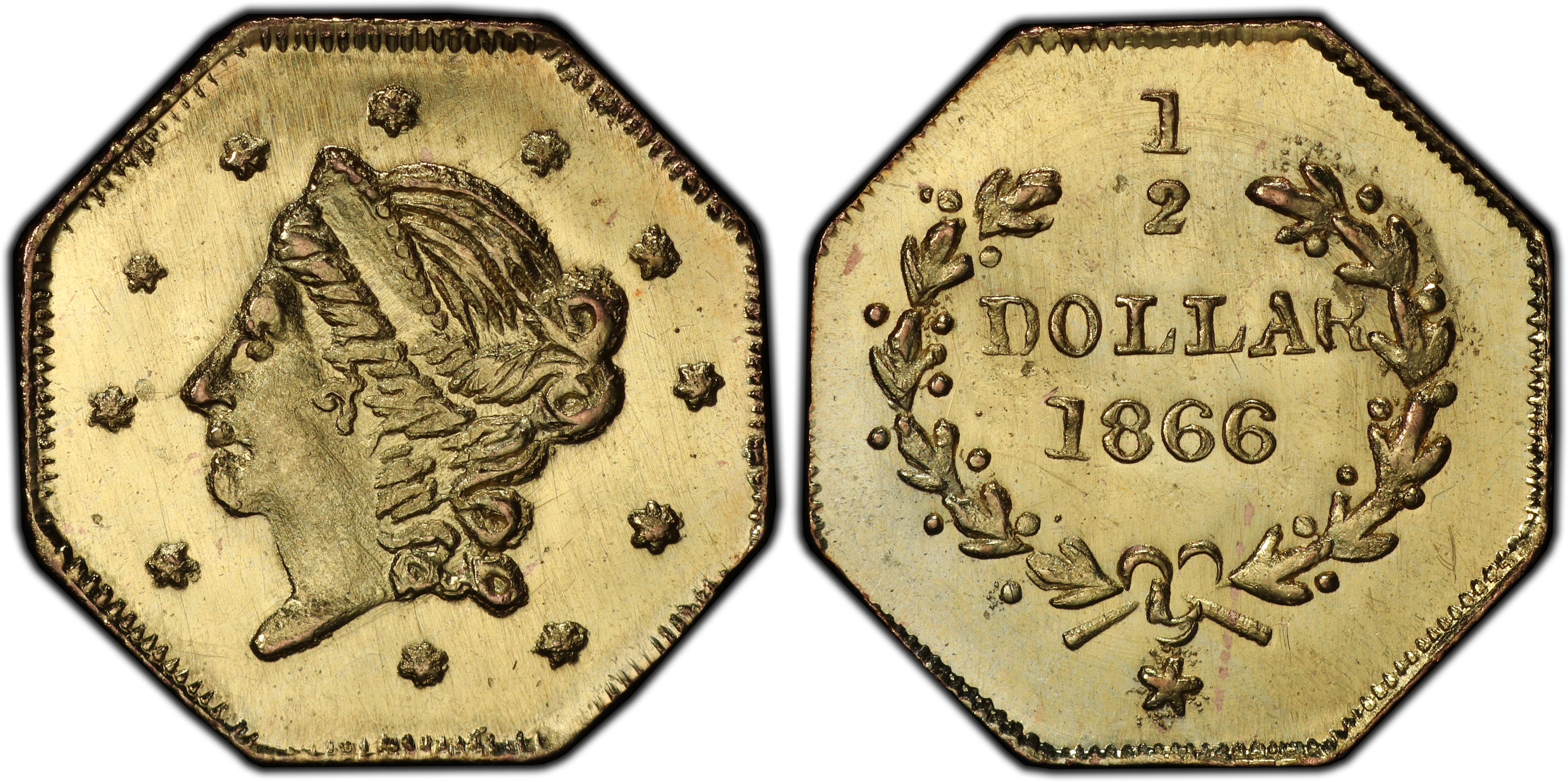 The 1866 Octagonal 50 Cents, cataloged as Breen-Gillio 903, is a quintessential example of a 'Period Two' California Fractional Gold piece. By the mid-1860s, the initial impetus for these tiny gold coins—a severe shortage of small change during the Gold Rush—had largely subsided. The establishment and robust production of the San Francisco Mint in 1854 had supplied the region with ample federal coinage. Consequently, the private production of fractional gold shifted from a necessity of commerce to a new, lucrative enterprise: the souvenir and jewelry trade. These later issues, often termed 'jeweler's pieces,' were not intended to circulate as money, but were instead marketed to tourists, sentimental former miners, and citizens back East who were captivated by the romance of the California Gold Rush. Unlike their 'Period One' predecessors which were generally of honest weight, Period Two pieces were notoriously underweight for their face value, with their gold fineness varying wildly from as low as 14-karat to near-pure gold, depending on the maker's integrity and intent. The production of BG-903 in 1866 occurred just two years after the Coinage Act of 1864, which explicitly outlawed private coinage. However, the law was weakly enforced by the Secret Service in distant California until the early 1880s, allowing firms like Frontier & Co. to continue their prolific output. These pieces were typically struck by hand, using a hammer to strike an upper die, which resulted in inconsistent strike quality and frequent die cracks. Their octagonal shape was a popular novelty, harkening back to the massive $50 'slugs' of the early 1850s. Today, BG-903 is not just a relic of the Gold Rush, but a tangible link to the burgeoning tourism industry of post-Civil War San Francisco and the clever jewelers who capitalized on the nation's fascination with its Western frontier.