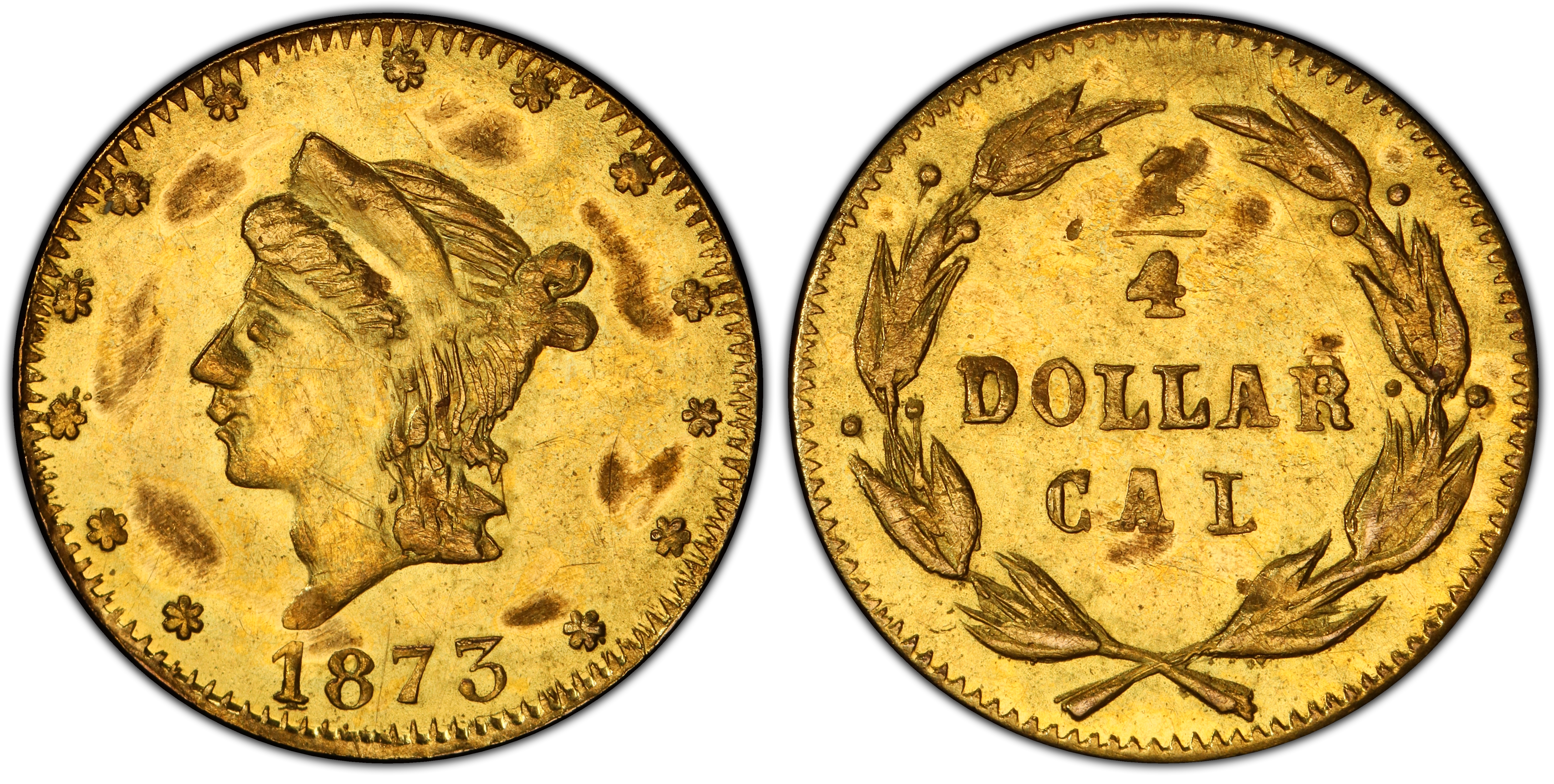 The 1873 BG-842 25 Cents piece emerges from the second major period of private Californian coinage, a fascinating era that followed the initial chaos of the Gold Rush. By the 1870s, the acute shortage of small change that had plagued California in the early 1850s had largely been resolved by the output of the San Francisco Mint, which opened in 1854. Consequently, the private 'fractional gold' coins of this 'Period Two' (1858-1882) served a different purpose. They were no longer essential instruments of commerce but were instead produced as popular souvenirs, keepsakes, and jewelry items, capitalizing on the romantic allure of the Gold Rush. These miniature gold coins were tangible mementos of California's unique economic identity. The Coinage Act of 1864 had prohibited private coinage, but the law was not aggressively enforced against these small, privately issued tokens until the early 1880s. This legal gray area allowed a number of manufacturing jewelers in San Francisco to continue their production. The BG-842 is a product of this environment, struck by a prominent local jeweler not for circulation in the mines, but for sale to tourists and residents. Its existence speaks to a California that was no longer a frontier but a maturing society with a powerful founding myth—a myth that could be purchased in the form of a tiny, glittering gold coin. The attribution of this piece is tied to the history of its manufacturers. While many earlier issues were anonymous, research points to the prolific jewelry firms of San Francisco. Robert B. Gray & Co. was a major producer, but he sold his interests to the California Jewelry Company, owned by the Levison Brothers, in 1871. Given the 1873 date of BG-842, it is almost certainly a product of the Levisons, likely using dies and equipment acquired from Gray, continuing a profitable and popular product line.