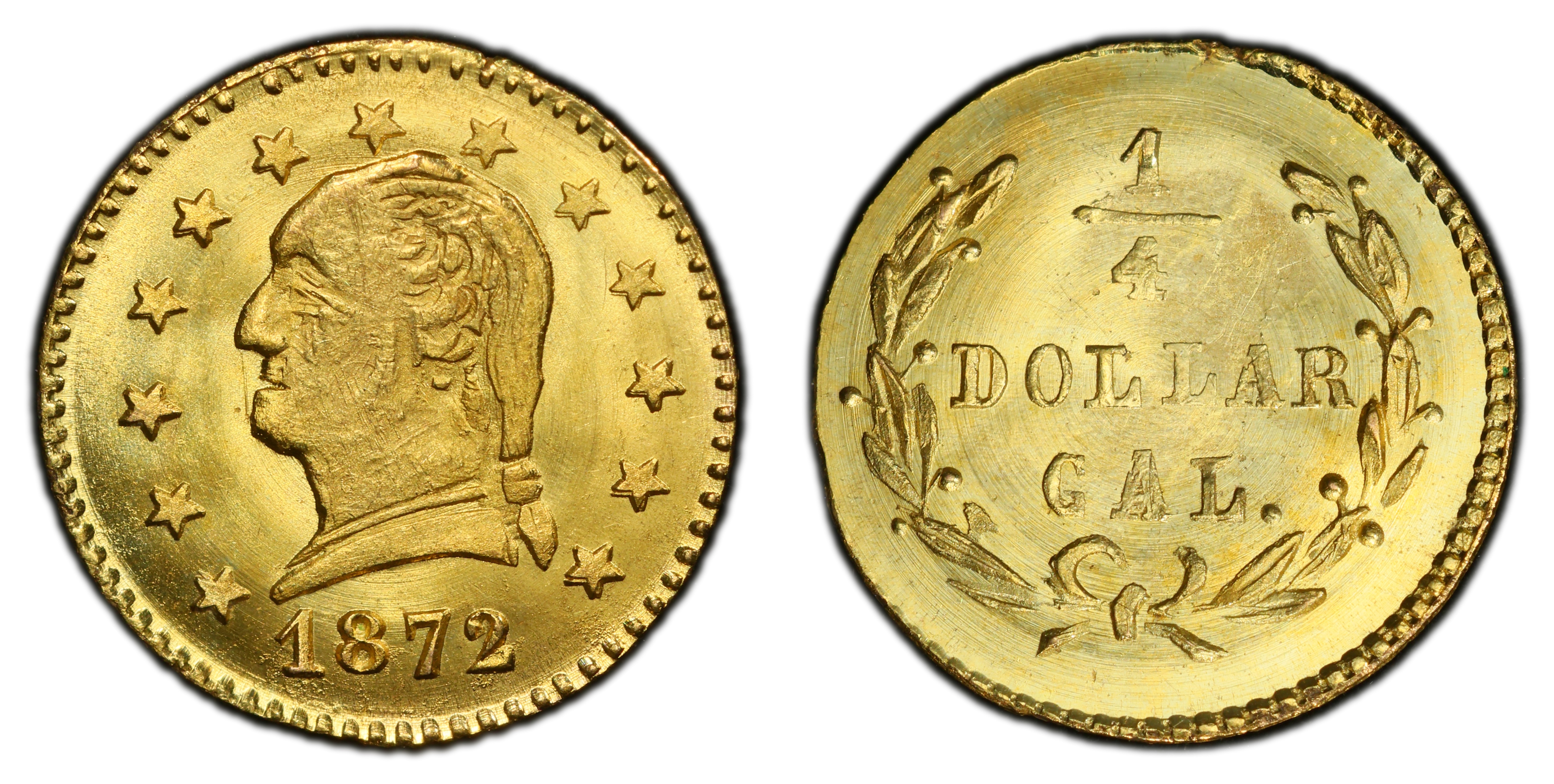 The 1872 BG-818 Washington Head quarter dollar emerges from the second major phase of California fractional gold production, often termed 'Period Two' (1859-1882) by numismatists following the Breen-Gillio classification. By this era, the acute shortage of small change that characterized the initial Gold Rush had largely subsided with the efficient operation of the San Francisco Mint. The purpose of these tiny gold pieces had shifted dramatically from utilitarian currency to charming souvenirs and jewelry items. Unlike the 'Period One' issues, which were struck with at least a pretense of conforming to federal weight standards, these later 'jeweler's issues' were notoriously underweight for their stated denomination and exhibited a wide variety of novel designs, breaking from the ubiquitous Liberty Head motif. The introduction of a Washington Head design in 1872 was a significant departure, predating George Washington's appearance on a regular-issue federal coin by sixty years. This patriotic theme was likely a marketing decision by the unattributed private minter, intended to appeal to tourists and citizens celebrating American heritage. These pieces were typically struck in small, back-room operations run by jewelers or metalsmiths in San Francisco, often using hand-operated screw presses or even simple hammer striking, which resulted in inconsistent strike quality. The Coinage Act of 1864 had made the private issuance of coinage illegal, but enforcement was lax, and production continued until a Secret Service crackdown in the early 1880s finally suppressed the industry. The BG-818, therefore, represents a fascinating product of this legally grey period—a commercial venture that catered to a collector and tourist market, a miniature gold memento of a trip to the romanticized West, rather than a coin intended to buy a loaf of bread. Its numismatic significance lies in its unique design, its status as a scarce 'jeweler's issue,' and the window it provides into the post-Gold Rush economy of California.