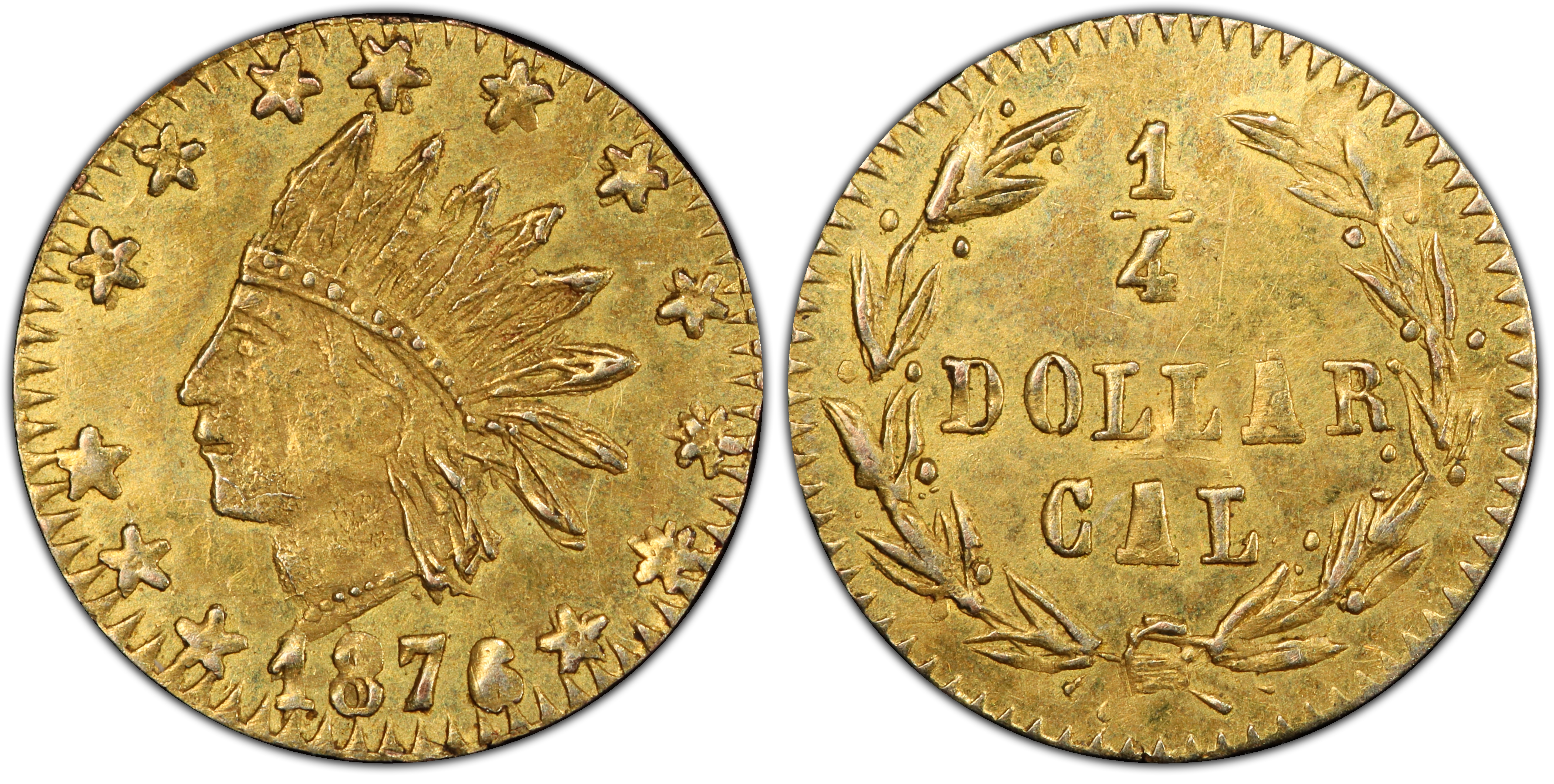 Authentication TipsAuthentic Period Two pieces must have a denomination (e.g., '25 CENTS' or '1/4 DOL.'). Souvenir tokens made after the 1883 crackdown often lack a denomination and may say 'CAL GOLD' instead. Look for sharp, albeit sometimes crude, striking details typical of hand-striking. Replicas are extremely common; they often have a soapy, indistinct appearance, incorrect weight, or may feature a bear on the reverse (a design element never used on genuine fractional gold). A key die diagnostic for BG-852 is that the tip of the bust points directly at the numeral '1' in the date 1876.