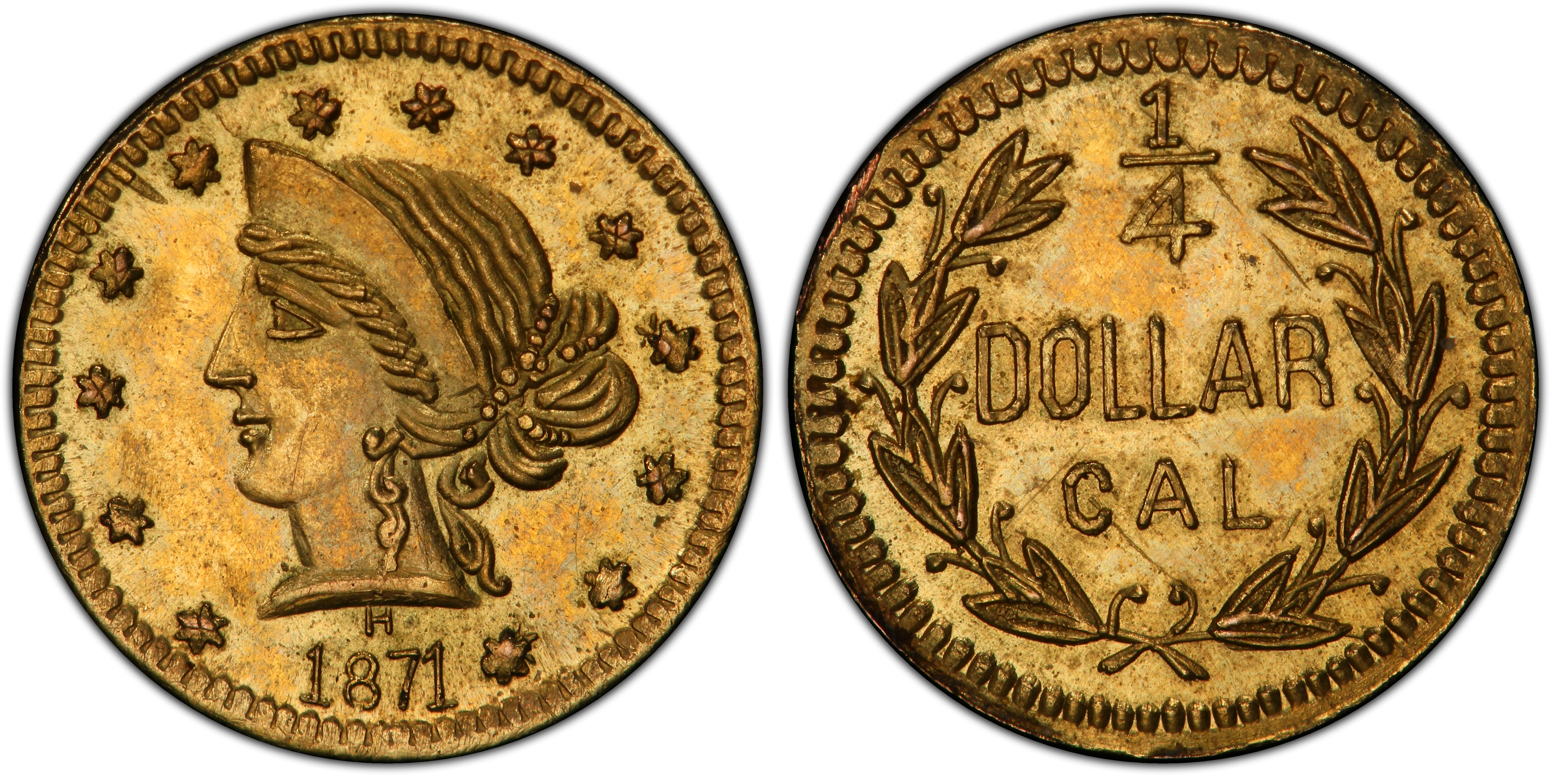 The 1871 Round Liberty Head 25 Cents, cataloged as Breen-Gillio 865, is a quintessential example of 'Period Two' California Fractional Gold. By the early 1870s, the initial, urgent need for small-denomination coinage that characterized the Gold Rush had largely subsided. The San Francisco Mint was producing ample federal coinage, and the economic landscape of California had matured significantly. The production of fractional gold pieces during this era shifted from filling a critical monetary void to serving a burgeoning numismatic and souvenir market. These small gold pieces were no longer primarily intended to facilitate everyday transactions in mining camps but were instead crafted by local jewelers as keepsakes, charms, and collectibles for locals and tourists alike. The Coinage Act of 1864 had officially prohibited private coinage, but enforcement was lax, particularly in the West. This legal ambiguity allowed a vibrant industry of 'jeweler's issues' to flourish. These pieces, often lighter and with more artistic variance than their 'Period One' predecessors, were skillfully made but contained gold value significantly below their stated face value. The BG-865, with its classic Liberty head motif, mimicked the design of official U.S. gold coinage, enhancing its appeal as a miniature treasure. The anonymous nature of its minter is typical of the period; many jewelers produced these pieces without specific identifying marks, focusing on craftsmanship and sales rather than creating a proprietary currency. Their continued production until the Secret Service finally cracked down in the early 1880s speaks to their enduring popularity as a memento of the great California Gold Rush.