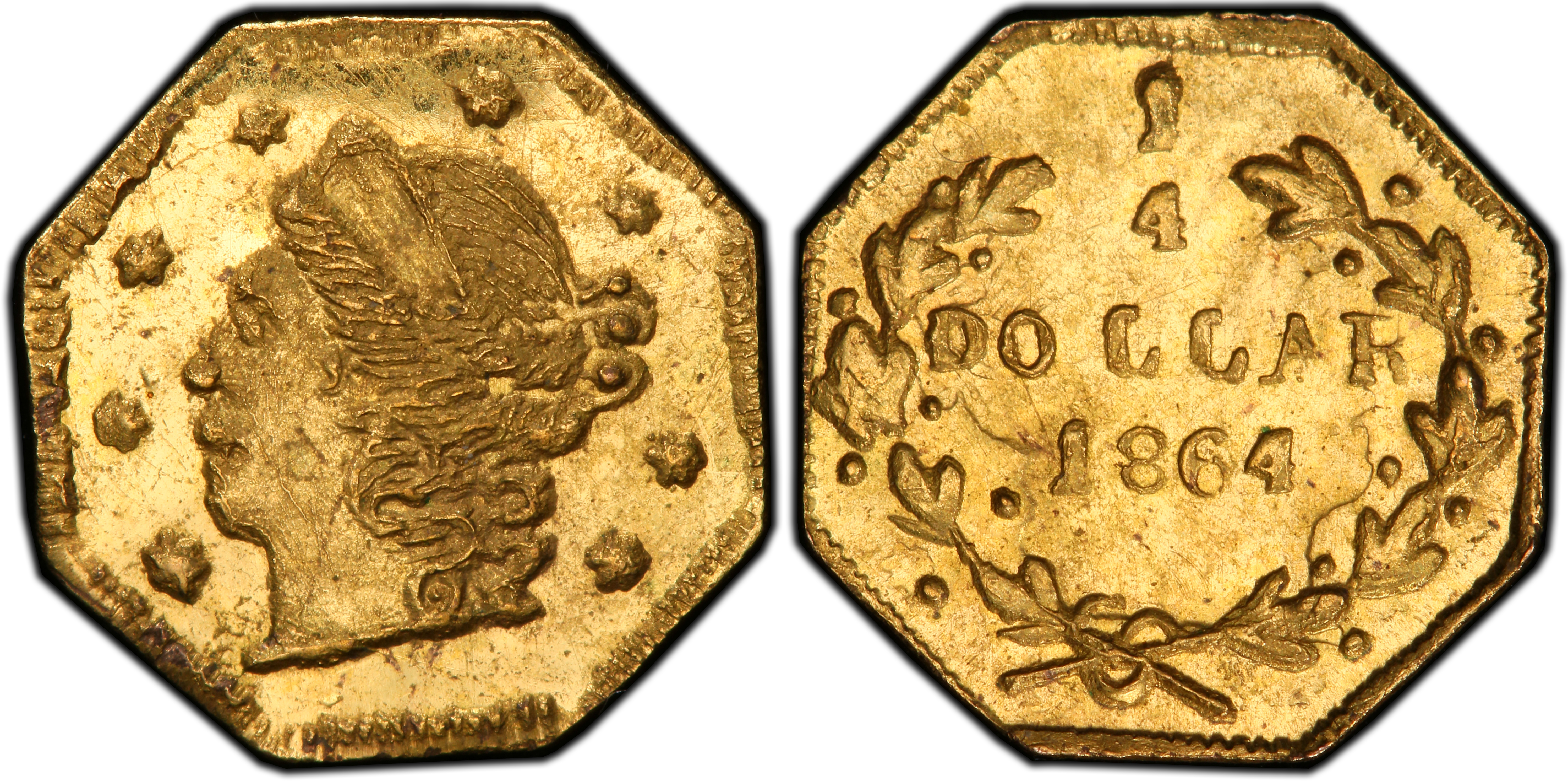 Obverse DescriptionFeatures a crudely rendered, left-facing bust of Liberty. The design is a distinct 'Period Two' style, far removed from the official federal motifs. The field contains a specific arrangement of eight five-pointed stars: one positioned directly in front of Liberty's nose, another near her mouth, and the remaining six arranged around the periphery. Crucially, there are no stars below the bust. The date '1864' is below the truncation of the neck.