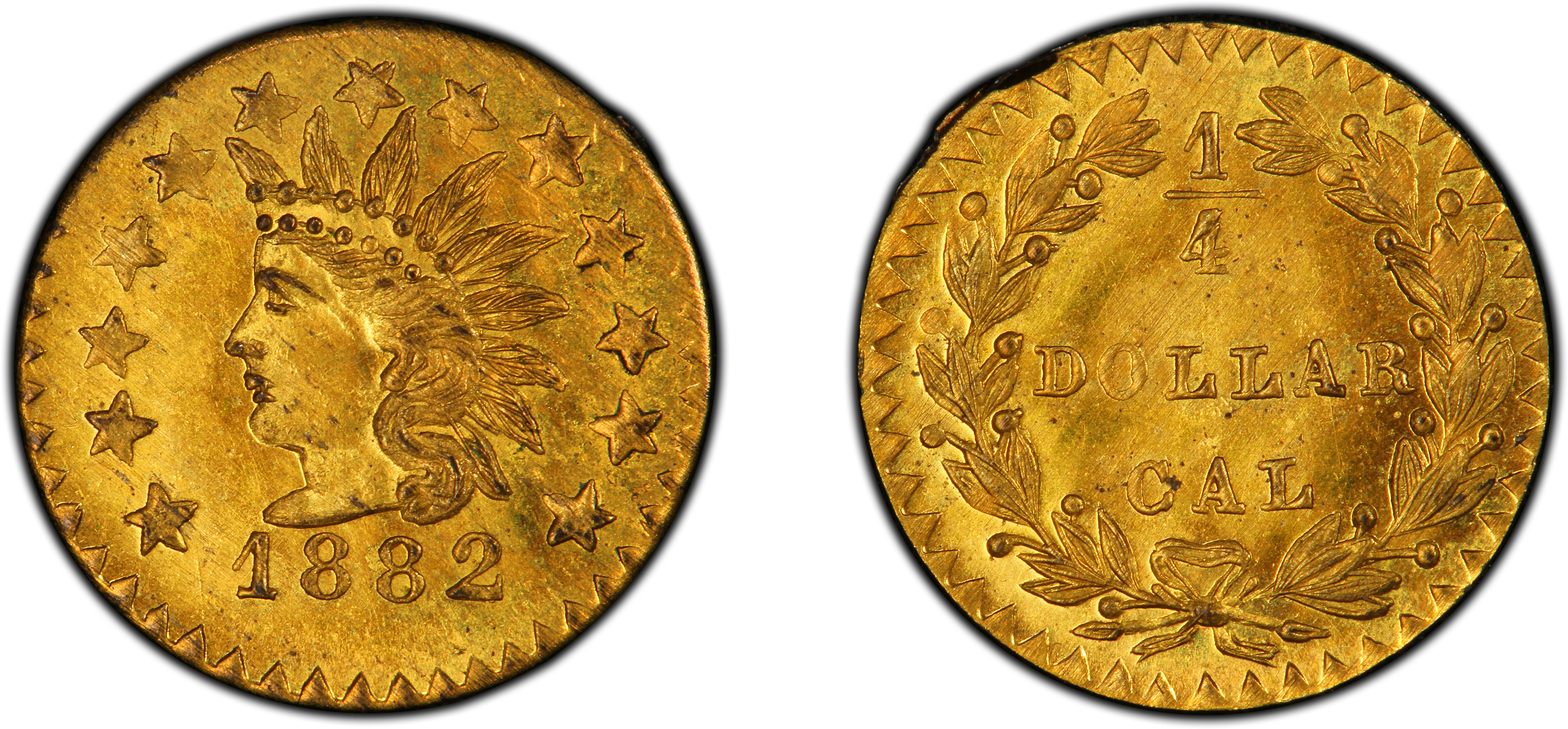 Obverse Inscription Reverse DescriptionThe denomination '1/4' is enclosed within a wreath of leaves. The inscription 'CALIFORNIA GOLD' appears above the wreath, and the date '1882' is below it.