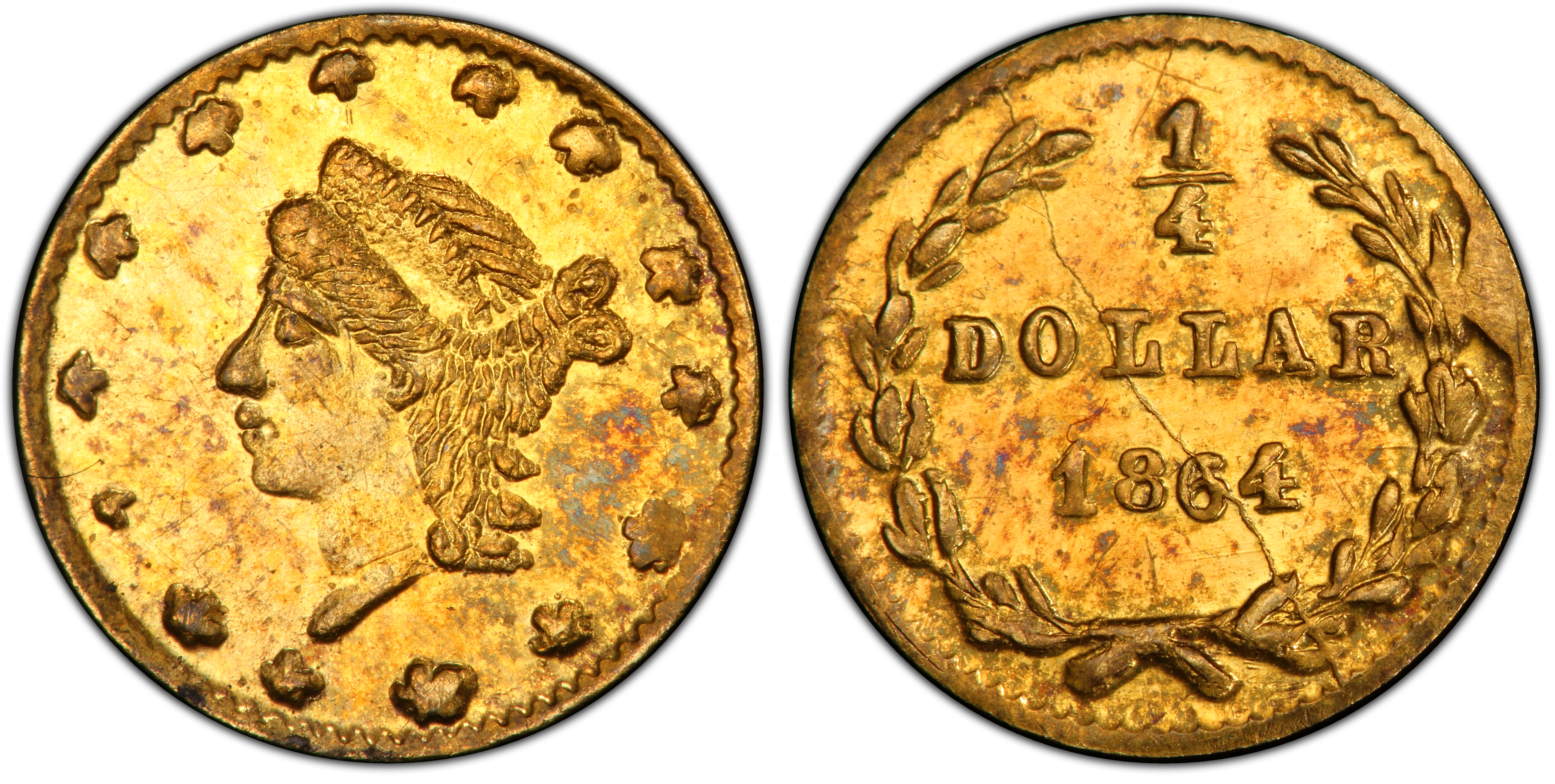 Obverse DescriptionFeatures a Liberty Head portrait facing left, stylistically similar to the contemporary federal gold coinage but of a more simplistic, local execution. The portrait is surrounded by thirteen stars representing the original colonies. The date '1864' is below the bust.