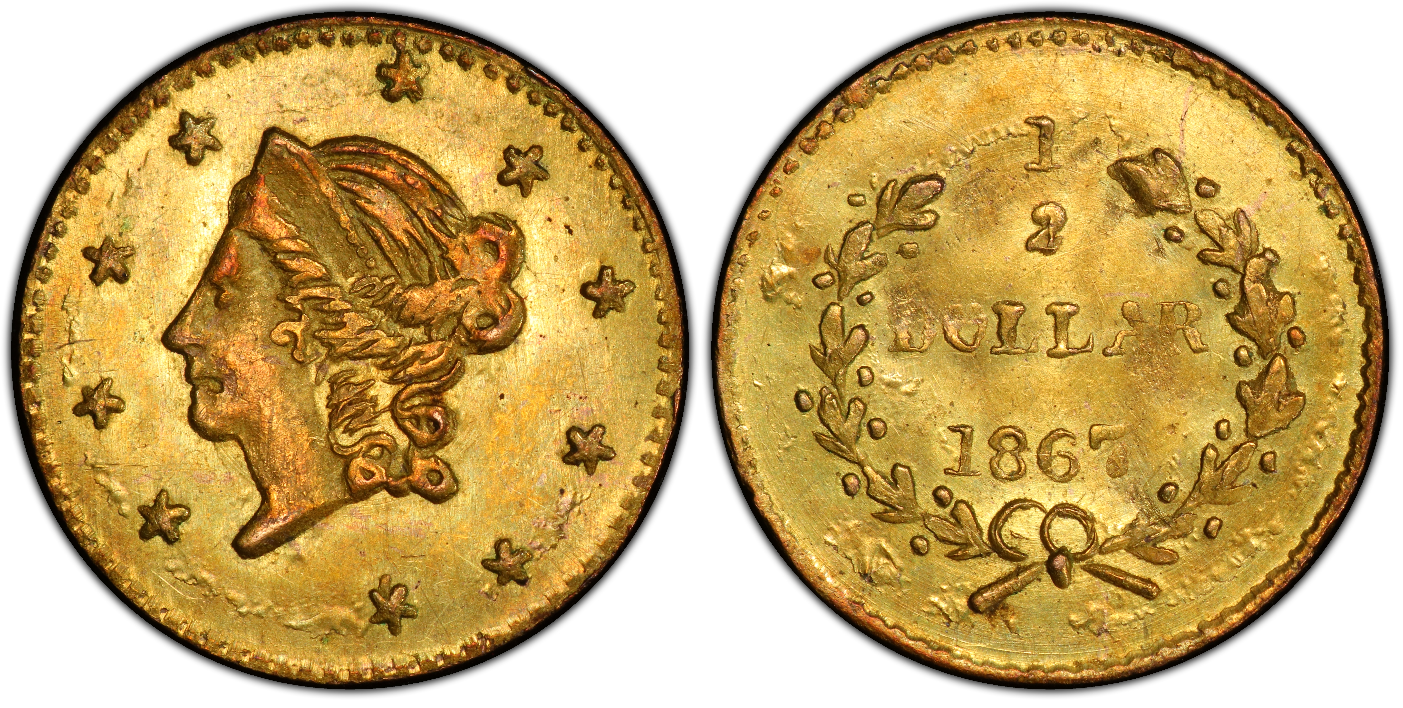 The 1867 BG-1007 fifty-cent piece emerges from the second major phase of California Fractional Gold production, a period numismatists designate as 'Period Two' (1859-1882). Unlike the 'Period One' issues, which were struck out of genuine necessity to alleviate a shortage of small change in the boomtown economy of the 1850s, Period Two pieces were created primarily as souvenirs and jewelry items. By 1867, the San Francisco Mint was in full operation, producing ample quantities of federal silver and gold coinage, which eliminated the commercial need for private issues. However, the allure of California and the Gold Rush had captivated the nation and the world. Jewelers and private minters, particularly in San Francisco, recognized a burgeoning market among tourists, visitors, and those back East who desired a tangible, miniature token of the Golden State's wealth. These 'jeweler's issues' were often intentionally underweight compared to their face value, a fact that was of little concern to purchasers who valued them for their novelty rather than their bullion content. The Private Coinage Act of April 22, 1864, had made the issuance of private coinage illegal, but enforcement by the Secret Service was lax and inconsistent until the early 1880s. This legal gray area allowed producers like Robert B. Gray & Co. to continue minting these denominated tokens throughout the 1860s and 1870s. The BG-1007 is a quintessential example of this era's output: a professionally crafted, yet ultimately commercial, memento. Its existence speaks to a shift in the Californian economy from a raw, frontier-based system to one that was mature enough to support a robust tourism and luxury goods trade. These tiny gold pieces, once essential for buying a drink or a meal, had evolved into charming keepsakes, encapsulating the romantic legend of the Gold Rush for a new generation.