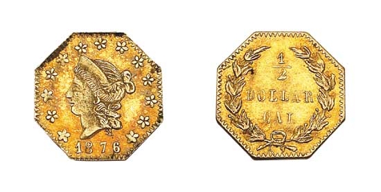 The 1876 G50C BG-932A is a product of the second great era of California Fractional Gold production, a period numismatists classify as 'Period Two' (1859-1882). Unlike the 'Period One' issues, which were struck out of genuine commercial necessity to alleviate a severe shortage of small change during the initial Gold Rush boom, these later pieces were created under a different set of circumstances. By the mid-1870s, the United States Mint in San Francisco was in full operation, and the acute need for privately minted coinage had subsided. However, the allure of California gold and the romance of the Gold Rush had created a robust market for souvenirs and keepsakes. Enterprising jewelers, primarily in San Francisco, stepped in to meet this demand. They began producing vast quantities and varieties of these miniature gold 'coins,' which were sold to locals, tourists, and sent back East as mementos of the Golden State. The legal footing for these pieces was precarious. The Coinage Act of 1864 expressly forbade the private issuance of coinage, but enforcement on the remote West Coast was lax until the early 1880s. Minter-jewelers operated in a grey area, continuing to place denominations on their products. The BG-932A, dated 1876—the year of the nation's Centennial—would have been a particularly popular souvenir. These pieces were not intended to and did not function as circulating currency in the same way their predecessors had; their gold content was often significantly less than their face value would imply, solidifying their status as tokens or charms. The production was crude, often employing a simple hammer-striking method where dies were manually struck onto gold planchets, resulting in inconsistent strike quality and frequent die breaks and clashes, all hallmarks of the series.