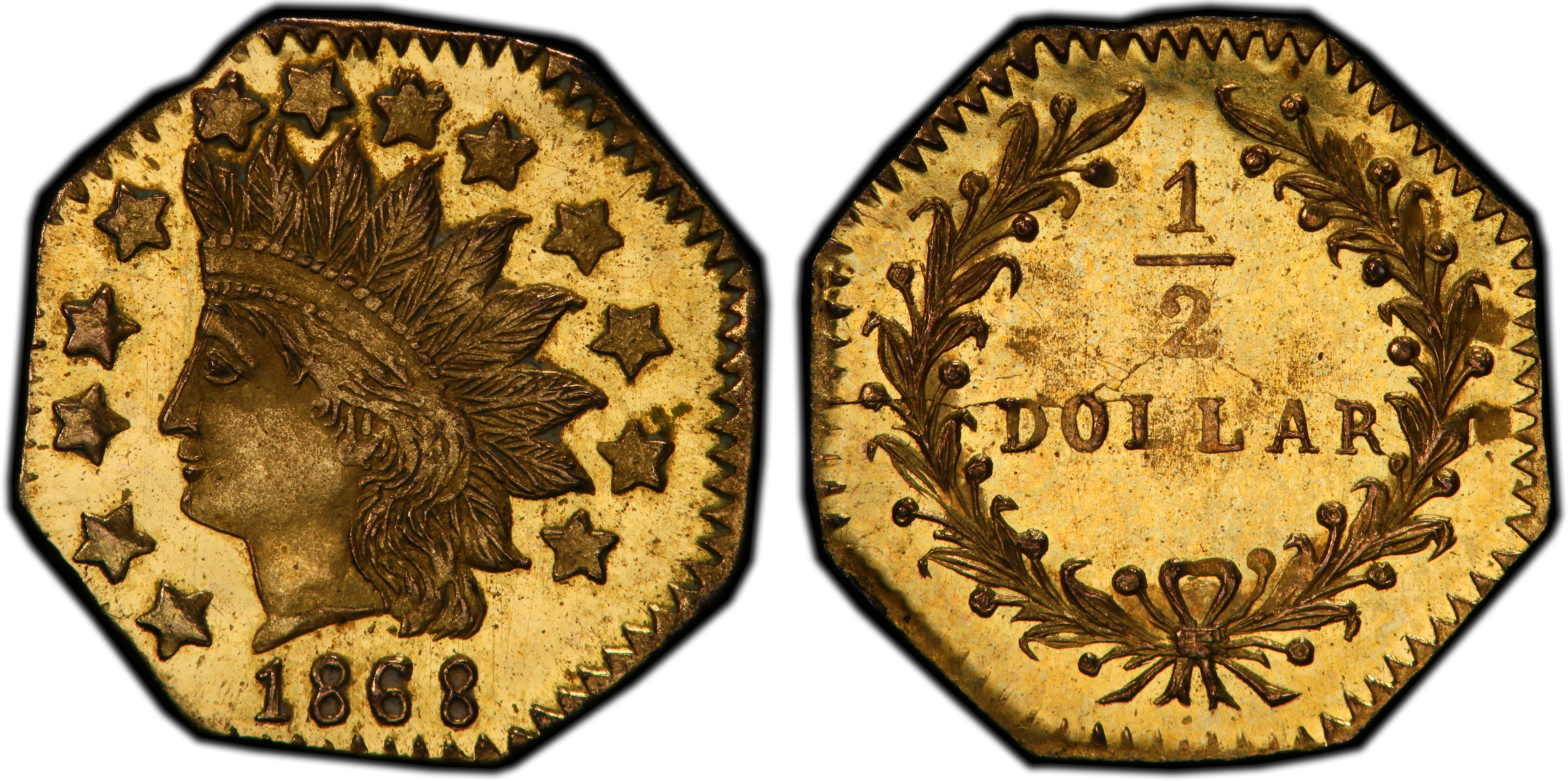 The 1868 BG-961 50 Cents is a product of what numismatists classify as 'Period Two' (1859-1882) of California Fractional Gold production. Unlike the 'Period One' issues (1852-1857), which were struck out of a genuine commercial need to alleviate a severe shortage of small change during the initial Gold Rush, the Period Two pieces emerged in a different economic landscape. By the late 1850s and into the 1860s, the San Francisco Mint was in full operation, producing ample quantities of federal silver and gold coinage, effectively satisfying the region's transactional needs. The rationale for striking private fractional gold had thus shifted dramatically. The continued production by various jewelers and private minters in San Francisco was no longer for circulation but to cater to a burgeoning souvenir and novelty market. These miniature gold pieces became popular keepsakes for tourists, mementos of the Gold Rush, and items to be mounted into jewelry. The Act of 1864 had prohibited private coinage, but enforcement was lax, allowing these 'jeweler's issues' to be produced for years, often with pre-dated dies to circumvent the law. The BG-961, dated 1868, is a quintessential example of this era. It was not intended to pass from hand to hand in saloons or general stores; rather, it was a finely crafted miniature sold as a charming curiosity. Its high rarity today (R-7) suggests an extremely small original production run, typical of these specialized, non-circulating issues. Their gold content was often less than their face value would imply, further cementing their status as tokens rather than true coinage. Today, these pieces are highly prized by collectors not for their role in commerce, but as rare artifacts representing the transition of California from a frontier economy to a place of myth, tourism, and remembrance.