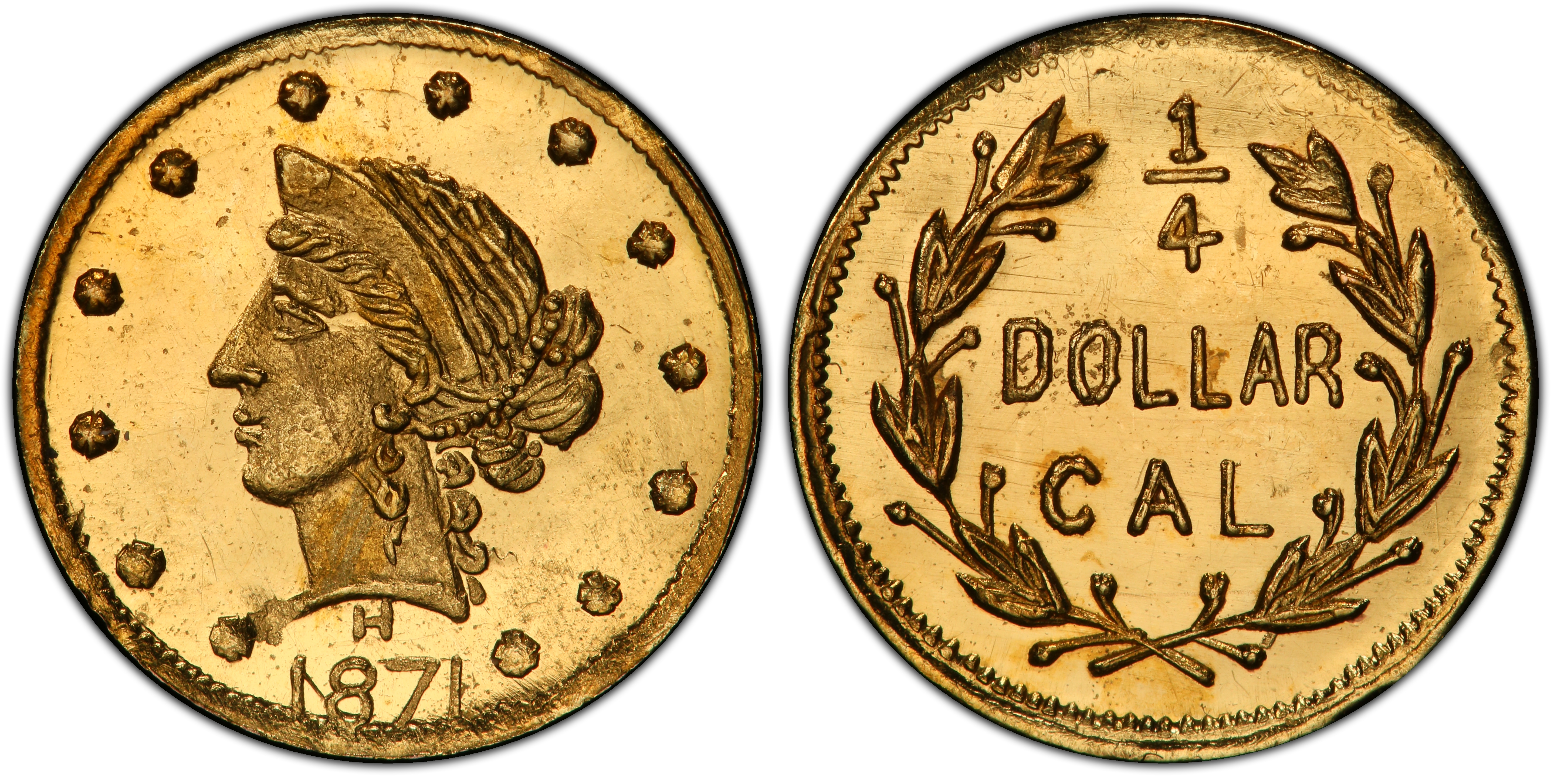 The 1871-H 25 Cents, cataloged as Breen-Gillio 860, is a quintessential example of a 'Period Two' California Fractional Gold piece. Unlike their 'Period One' predecessors (1852-1857), which were struck to alleviate a severe shortage of small-denomination coinage and are believed to have circulated, the Period Two issues were created primarily as souvenirs and for use in jewelry. By the 1870s, the San Francisco Mint was producing ample federal coinage, rendering private issues unnecessary for commerce. However, the romance of the Gold Rush, still fresh in the public's memory, created a robust market for miniature gold tokens that recalled the heady days of '49. Jewelers and private minters like Hermann Hammer, identified by the 'H' mintmark on this variety, stepped in to meet this demand. These pieces were produced in a legally ambiguous environment. The Coinage Act of 1864 had made private coinage illegal, but federal enforcement by the Secret Service was lax in California until the early 1880s. This allowed minters to continue striking denominated pieces ('25 CENTS') without immediate legal consequence. The BG-860 was struck on a thin, round gold planchet, typical of these later issues, which contained significantly less than their face value in gold. Their purpose was not monetary but sentimental; they were sold to tourists, given as gifts, and mounted into rings, cufflinks, and watch fobs. The craftsmanship, while often charming, was secondary to the novelty. The fact that this variety is designated R-6 indicates a very small original production, likely numbering in the mere hundreds, with only a tiny fraction surviving today. Its numismatic significance lies not in its economic impact, but in its role as a tangible artifact of California's post-Gold Rush cultural identity, representing the commercialization of the state's mythic origins.