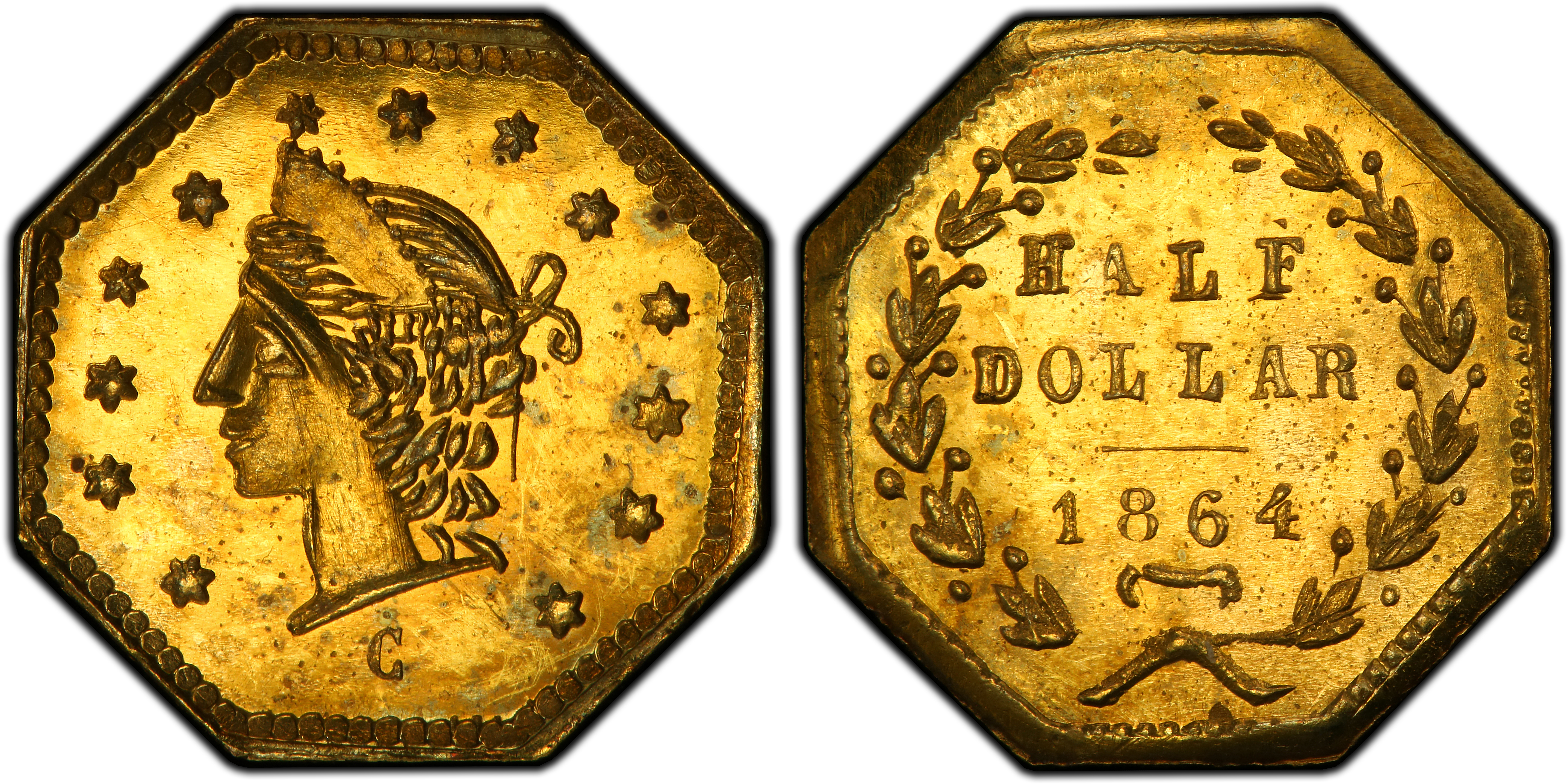The 1864 Octagonal 50 Cents, cataloged as Breen-Gillio 918, is a quintessential artifact from the second phase of California's private gold coinage history. This period, designated by numismatists as 'Period Two' (1859-1882) or the 'Suppressed Jewelers' Issues,' saw a shift in the purpose and nature of these fascinating fractional gold pieces. The initial wave of 'Period One' issues (1852-1857) was born of pure necessity, created to alleviate a severe shortage of small-denomination coinage for daily commerce in the gold fields. However, by the late 1850s, the San Francisco Mint was in full operation, and the acute need for fractional currency had subsided. Entrepreneurs, primarily jewelers like Robert B. Gray, recognized a new market: the booming demand for souvenirs and keepsakes from the romanticized California Gold Rush. These later issues, while still potentially used in local transactions, were primarily intended for sale to tourists and for export to the East Coast and Europe as tangible mementos of the Golden State. The year 1864 is profoundly significant. Struck in the midst of the American Civil War, this piece represents a fascinating intersection of national crisis and regional economic evolution. While the nation was preoccupied with war, California's economy continued to thrive, and the allure of its gold was undiminished. Critically, 1864 also saw the passage of the Coinage Act of April 22, which expressly forbade the private minting of coinage. This federal action legally rendered pieces like the BG-918 unauthorized, transforming them from legitimate private tokens into illicit issues overnight. Despite this, production by jewelers continued for nearly two more decades, often with anachronistic dates to circumvent the law, a testament to their popularity and the lax enforcement on the distant West Coast. The manufacturing process was rudimentary; most fractional gold was produced by the 'hammer method,' where a planchet was placed on an anvil die and struck with a sledgehammer-wielded punch die. This crude technique resulted in inconsistent strike quality, often leaving coins with weakness in some areas and pronounced detail in others, a characteristic that defines the series.
