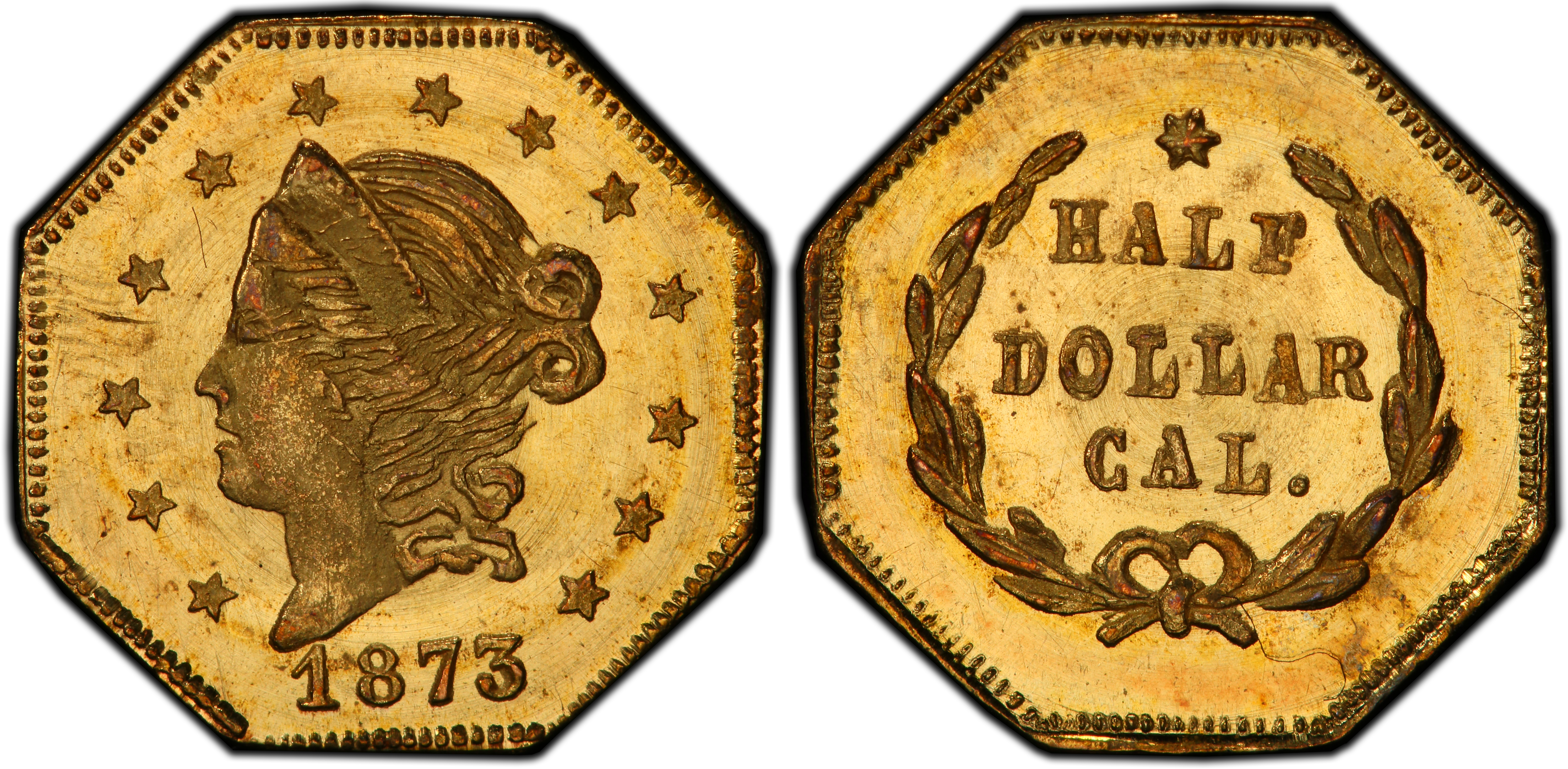 The 1873 Octagonal 50 Cents, cataloged as Breen-Gillio 915, is a quintessential example of a 'Period Two' California Fractional Gold piece. Unlike their 'Period One' (1852-1857) predecessors which were struck to alleviate a critical shortage of small change during the initial frenzy of the Gold Rush, the Period Two issues were created under vastly different circumstances. By the 1870s, the San Francisco Mint was in full operation, supplying the region with ample federal coinage. The acute need for privately minted currency had vanished. Instead, a thriving tourism and souvenir market had emerged. California, and particularly San Francisco, was a destination of immense romantic appeal to Easterners and Europeans, a land of gold and adventure. Enterprising jewelers, many of French origin, recognized this demand and began producing small, attractive gold tokens reminiscent of the earlier, functional issues. These 'jeweler's issues' were not intended for circulation but were sold as keepsakes, charms, and mementos of a visit to the Golden State. They were often intentionally underweight and of varying fineness, their value derived from their novelty rather than their intrinsic metal content. The Coinage Act of 1864 had made private coinage illegal, but the law was not strictly enforced by the Secret Service against these small souvenir pieces until the early 1880s. This legal gray area allowed for their production for over two decades. The BG-915, with its classic Liberty Head design, directly evoked the imagery of federal gold coinage, enhancing its appeal as a miniature treasure. It represents a fascinating transition in private minting: from a utilitarian response to economic necessity to a commercial enterprise catering to a burgeoning tourist trade and the public's fascination with the lingering mystique of the Gold Rush.
