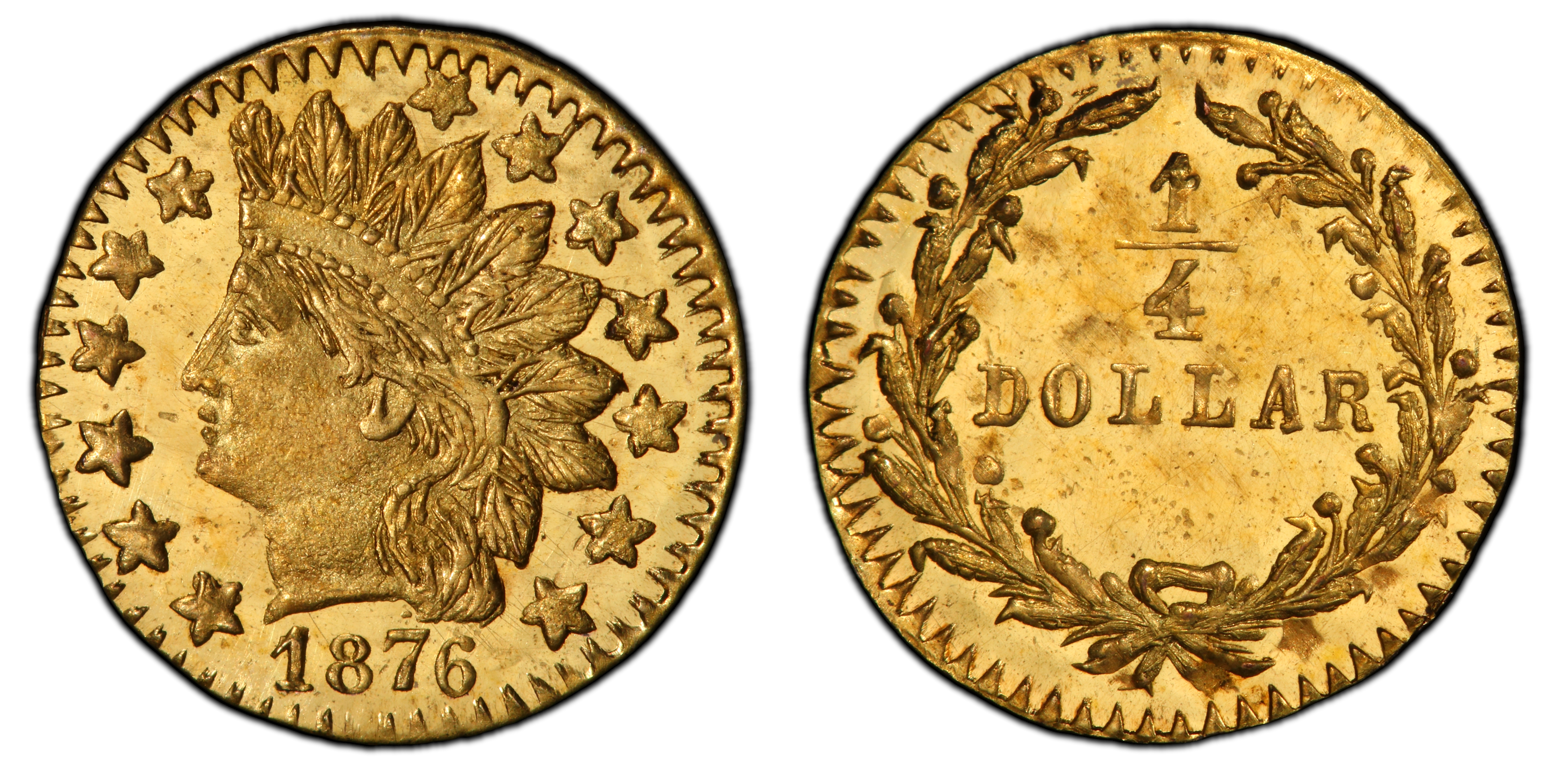 Reverse DescriptionThe denomination '1/4' is centered within an ornate wreath of leaves and berries. The date '1876' is positioned below the wreath, and the inscription 'CALIFORNIA GOLD' appears above it along the upper rim.