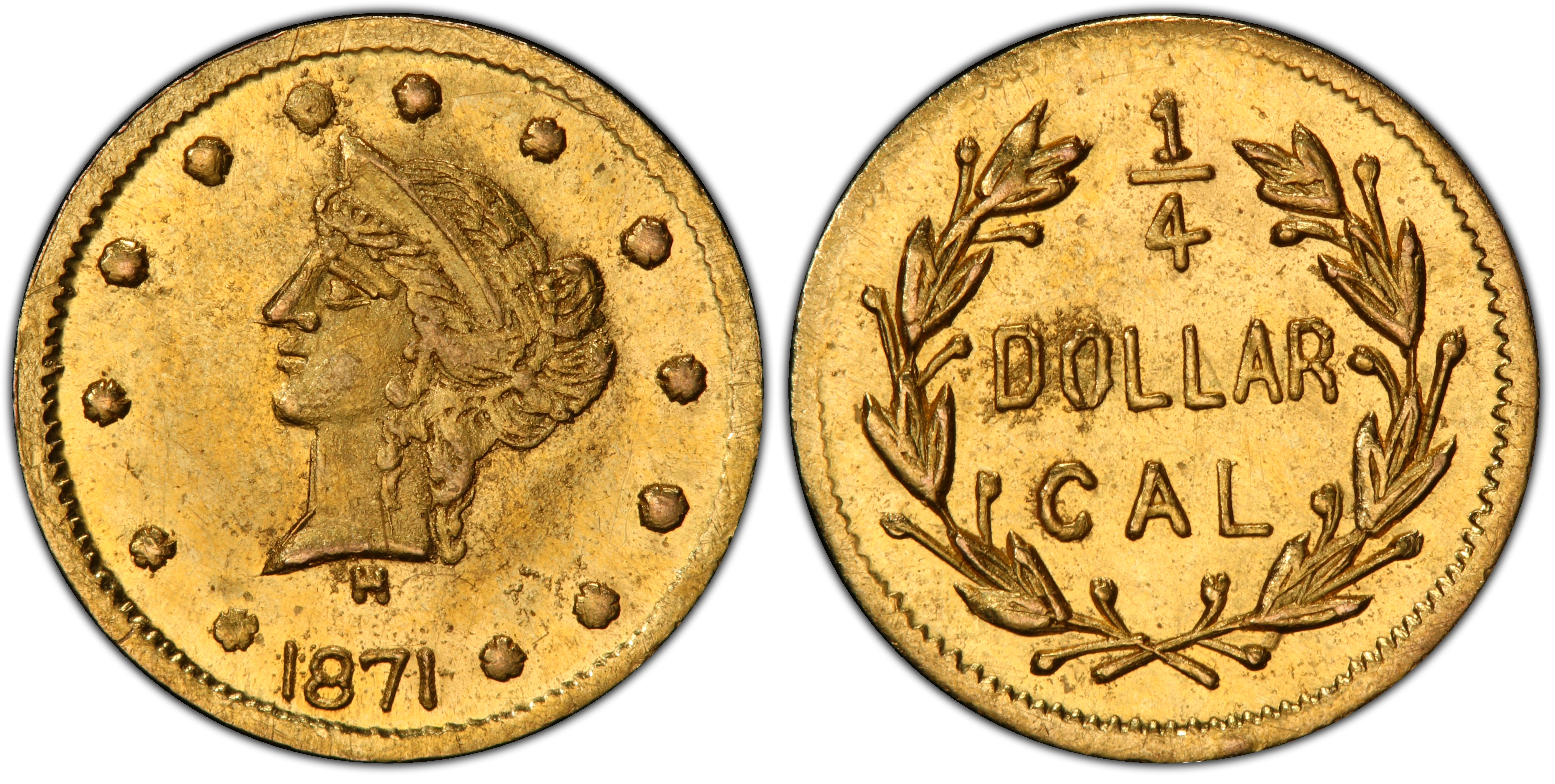 The 1871 BG-857 25-cent piece represents a fascinating and legally fraught chapter in the history of U.S. private coinage. By the 1870s, the initial chaos of the California Gold Rush had subsided, but the need for small-denomination coinage persisted, particularly in the West. The Coinage Act of 1864 had explicitly forbidden the private issuance of any coins, a direct response to the flood of lightweight and debased private tokens that emerged during the Civil War. Despite this federal prohibition, various jewelers and entrepreneurs continued to strike minuscule gold 'charms' or 'tokens,' often resembling official coinage, to satisfy a commercial and souvenir demand. Reuben N. Hershfield and Noah Mitchell, jewelers operating far from the gold fields in Leavenworth, Kansas, entered this market in 1871. Their plan was to produce fractional gold pieces for distribution in the coinage-starved markets of California. Their operation was distinguished by the small 'H' initial for Hershfield placed discreetly below the bust of Liberty. However, their enterprise was short-lived. In August 1871, U.S. Secret Service agents, tasked with enforcing the 1864 Act, raided their facility, seizing their production and arresting the partners. This abrupt end to their minting activities makes the BG-857 a one-year type issue and infuses it with a dramatic backstory of defiance against federal law. The coins are technically not 'territorials' in the traditional sense, as they were not a product of a pre-statehood region lacking federal mint services, but rather a clandestine issue produced in direct violation of established law, making them numismatically significant as among the last of the classic privately issued gold coin series.