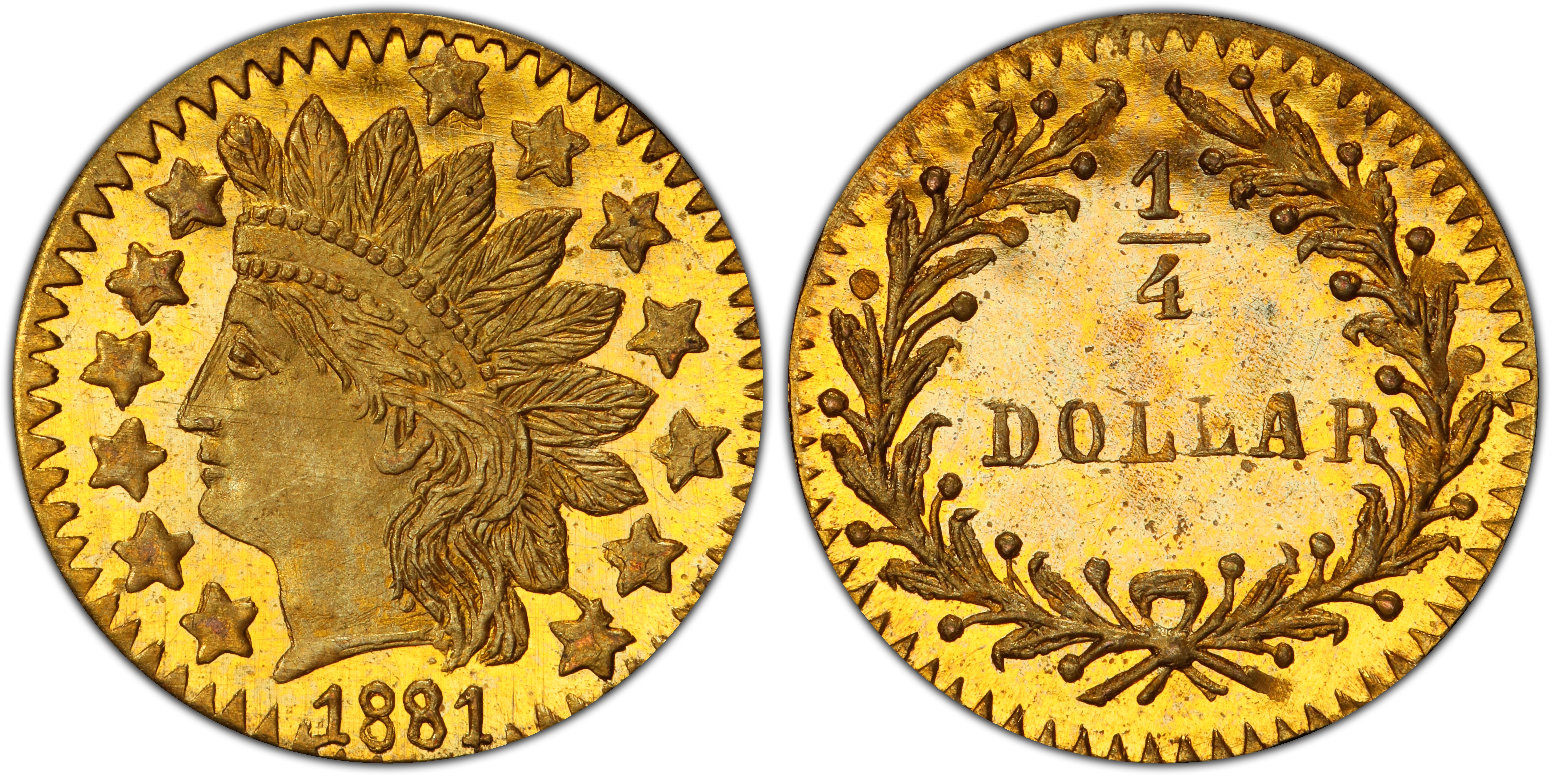 Reverse DescriptionThe denomination '1/4' is enclosed within a wreath of leaves and berries. The wreath is open at the top, and the date '1881' is positioned directly below the opening, above the fraction. The inscription 'CALIFORNIA GOLD' encircles the lower portion of the wreath.