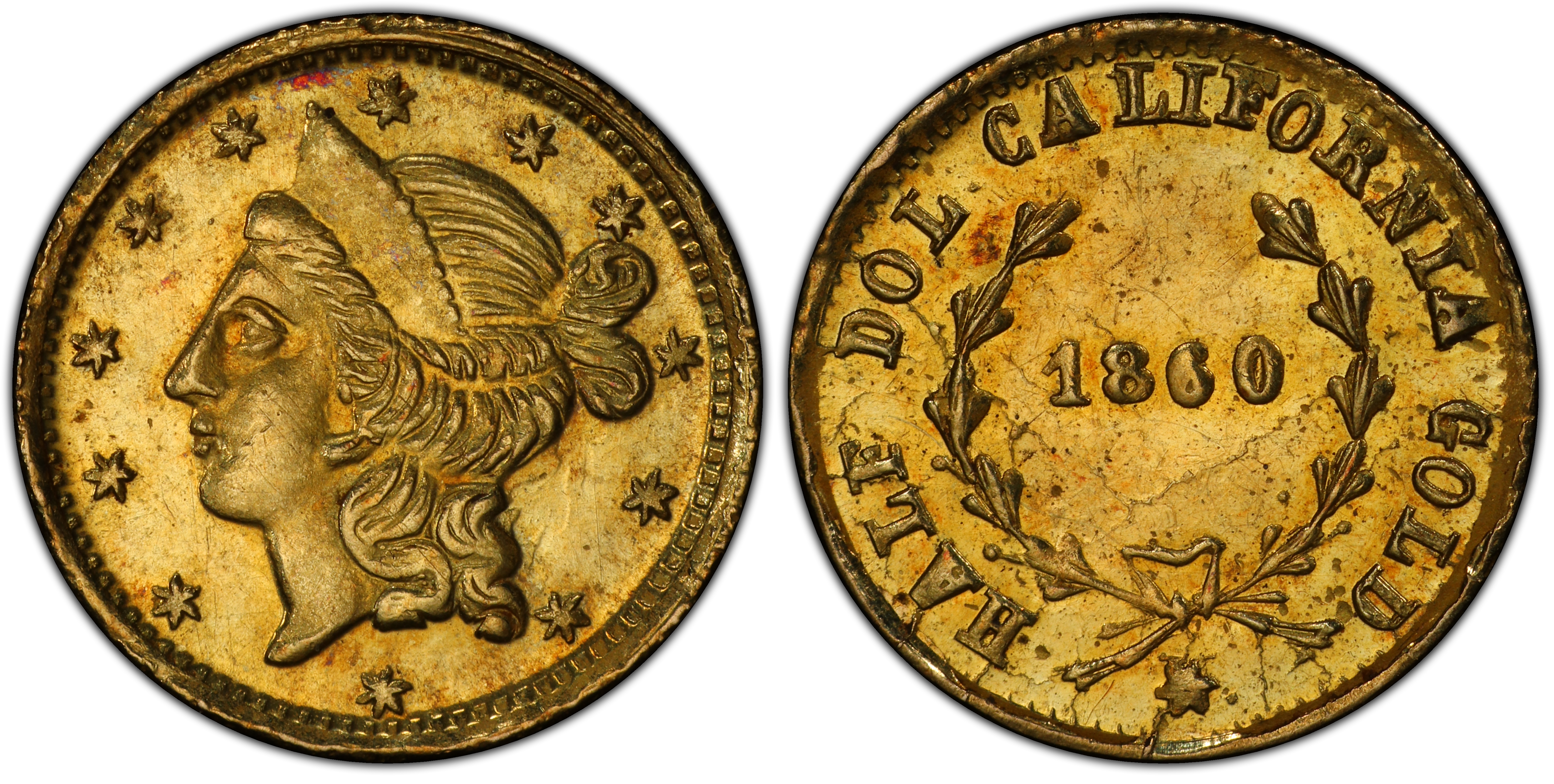 Obverse DescriptionA fairly crude Liberty Head facing left, reminiscent of the official U.S. gold coinage but stylistically distinct. The portrait is surrounded by thirteen five-pointed stars. The date '1860' is below the bust. Diagnostic for this variety is the clear '0' punched over the final digit of an earlier date, '6', creating the 1860/56 overdate.