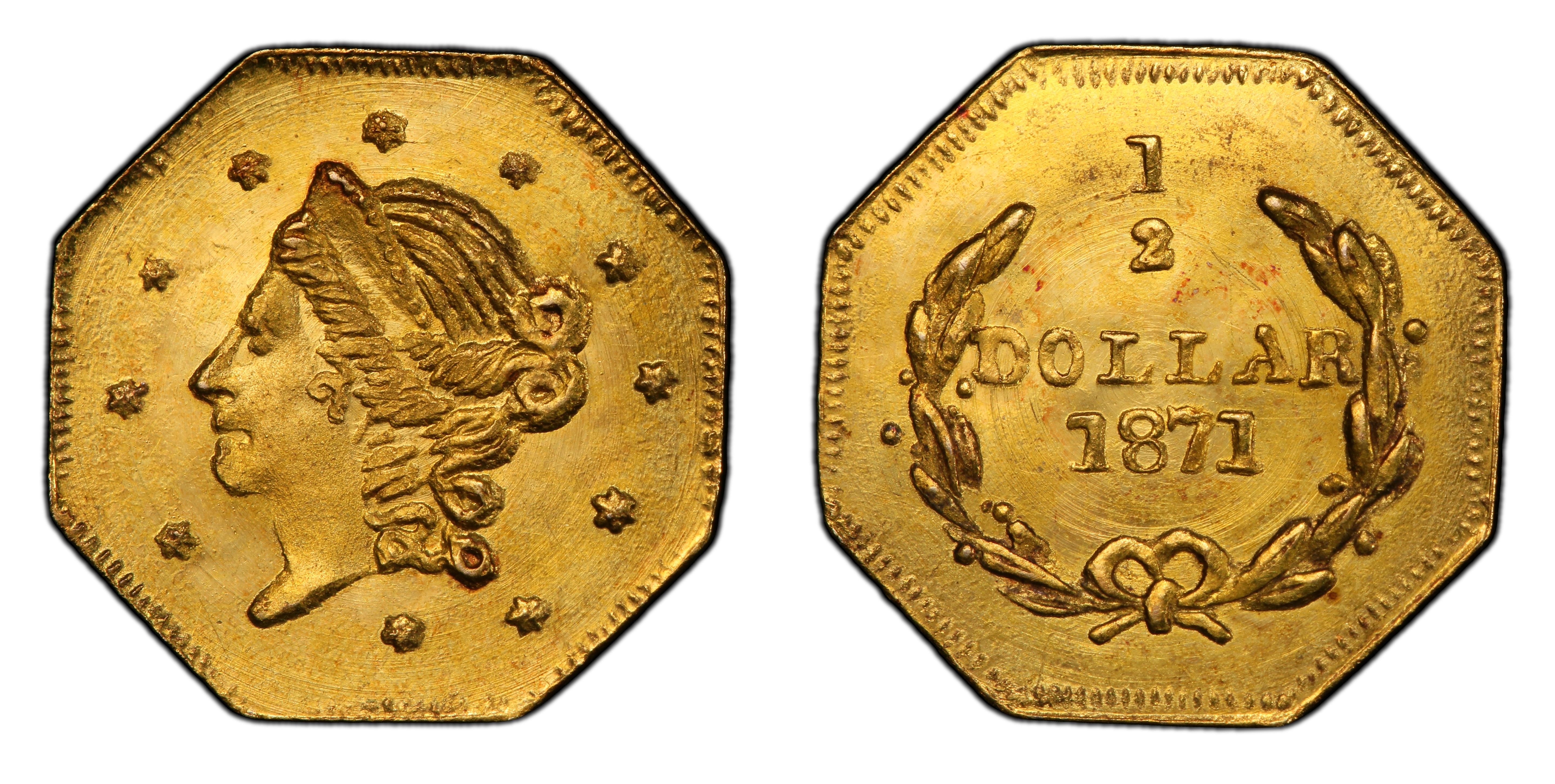 Obverse DescriptionA classic Liberty Head design, facing left, closely modeled on the federal gold coinage of the era. The portrait is surrounded by thirteen stars, representing the original colonies. The date, 1871, is positioned below the truncation of the neck.