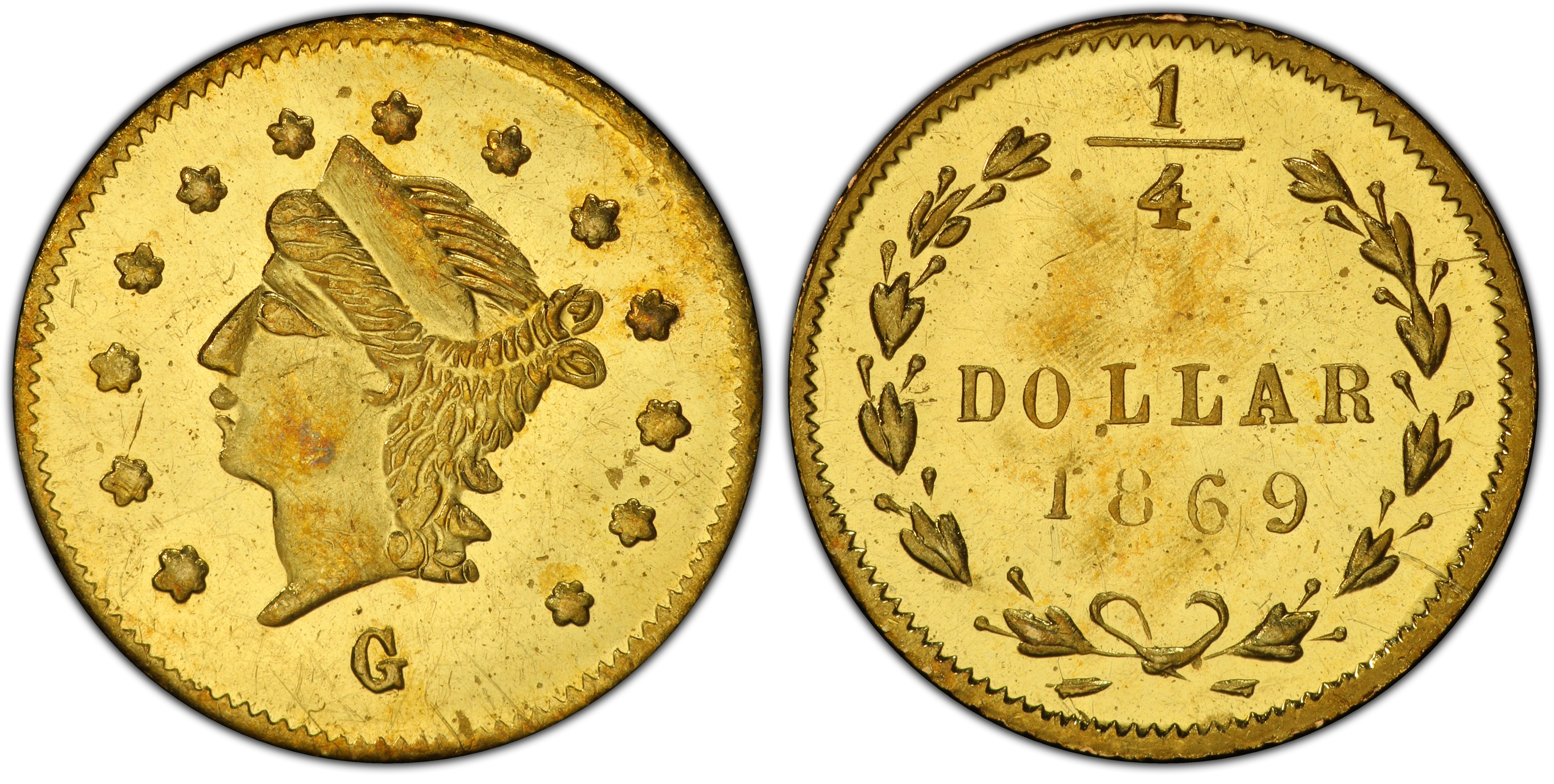 The 1869 BG-826 25 Cents is a quintessential example of a 'Period Two' California Fractional Gold piece, a series cataloged exhaustively by Walter Breen and Ronald J. Gillio. Unlike the 'Period One' issues (1852-1857), which were struck with a genuine, albeit limited, commercial purpose to alleviate the chronic shortage of small change during the initial Gold Rush, the Period Two pieces (1859-1882) served a different function. By 1869, the San Francisco Mint was in full operation, supplying the region with ample federal coinage. The raison d'ĂȘtre for these later, smaller gold pieces shifted from commerce to curiosity. They were primarily manufactured by jewelers and novelty makers as souvenirs, keepsakes, and jewelry items, capitalizing on the romantic allure of the California Gold Rush that still captivated the nation. The passage of the Private Coinage Act of 1864 had made such private issues illegal, but enforcement was lax, and the public appetite for these charming miniatures ensured their continued, if clandestine, production. These 'suppressed jewelers' issues,' as Breen and Gillio termed them, were often intentionally underweight and of a lower fineness than their stated denomination would imply, confirming their status as tokens rather than true coinage. The BG-826, attributed to the hand of die-sinker Robert Gray, is a product of this environment. It was likely struck in a small San Francisco workshop, using a screw press or even a simpler hammer method, producing coins for sale to locals and tourists. The 'PL' or Prooflike designation on some specimens indicates that they were struck using highly polished dies on polished planchets, resulting in a mirrored finish intended to appeal directly to the collector and souvenir market. These pieces never truly circulated; their existence is a testament to the popular mythology of the Gold Rush and the entrepreneurial spirit of the jewelers who met the demand for its tangible symbols.
