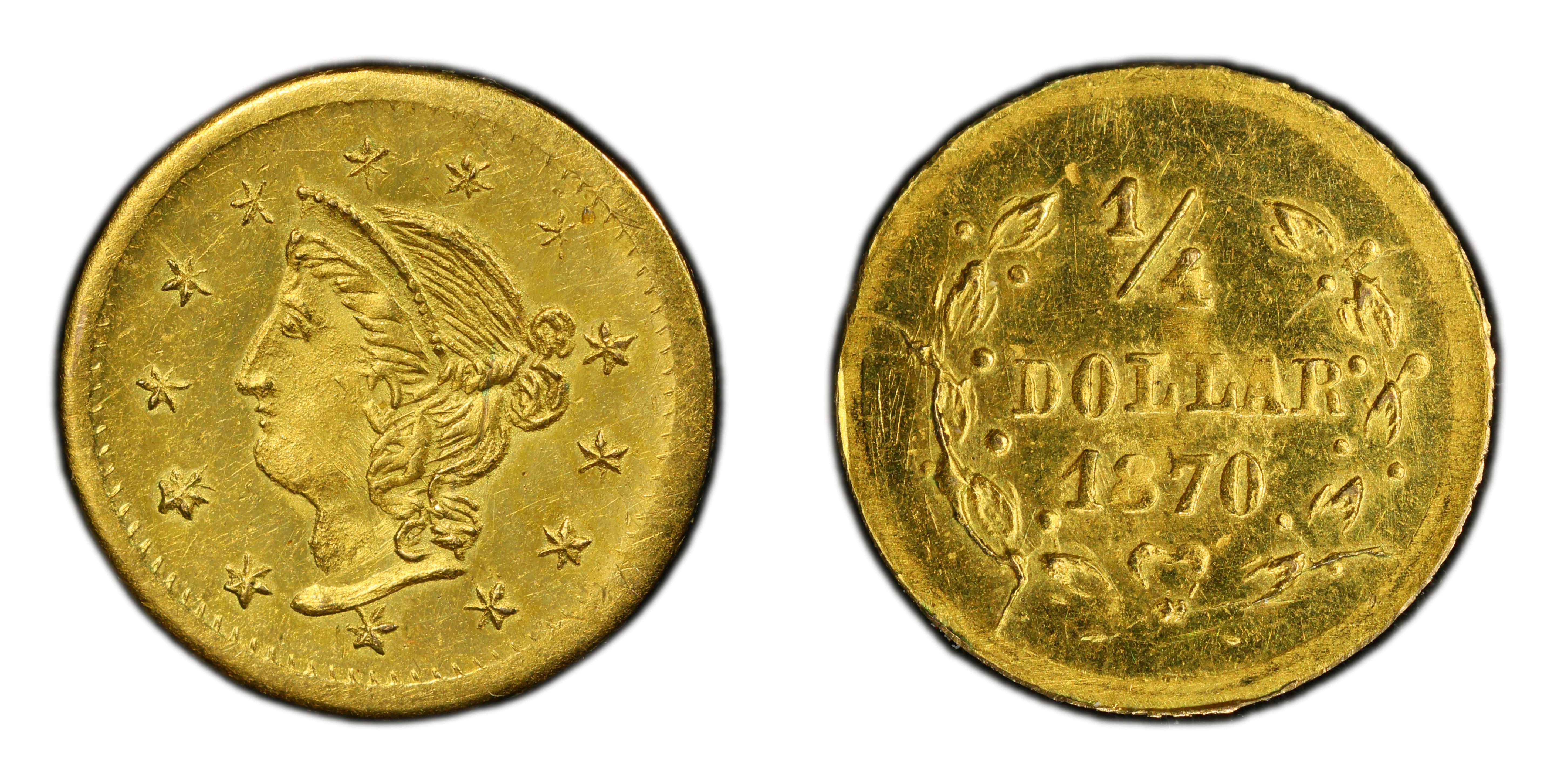 Reverse DescriptionThe denomination '1/4' is positioned in the center, surrounded by an ornate wreath of leaves and berries tied with a bow at the bottom. The date '1870' is located below the bow, and the legend 'DOLLAR' is situated above the wreath.