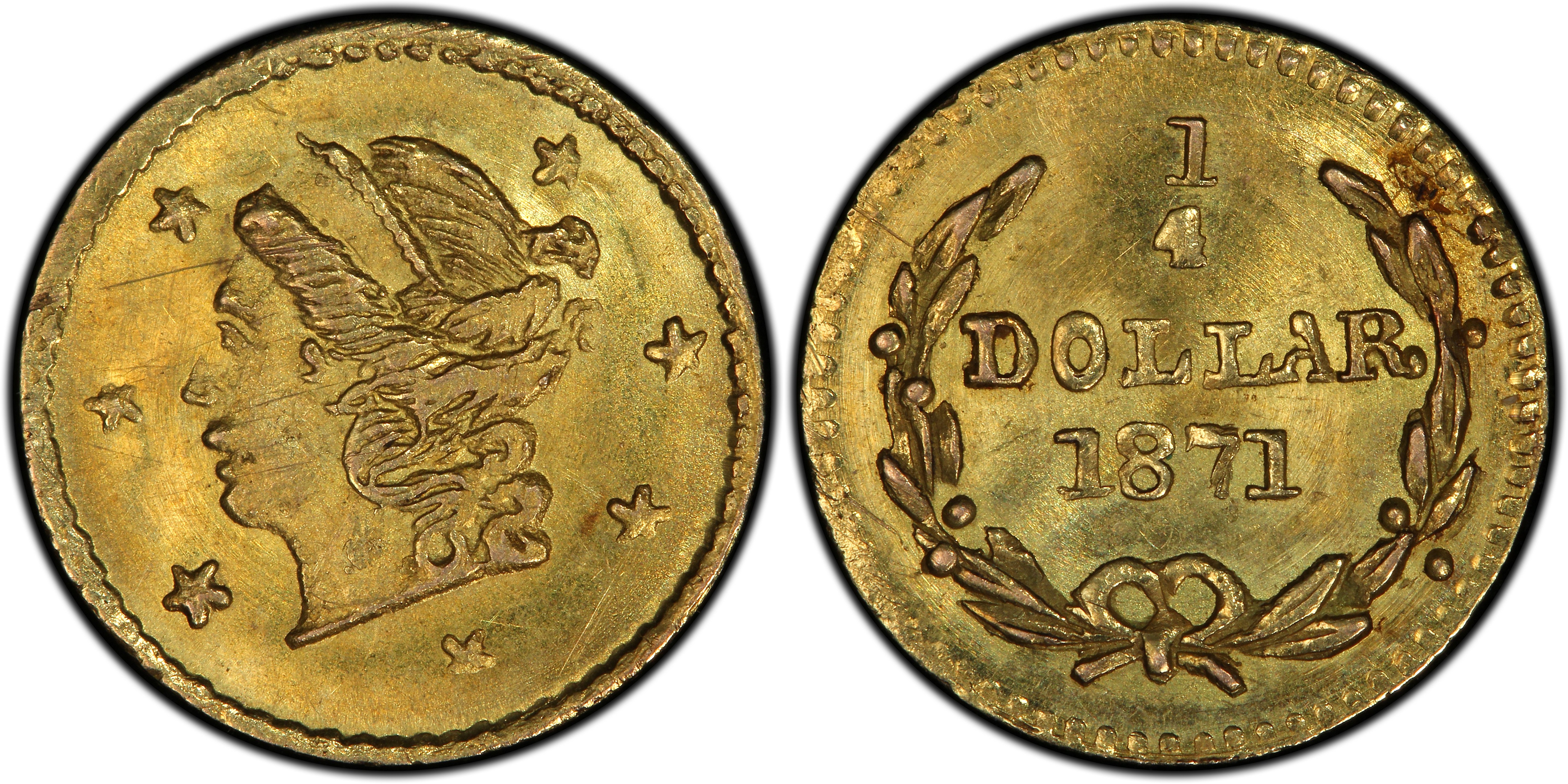 The 1871 25 Cents, cataloged as Breen-Gillio 810, is a quintessential example of a 'Period Two' California Fractional Gold piece. This era, spanning from 1859 to 1882, saw a significant shift in the purpose and nature of these diminutive coins. The initial wave of 'Period One' issues (1852-1856) arose from a genuine and desperate need for small-denomination currency in the gold fields, where federal coinage was scarce and transactions were often conducted with cumbersome gold dust. By the 1870s, however, the economic landscape of California had matured. The U.S. Mint in San Francisco was in full operation, and the acute shortage of small change had largely subsided. Consequently, the production of fractional gold transitioned from a necessity of commerce to a commercial enterprise in its own right, primarily driven by jewelers who catered to a burgeoning tourist trade and a local appetite for novelty items and keepsakes. These 'jeweler's issues' were often lighter and of lower fineness than their Period One predecessors, valued more for their charm and connection to the Gold Rush romance than their intrinsic metallic worth. The BG-810 was struck within this context. While the specific maker is not definitively known, it was almost certainly produced by one of the many skilled jewelers and die-sinkers operating in San Francisco, such as Robert B. Gray & Co. or their contemporaries, who created a wide array of similar Liberty Head designs. The Coinage Act of 1864 had technically outlawed private coinage, but enforcement was lax until the early 1880s, allowing this cottage industry to persist. These tiny gold pieces were sold as souvenirs, pocket pieces, and adornments, tangible mementos of California's golden identity. Their survival rate is exceptionally low; their minuscule size made them easy to lose, and many were likely spent or incorporated into jewelry over the decades, making any surviving example a rare link to this unique chapter in American numismatic history.