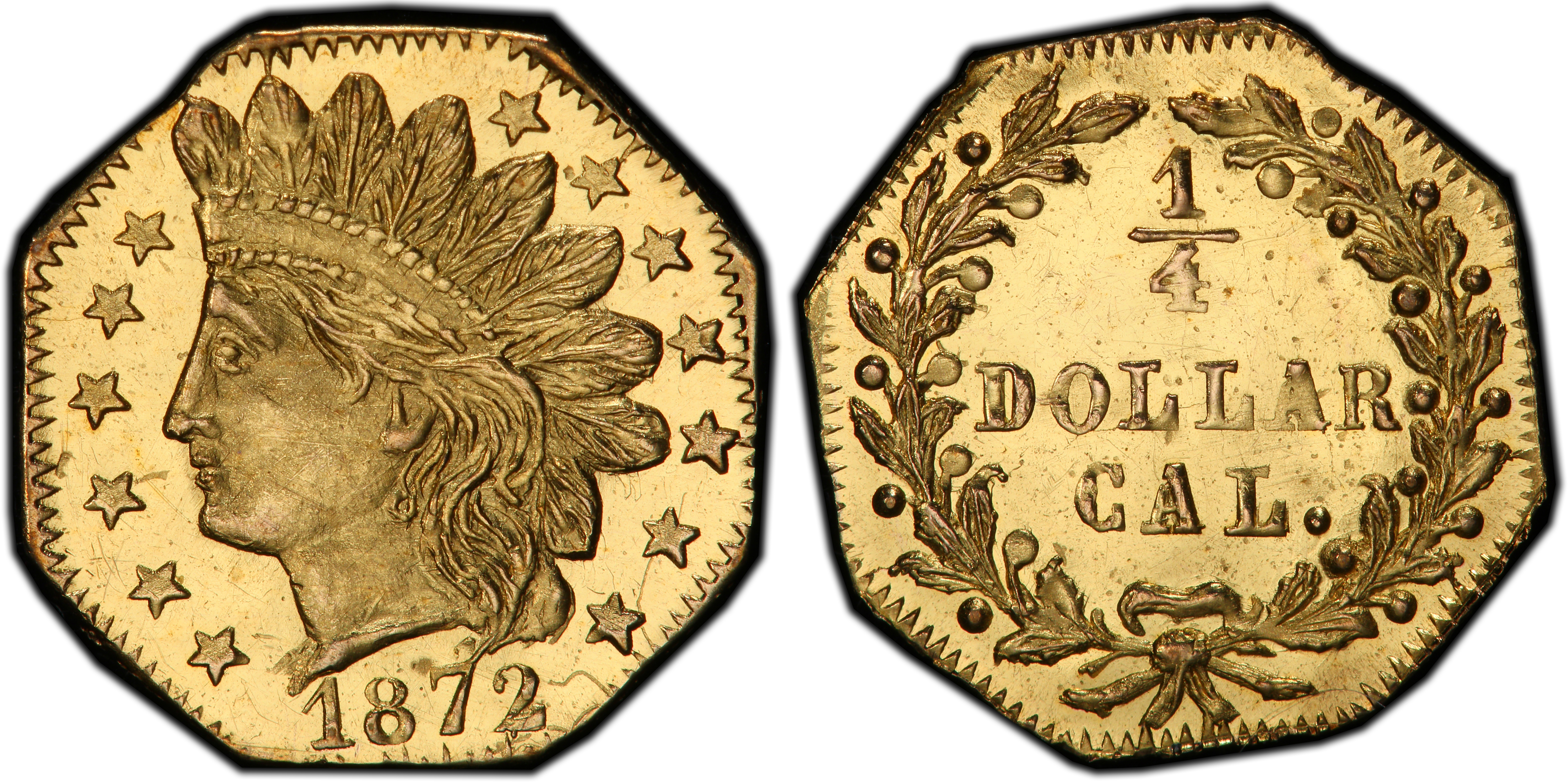 The 1872 G25C BG-791 octagonal 25-cent piece emerges from the second major phase of California's private gold coinage, a period defined more by commercial artistry and the burgeoning souvenir trade than the urgent monetary necessity that characterized the initial Gold Rush years. By the 1870s, the acute shortage of small change that had plagued California in the early 1850s had been largely resolved by the output of the official San Francisco Mint, which began operations in 1854. However, the allure of gold and the romance of the '49er era persisted, creating a robust market for gold novelties. Private minters, many of whom were skilled jewelers and engravers, transitioned from producing quasi-circulating currency to creating beautifully crafted, low-denomination gold pieces for tourists, merchants, and those wishing to send a piece of California's golden dream back East. These 'Period Two' issues (1859-1882) were typically underweight for their face value, functioning as tokens or keepsakes rather than true coinage. Their production existed in a legal gray area following the Coinage Act of 1864, which banned private coinage. However, the law was not strictly enforced against these small-denomination pieces until the Secret Service launched a major crackdown in 1883. The BG-791, attributed to jeweler Christopher Ferdinand Mohrig, is a prime example of this era's output. Struck with precision and an artistic flair uncommon in the earlier, cruder issues, these pieces were designed for aesthetic appeal. Their octagonal shape was a deliberate nod to the massive, iconic $50 'slugs' issued by the U.S. Assay Office in the early 1850s, linking them directly to the most famous symbols of Gold Rush wealth. Though they never meaningfully circulated as money, they tell a crucial story about California's evolving economy and its burgeoning identity as a destination, where the memory of the Gold Rush was itself a valuable commodity.
