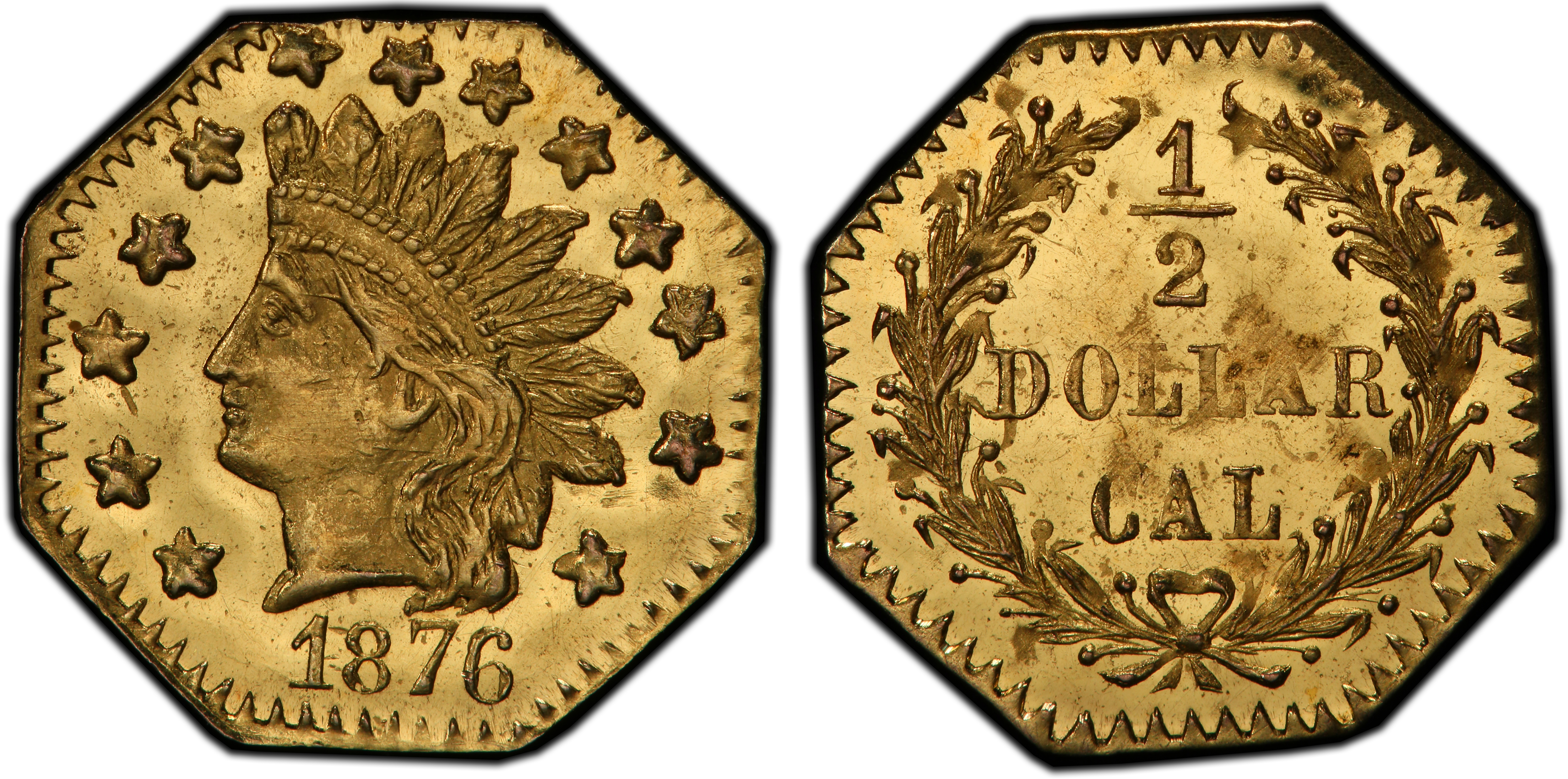 The 1876 BG-950 50 Cents is a quintessential example of a 'Period Two' California Fractional Gold piece. These small-denomination coins were born out of the chaos and opportunity of the California Gold Rush. The initial influx of over 300,000 people to California created booming economies but also a severe shortage of circulating small change. Gold dust, the primary medium of exchange, was imprecise and inconvenient for everyday transactions. To fill this numismatic void, private jewelers and metallurgists began striking their own coins in 25 cent, 50 cent, and one dollar denominations starting in 1852. These 'Period One' (1852-1857) issues were utilitarian and intended for circulation, supplementing the scant supply of federal coinage. However, by the time the BG-950 was struck in 1876, the landscape had changed dramatically. The San Francisco Mint, opened in 1854, was producing ample federal coinage, eliminating the commercial necessity for private issues. Consequently, 'Period Two' (1858-1882) pieces like this one transitioned from circulating currency to souvenir items. Struck by jewelers primarily in San Francisco, they were marketed to tourists, nostalgic '49ers, and residents as mementos of the Gold Rush excitement. The Coinage Act of 1864 had made private coinage illegal, but the law was not strictly enforced against these small souvenir pieces until a Secret Service crackdown in 1883. Minters of Period Two issues often backdated their coins to pre-1864 dates to circumvent the law, though this 1876-dated piece was struck openly during the Centennial year of the United States, adding to its appeal as a commemorative souvenir. These pieces were intentionally struck with less gold content than their face value, functioning as tokens rather than true coinage, a fact understood and accepted by the purchasing public who valued them for their novelty and connection to the romanticism of the West.