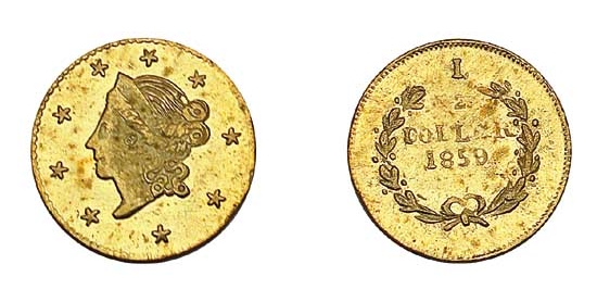 Obverse DescriptionA fairly crude rendering of a Liberty Head, facing left. The portrait is surrounded by thirteen stars, typically unevenly spaced and weak in areas. The date, 1859, appears below the bust truncation. The overall design mimics contemporary U.S. federal gold coinage but on a miniature scale.