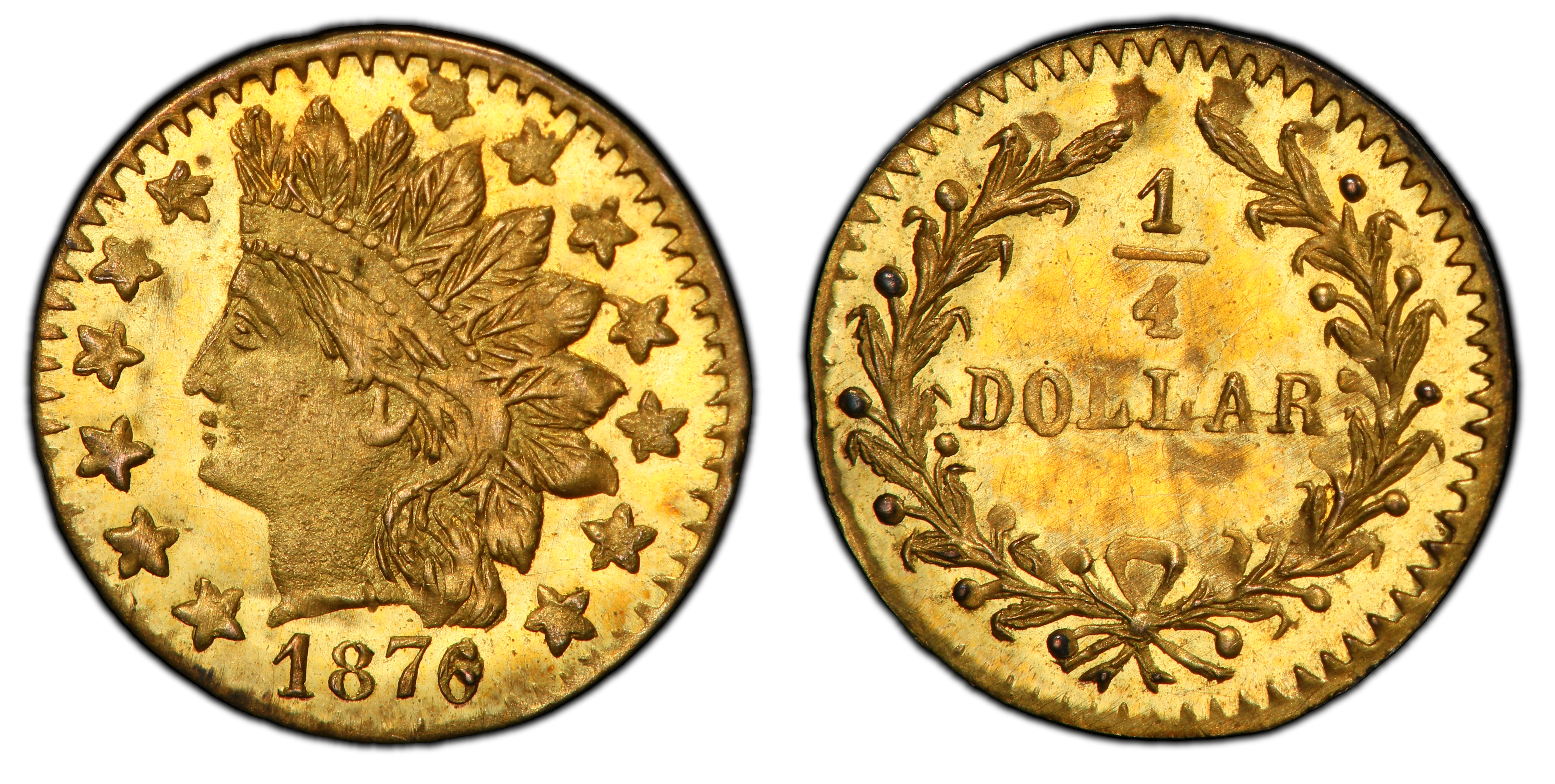 The 1878/6 25 Cents, cataloged as Breen-Gillio 883, is a quintessential example of a 'Period Two' California Fractional Gold piece. By the late 1870s, the original impetus for this private coinage—a severe shortage of circulating small change during the Gold Rush—had long since vanished. The San Francisco Mint, operating since 1854, was producing ample federal coinage for commerce. However, the romance of the Gold Rush had created a robust tourist and souvenir market. San Francisco jewelers capitalized on this by manufacturing these miniature, denominated gold tokens that evoked the region's pioneer heritage. The Coinage Act of 1864 had explicitly outlawed private coinage, but enforcement by the Secret Service was notoriously lax until a crackdown in 1883. This legal gray area allowed for a prolific output of such 'jeweler's issues' throughout the 1870s. These pieces were not intended to, and did not, serve as money. Their intrinsic value was significantly less than their face value, a common trait for Period Two issues which were lighter and often of a lower fineness than their Period One predecessors. Instead, they were sold as keepsakes, charms for bracelets, or curiosities for collectors back East. The 1878/6 overdate is a fascinating production detail, indicating the re-use of an older 1876 die, likely for economy. This specific variety shares its reverse die with BG-882, an 1876-dated issue, and the Breen-Gillio reference notes this die as being 'shattered within wreath,' providing a key diagnostic feature. The existence of these pieces speaks to a mature post-Gold Rush economy in San Francisco, where local artisans could profitably manufacture and market nostalgic symbols of the city's recent, tumultuous, and golden past.