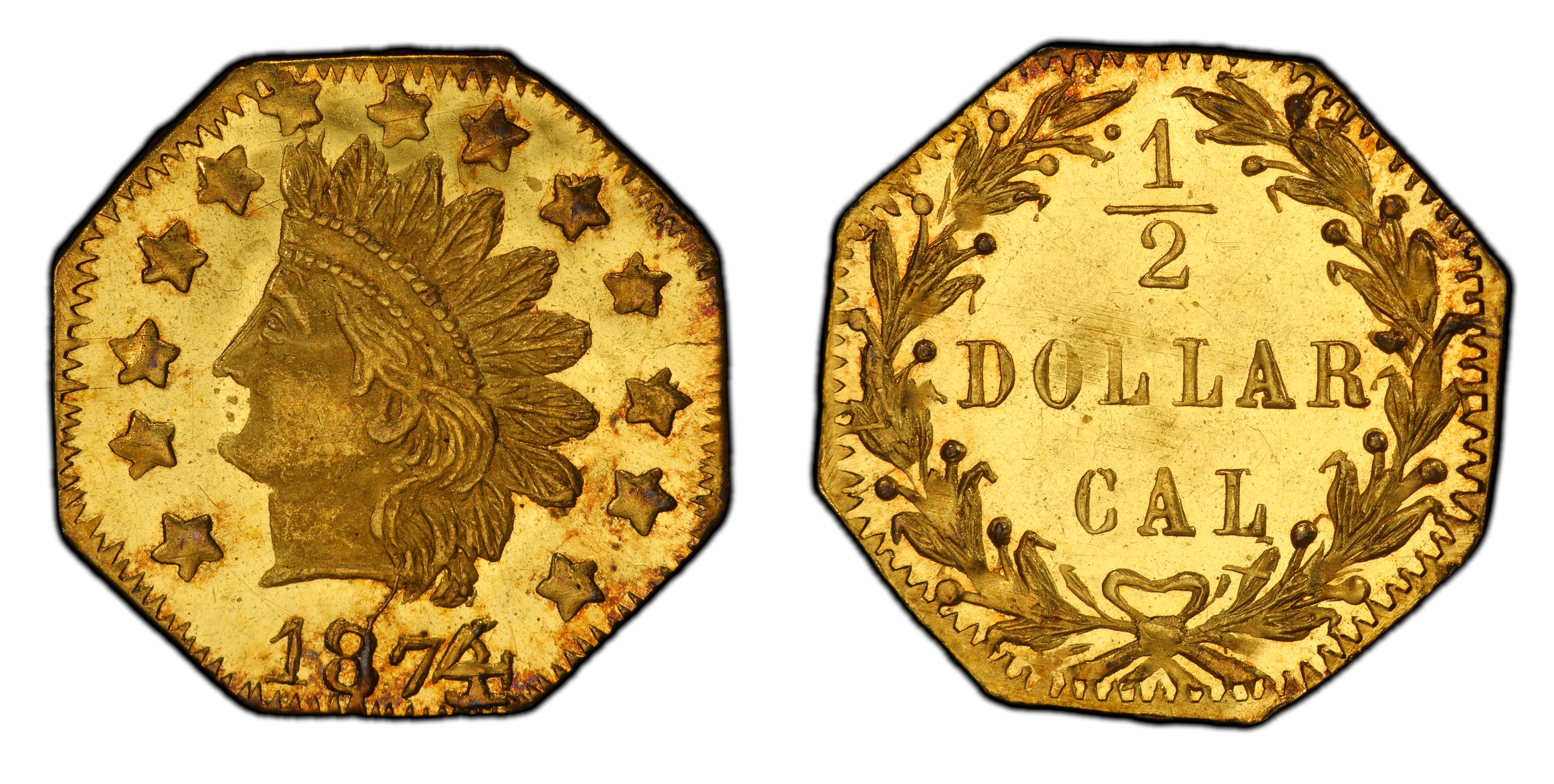 This variety is highly sought after due to its status as a clear 1874/3 overdate, its distinctive octagonal shape, and its high R-4+ rarity. It appeals to specialists in California gold, overdate collectors, and those fascinated by the souvenir coinage of the Old West. The presence of known die cracks allows for precise attribution and die state analysis.
