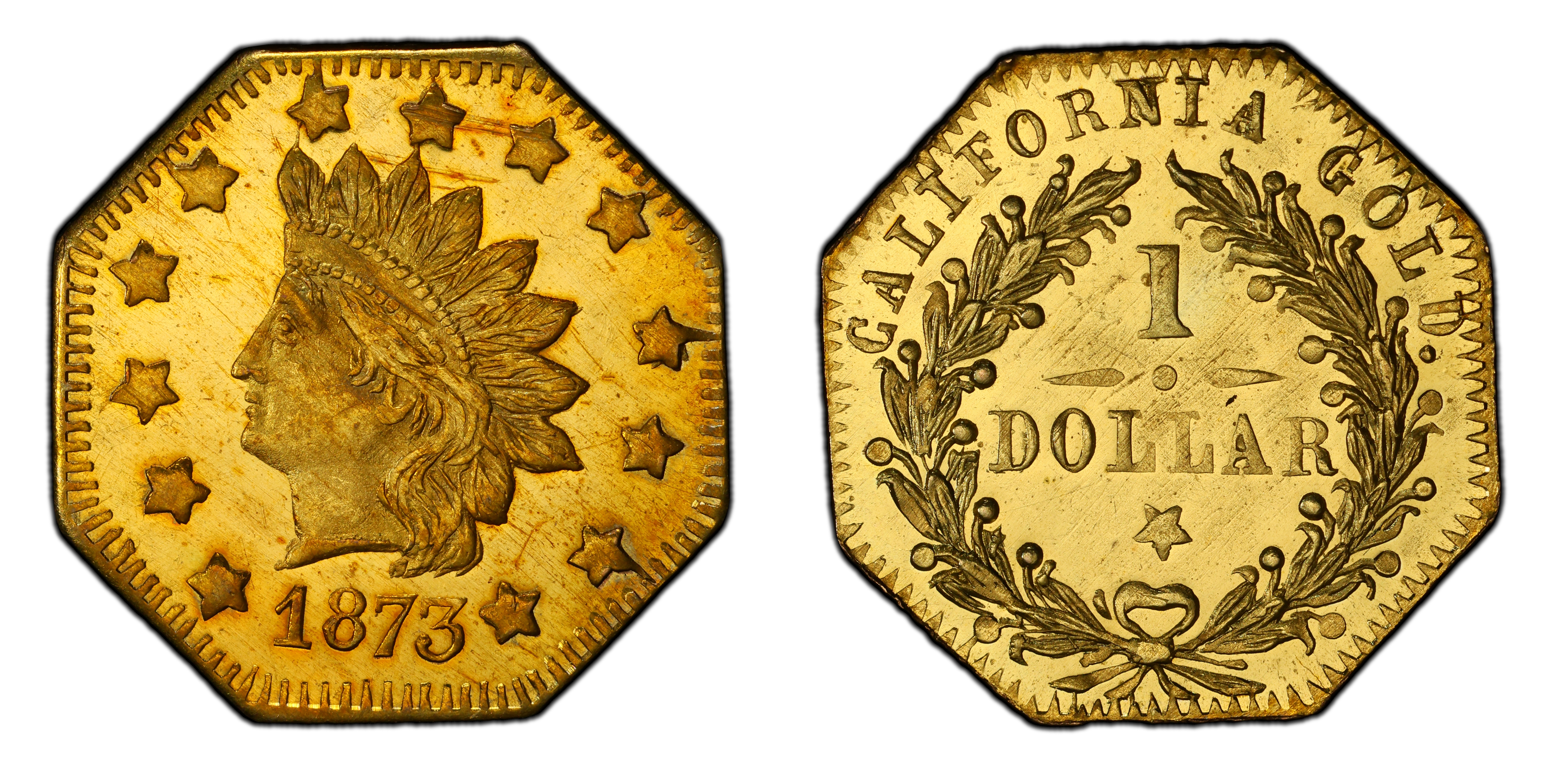 The 1873 Octagonal Indian Head Gold Dollar, cataloged as Breen-Gillio 1123, is a quintessential example of a 'Period Two' California Fractional Gold piece. These fascinating and diminutive coins emerged not from a government mint, but from the crucibles of private jewelers and metallurgists in San Francisco, long after the initial chaos of the Gold Rush had subsided. By 1873, the urgent need for small-denomination coinage that characterized the early 1850s had been largely met by the official output of the San Francisco Mint, which had been operational since 1854. The continued production of fractional gold pieces had therefore shifted from a necessity of commerce to a product catering to a different market: tourists, merchants needing novelty items, and citizens who retained a sentimental or practical affinity for gold in its most portable forms. These 'jeweler's issues' were often lighter and contained less gold than their stated face value, functioning more as tokens or souvenirs than as true circulating currency intended to be redeemed at par. The socio-economic climate of 1870s San Francisco was one of immense growth and transformation; the city was a bustling metropolis and a gateway to the West, attracting visitors from across the country and the world. These tiny gold coins served as perfect mementos of a visit to the Golden State. The BG-1123, with its popular Indian Head motif—a design romanticizing the American frontier—would have been particularly appealing. Struck with hand-cut dies and often by rudimentary screw or hammer presses, the quality of these pieces could vary, yet many, like the BG-1123, were produced with considerable care. The existence of Prooflike (PL) specimens indicates that some were struck using highly polished dies and planchets, intended from the start for collectors or for use in jewelry, where their flashiness would be a key attribute. The Coinage Act of 1864 had made private coinage illegal, but the law was not strictly enforced against these small tokens until the Secret Service cracked down in 1883, effectively ending their production. Today, the BG-1123 is a scarce and highly sought-after artifact from this unique chapter in American numismatic history, representing the transition of fractional gold from utilitarian currency to cherished keepsake.