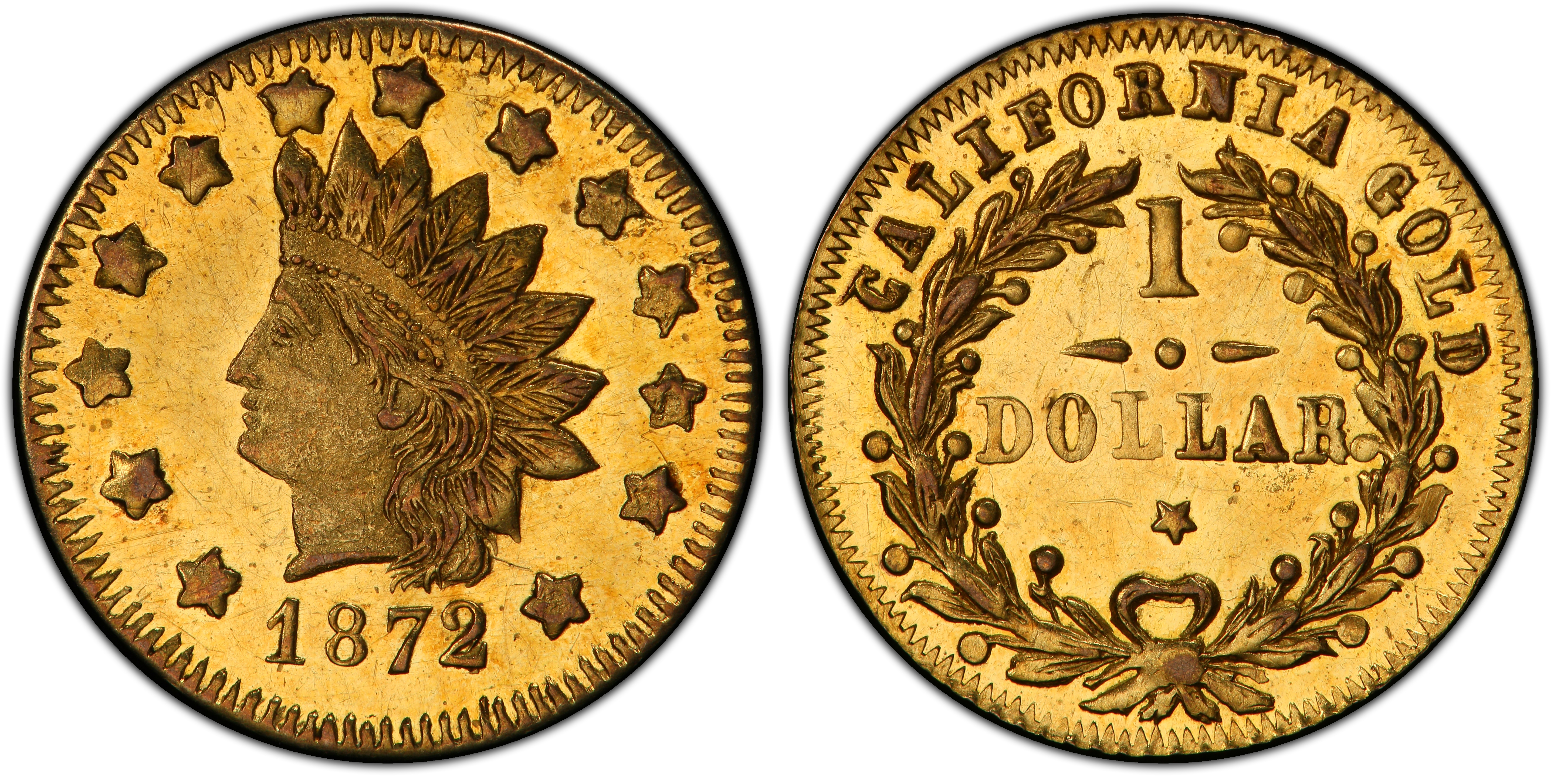 The 1872 G$1 BG-1206 is a fascinating product of the second major phase of California Fractional Gold production (1859-1882), often dubbed the 'Jeweler's Issue' period. Unlike the earlier 'Period One' pieces struck from 1852-1857 to alleviate a genuine shortage of small change during the Gold Rush, these later issues served a different purpose. By the 1870s, the United States Mint in San Francisco was in full operation, and the acute need for circulating private coinage had subsided. Instead, these miniature gold coins were primarily manufactured by jewelers and artisans in San Francisco as souvenirs, keepsakes, and novelty items for tourists and locals enchanted by the mystique of the Gold Rush. This era was defined by a cat-and-mouse game with federal authorities. The Private Coinage Act of 1864 expressly forbade the issuance of private money, but enforcement was inconsistent and focused elsewhere for years. This legal gray area allowed dozens of small-scale producers to continue striking these pieces, often with lower gold content and cruder workmanship than their Period One predecessors. The designs became more varied, with Indian Head motifs joining the traditional Liberty heads, likely to mimic the popular federal coinage of the day and increase their appeal. However, by the late 1870s and early 1880s, the U.S. Secret Service, under Chief James J. Brooks, began a determined crackdown, viewing the continued production as a form of counterfeiting and a risk for fraud. This pressure led to the cessation of nearly all fractional gold minting by 1883. The BG-1206 is one of the rarest and most enigmatic issues from this twilight period. Its 'Indian Head' design is crisply executed for the type, but its extreme rarity suggests a very limited, perhaps experimental, production. Referred to by numismatists as the 'King of the Indian Head Round dollars,' its existence as a full Rarity-7 coin points to a mintage that was likely minuscule, perhaps only a few dozen pieces at most. The specific circumstances of its creation and the identity of its maker are lost to history, but it stands as a testament to the persistent and entrepreneurial spirit of California's artisans, who continued to create these iconic symbols of the Golden State long after their practical necessity had vanished.