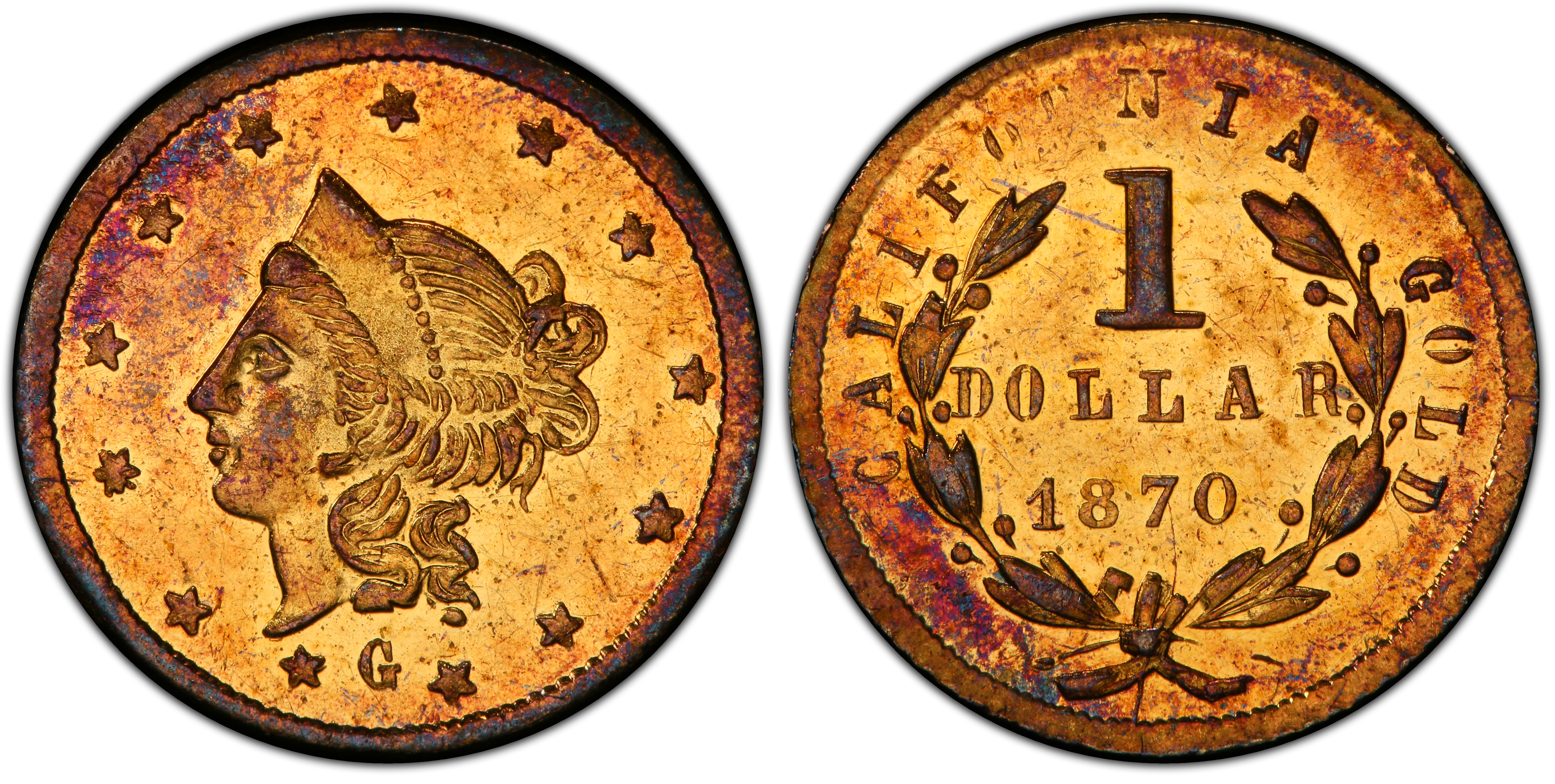 Relevant Grade TypesAll original 1870 G$1 BG-1202 coins were struck as business strikes, intended for sale as souvenirs rather than circulation. They are found in Circulated grades (AU-50 and lower, typically from mishandling) and, more commonly, in Mint State (MS, 60-70) grades. No true Proofs were struck during the original period. The 'PL' (Prooflike) designation is given to business strikes that were made with freshly polished dies, resulting in mirror-like surfaces, and these are considered distinct collector items from standard Mint State strikes.