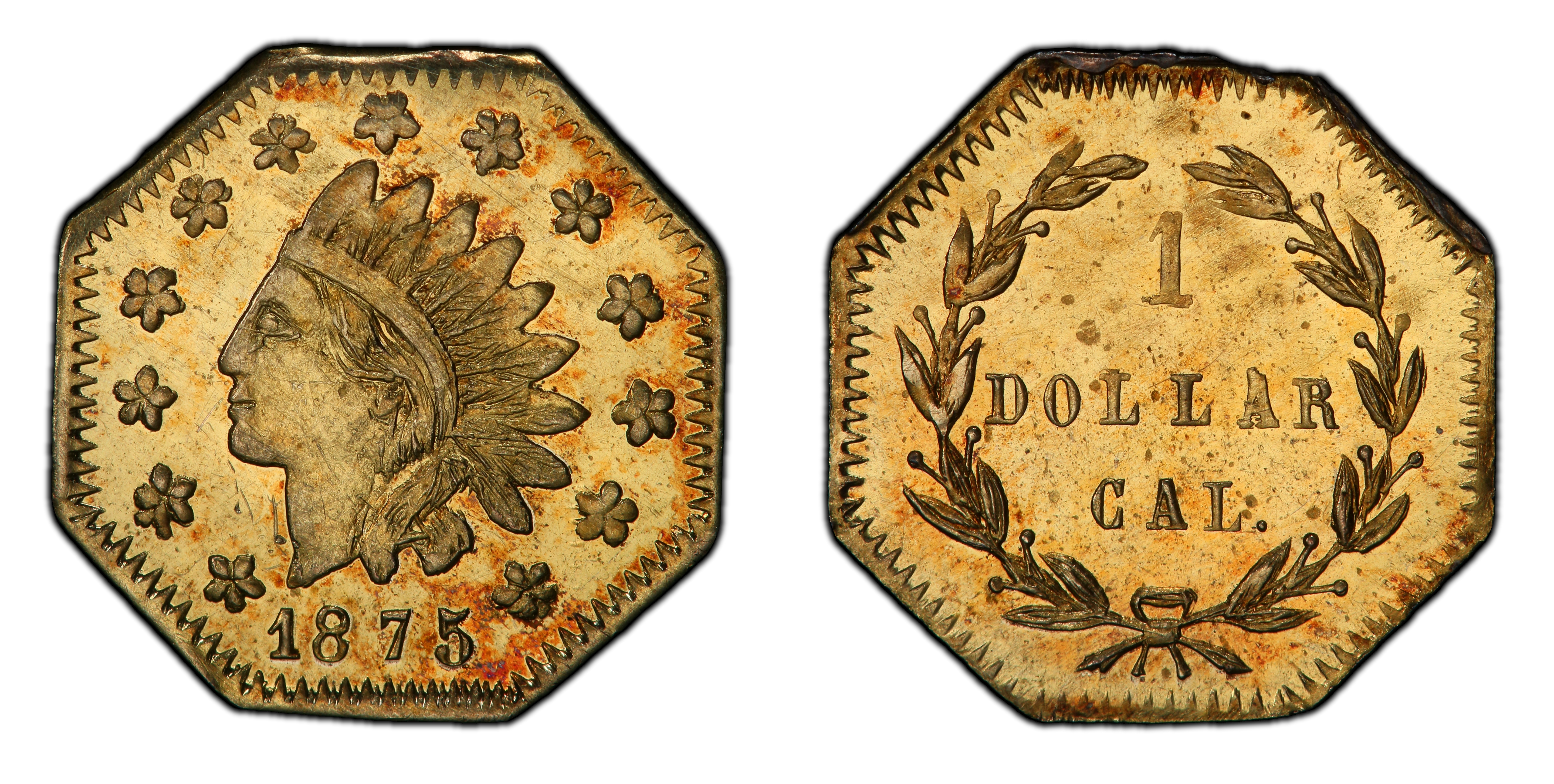 The 1875 Octagonal Gold Dollar, cataloged as Breen-Gillio 1112, emerged from the second major phase of California's private gold coinage. Unlike the 'Period One' issues (1852-1857), which were struck out of genuine necessity to alleviate a severe shortage of small-denomination circulating coinage during the initial gold rush fervor, the 'Period Two' pieces (1858-1882) served a different purpose. By 1875, the United States Mint in San Francisco was in full operation, and federal silver and minor coinage had largely saturated the commercial channels of the West. The acute need for private fractional gold had waned. Instead, these later pieces were primarily produced by San Francisco jewelers and artisans as souvenirs and novelty items. They catered to a burgeoning tourist trade and a local population still captivated by the romance of the Gold Rush. These miniature gold pieces were charming mementos of California's unique economic history. The Coinage Act of 1864 had explicitly forbidden private coinage, but enforcement against these small, low-value tokens was lax until the early 1880s. Minters of this era often operated anonymously to avoid scrutiny from the Secret Service. The BG-1112, with its Indian Head motif—a popular design choice echoing federal coinage but with a distinct local flair—was a product of this environment. Its production was not a response to economic desperation but rather a commercial enterprise tapping into nostalgia and the public's fascination with gold. Despite their unofficial status, they contain real gold, though often at a fineness and weight inconsistent with their stated face value, reinforcing their role as keepsakes rather than true instruments of commerce.