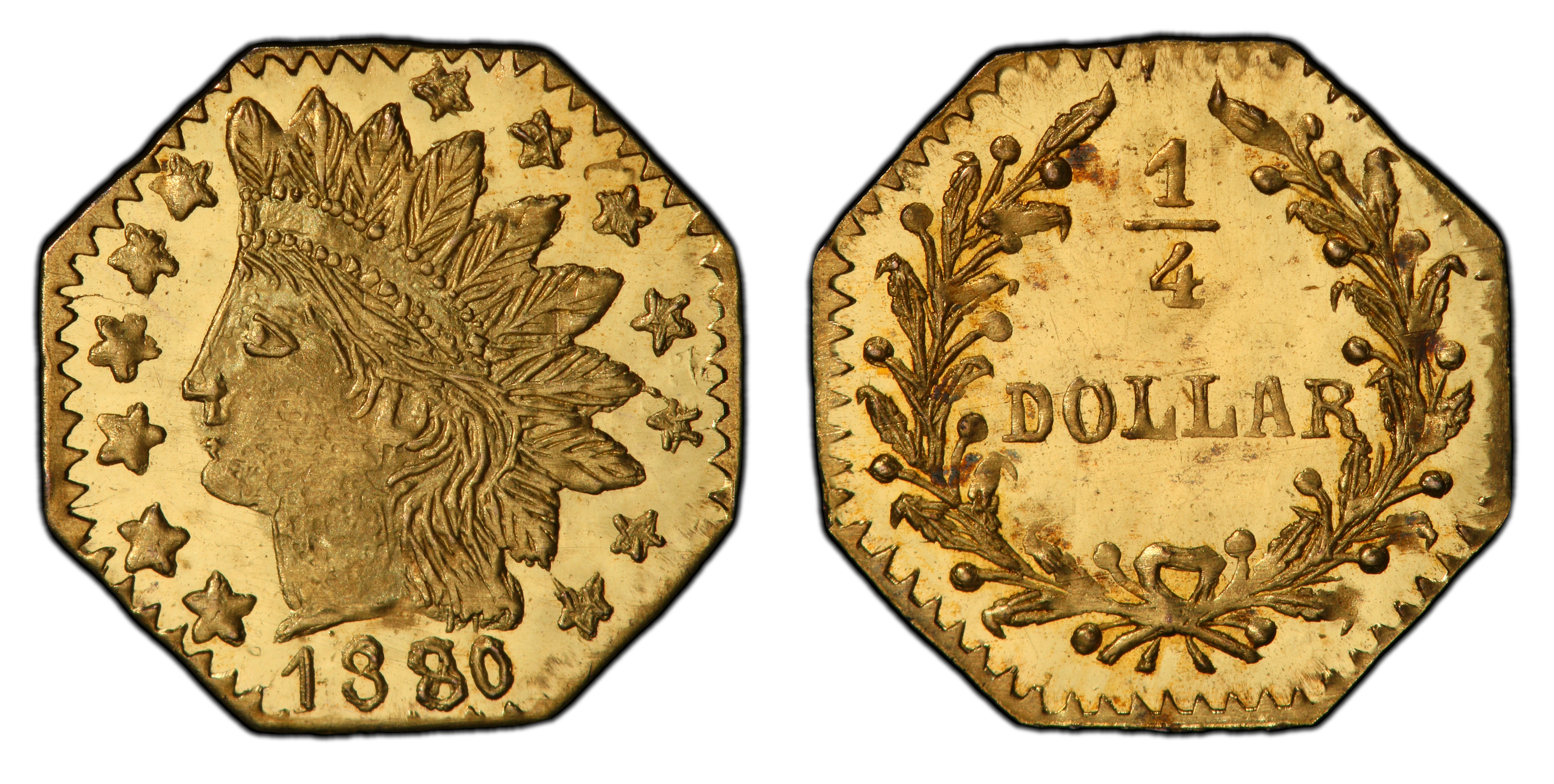Reverse DescriptionThe central device is the denomination '1/4' enclosed within a wreath of two olive branches tied with a bow at the bottom. The legend 'CALIFORNIA GOLD' appears above the wreath along the upper periphery. The piece is octagonal in shape.