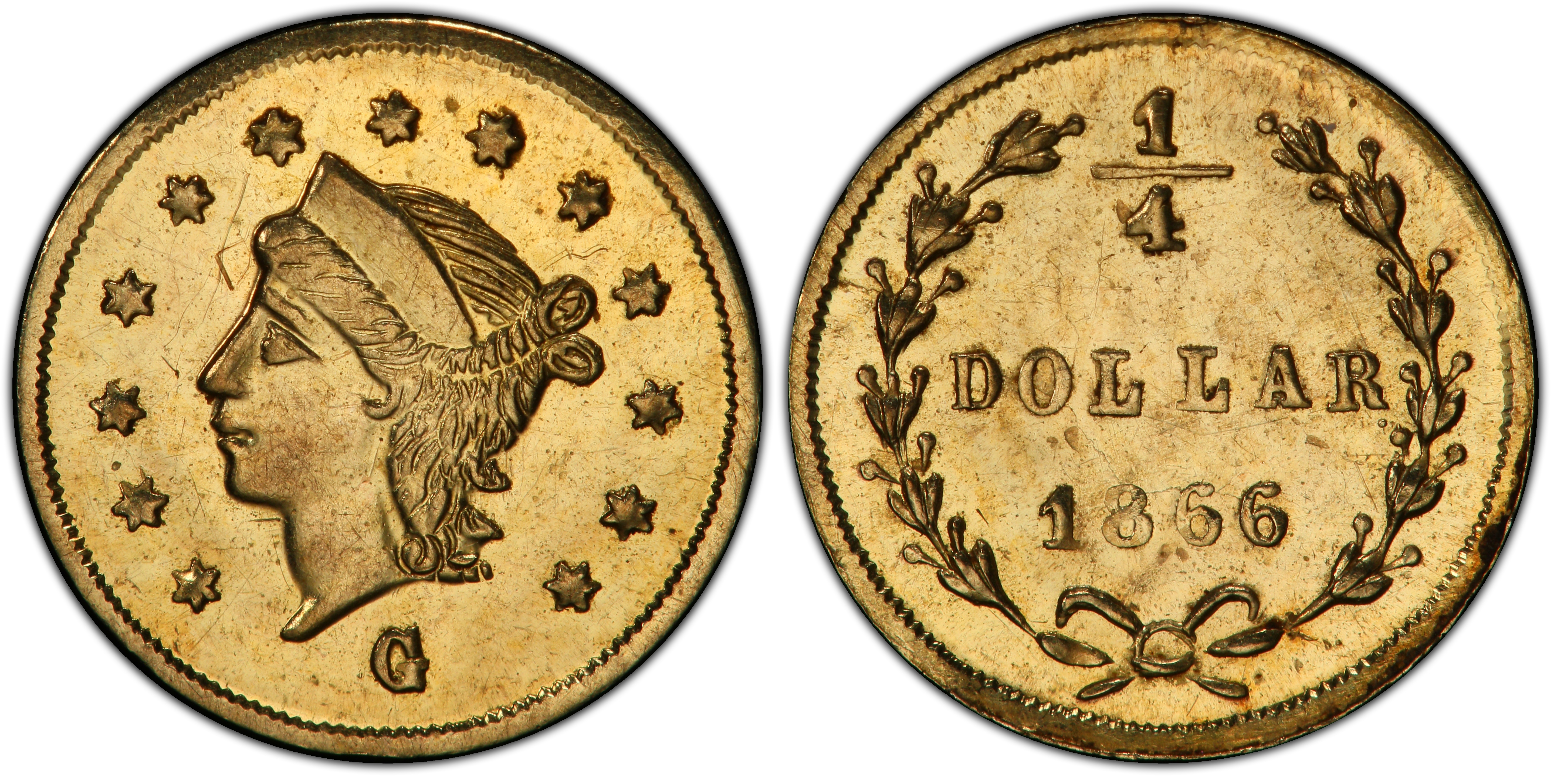 The 1866 BG-824 25 Cents represents a fascinating chapter in the story of California's private currency, belonging to what numismatists classify as 'Period Two' (1858-1882) of California Fractional Gold production. Unlike the earlier issues of Period One, which were struck to meet an urgent need for circulating coinage in the chaotic Gold Rush economy, Period Two pieces emerged in a more mature economic environment. By the mid-1860s, U.S. silver coinage was more prevalent, yet the allure and utility of small-denomination gold pieces persisted, particularly as souvenirs and for small-scale transactions where specie was preferred over paper money. These tokens, often called 'charms' or 'souvenirs' even in their own time, were produced by jewelers and private minters, capitalizing on the romanticism of the Gold Rush and the state's identity as the 'Golden State.' The Act of April 22, 1864, which prohibited private coinage, was largely ignored by these producers, who continued to issue pieces discreetly. The BG-824, attributed to the prolific firm of Robert B. Gray & Co. in San Francisco, is a prime example of this era's output. It features a standard 'Liberty Head' design, common to U.S. federal coinage, which lent it an air of legitimacy, though it was not legal tender. These pieces circulated to some degree but were primarily treasured as keepsakes, gifts, and mementos of a visit to California. Their diminutive size and delicate nature meant many were lost or damaged, making well-preserved examples scarce today. The history of the BG-824 is not just that of a coin, but of California's evolving identity, the transition from a frontier economy to a more established state, and the enduring legacy of gold in the American West.