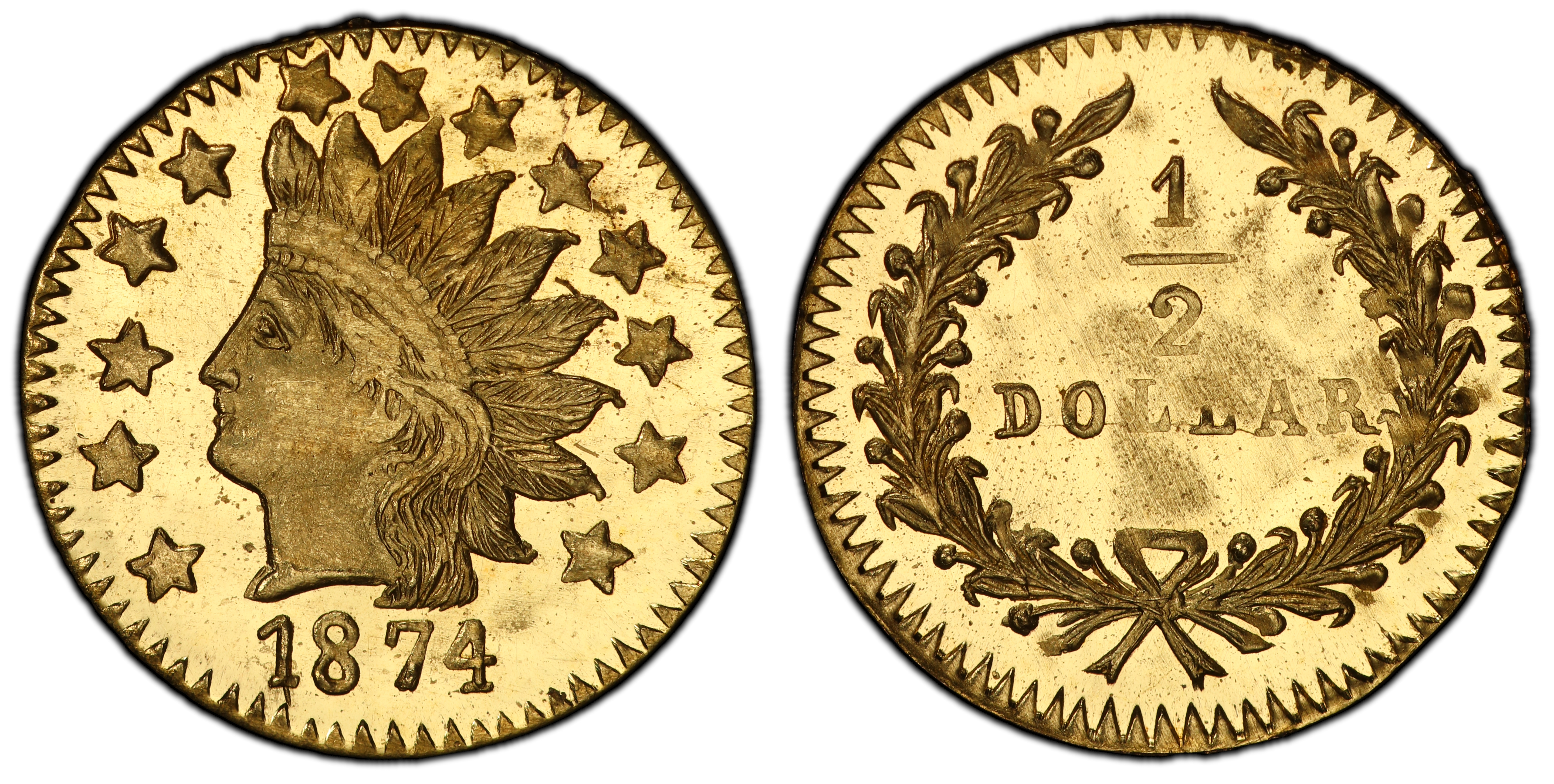 Reverse DescriptionThe denomination '1/2 DOLLAR' is enclosed within a wreath of leaves and berries. The date '1874' appears below the wreath. Some examples may exhibit a small 'G' below the wreath, though its significance is not definitively known.