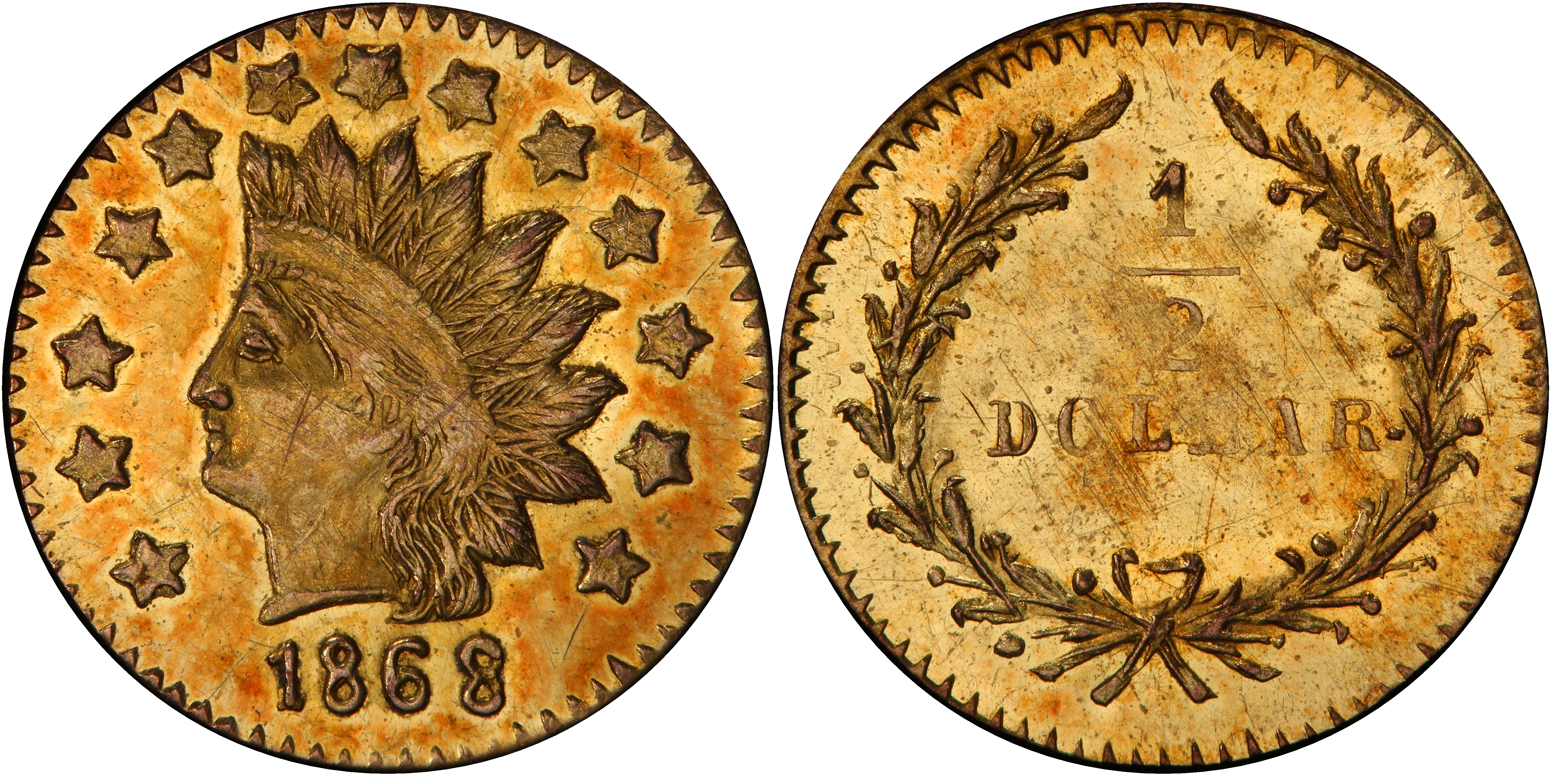 Reverse DescriptionA beaded border surrounds the denomination '1/2' and the word 'DOLLAR' within a wreath composed of two branches tied together with a ribbon at the bottom. The date '1868' is positioned below the wreath.