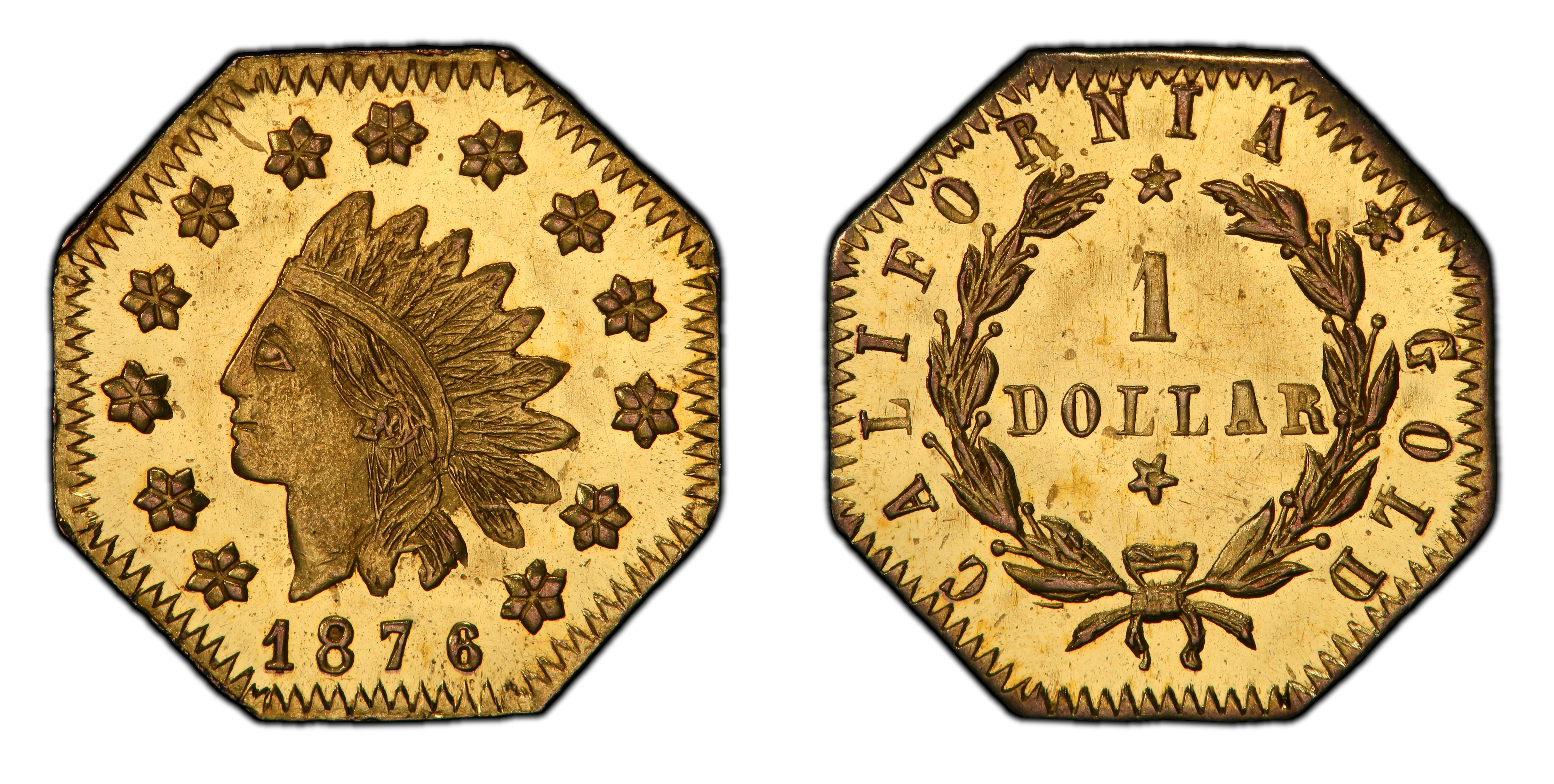 The 1876 G$1 BG-1114 is a product of the second and most prolific period of California Fractional Gold production (1859-1882), often termed the 'Jeweler's Period.' By the mid-1870s, the initial, acute shortage of small change that spurred the creation of these miniature gold pieces had largely subsided due to the output of the San Francisco Mint. However, demand for fractional gold persisted, driven by a combination of local commercial habit, a lingering distrust of paper money, and a burgeoning tourist and souvenir market. The Coinage Act of 1864 had explicitly forbidden the private issuance of coinage, rendering pieces like the BG-1114 technically illegal. This did little to deter the small-scale, often anonymous San Francisco jewelers who produced them. These minters operated in a gray market, leveraging their metallurgical skills to strike small-denomination gold pieces that were eagerly accepted in local commerce, particularly in the saloons and shops of the Barbary Coast. The year 1876 was significant as it marked the nation's Centennial, an event that fueled a national appetite for tokens and memorabilia. It is highly probable that many fractional gold pieces from this era were struck as much for their novelty and souvenir value as for their utility in trade. The BG-1114, with its classic Indian Head motif—a design popularized on federal coinage—would have been an attractive keepsake. These pieces were not official government issues and thus their gold content and weight were unregulated, often being worth intrinsically less than their face value. Their production was crude, typically involving a screw press or even a simple hammer-and-anvil method, resulting in significant variations in strike quality. The extreme rarity of the BG-1114 variety today suggests a very limited original production, likely the output of a single jeweler over a short period, whose identity is now lost to history.