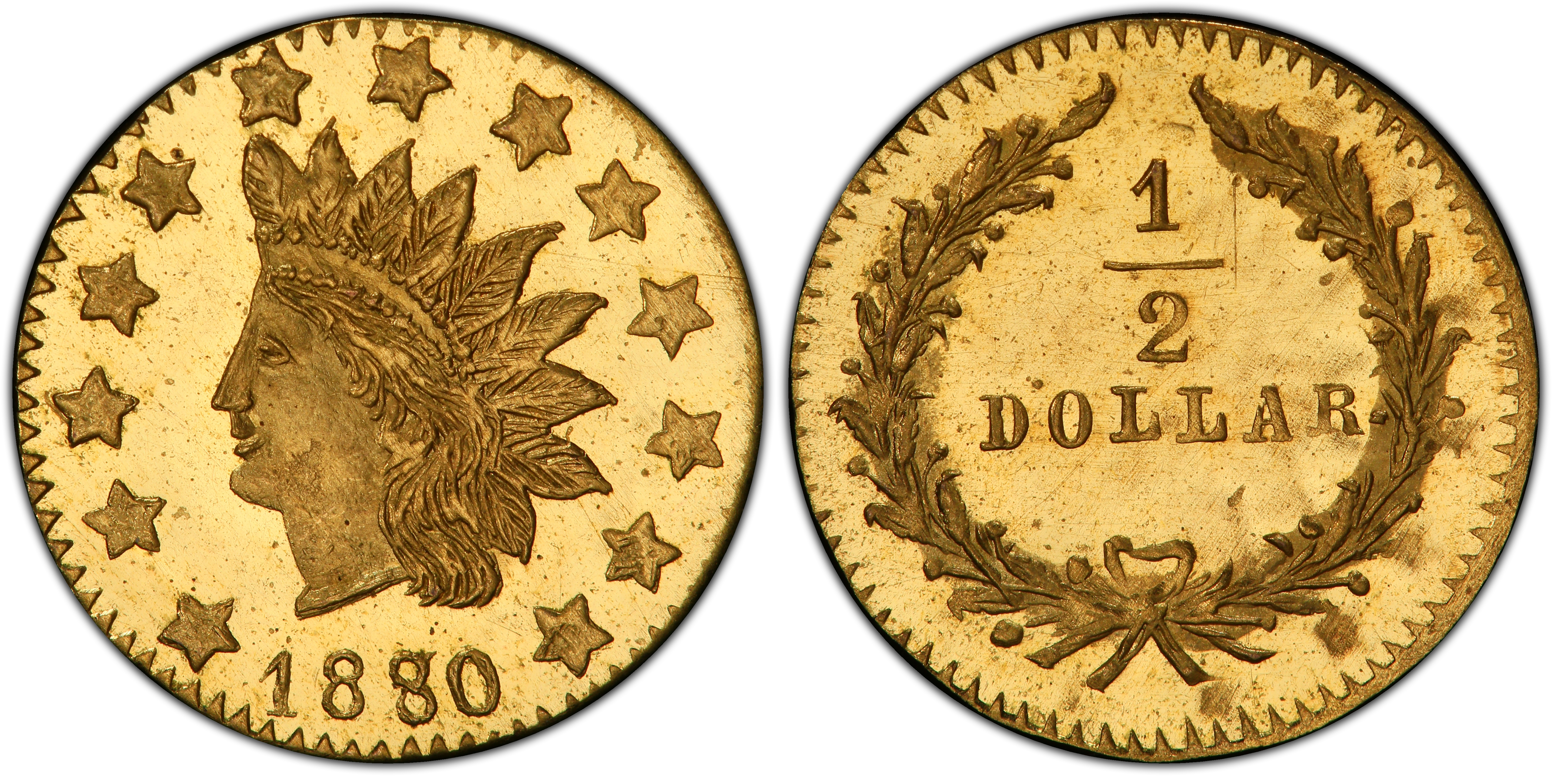 Authentication TipsAuthentic pieces must bear a denomination ('1/2 DOLLAR'). Post-1882 'charms' lack this feature. The strike is often uneven due to the crude manufacturing process; a perfectly struck coin should be viewed with suspicion. Check for the specific die markers of BG-1067, especially the positioning and appearance of the overdate. Counterfeits may be cast (showing pitting or a soft appearance) or struck from modern dies that lack the precise character of the originals. Many fakes are made of gilded base metals.