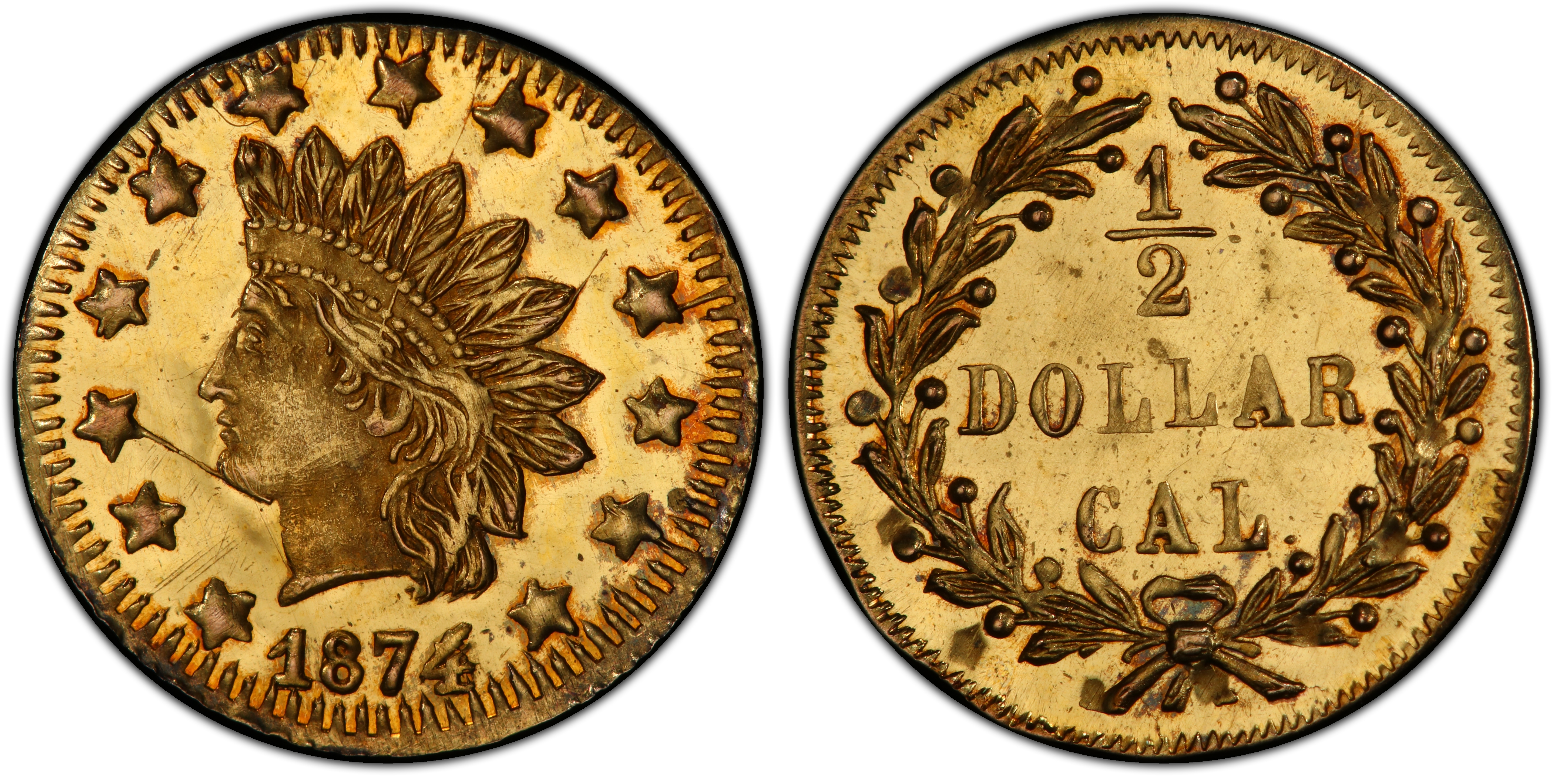 The 1874/3 50 Cents, cataloged as Breen-Gillio 1052, is a quintessential example of a 'Period Two' California Fractional Gold piece. Unlike their 'Period One' predecessors (1852-1857), which were struck to alleviate a severe shortage of small change during the initial chaos of the Gold Rush, these later issues were not intended for commerce. By the 1870s, the United States Mint in San Francisco was in full operation, producing ample quantities of federal coinage for the region's economy. The raison d'être for fractional gold had shifted entirely from necessity to novelty. These small gold tokens were now produced by various jewelers, primarily in San Francisco, as souvenirs and curiosities for tourists and locals alike. They captured the romanticism of the Gold Rush era in a tiny, affordable, golden memento. The production of these pieces existed in a legal gray area. The Coinage Act of 1864 had prohibited private coinage, but the law was not strictly enforced by the Secret Service against these small 'tokens' until 1883. This permissive environment allowed for a prolific output of hundreds of varieties throughout the 1860s and 1870s. The BG-1052 is notable for its clear 1874/3 overdate, indicating the re-use and modification of an older die, a common cost-saving practice among private minters. This specific variety, with its Indian Head motif—a popular design choice of the era, mimicking federal coinage—was struck to appeal to the public's fascination with the 'Wild West.' While the specific jeweler who produced this variety is lost to history, the style is consistent with the work of several known private minters of the day, such as Robert B. Gray & Co. or Christopher Mohrig. These pieces were often crudely struck by hand-hammering, resulting in inconsistent quality, but many, like the BG-1052, exhibit surprisingly sharp details and even prooflike surfaces, suggesting some care was taken in their manufacture for commercial sale as keepsakes.