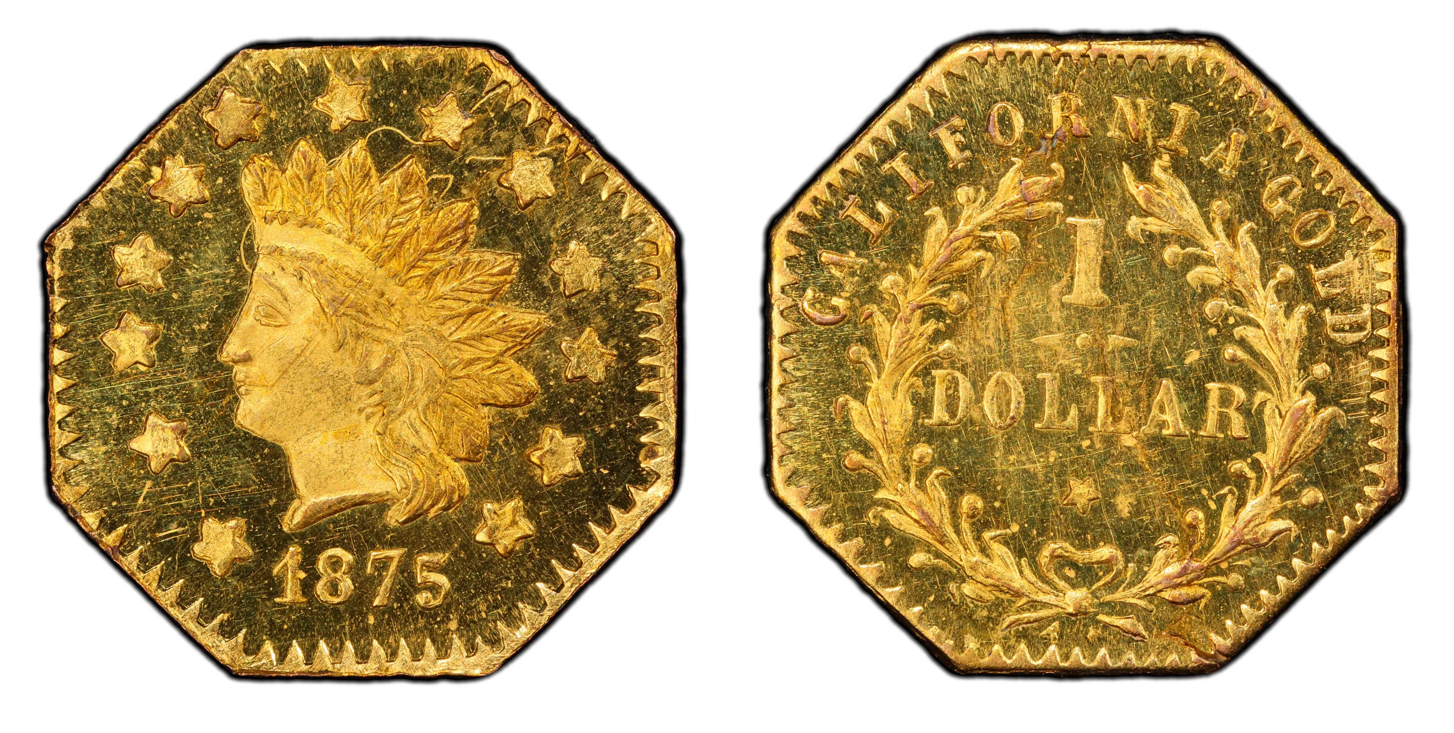The 1875 octagonal one dollar piece, cataloged as Breen-Gillio 1127, represents the twilight of a fascinating and often misunderstood era of American currency. These small gold tokens, born of necessity and commercial opportunism, are relics of California's prolonged 'hard money' economy. Following the 1849 Gold Rush, California was flooded with gold dust but severely lacked circulating coinage, particularly for small transactions. Federal branch mints struggled to keep up, and private minters filled the void. By the 1870s, the initial acute shortage had eased, but the cultural preference for gold and silver remained deeply ingrained, and the U.S. government was actively hostile towards private coinage. The Act of April 7, 1864, made private coinage illegal, but production of these 'tokens' or 'charms' continued clandestinely and often skirted the law by omitting the word 'Dollar' or 'D.' However, demand persisted, and a new generation of jewelers and entrepreneurs, like Robert B. Gray & Co., began producing pieces primarily for the souvenir and jewelry trade, though they undoubtedly circulated as currency when convenient. These 'Period Three' (1872-1882) pieces are distinguished by their often cruder, more stylized designs compared to their earlier, more functional counterparts. They were a novelty, a memento of the great Gold Rush, yet still crafted from California gold. The BG-1127 variety, with its Indian princess motif, captures this later period's spirit. It wasn't meant to solve a currency crisis but to satisfy a tourist's desire for a keepsake and a local's preference for tangible gold. The 'PL' or Prooflike designation on certain specimens indicates they were struck using highly polished dies on polished planchets, resulting in a mirror-like finish that enhanced their appeal as gift items. Their existence is a testament to the enduring legacy of the Gold Rush and the independent, bullion-based economy that characterized California for decades.