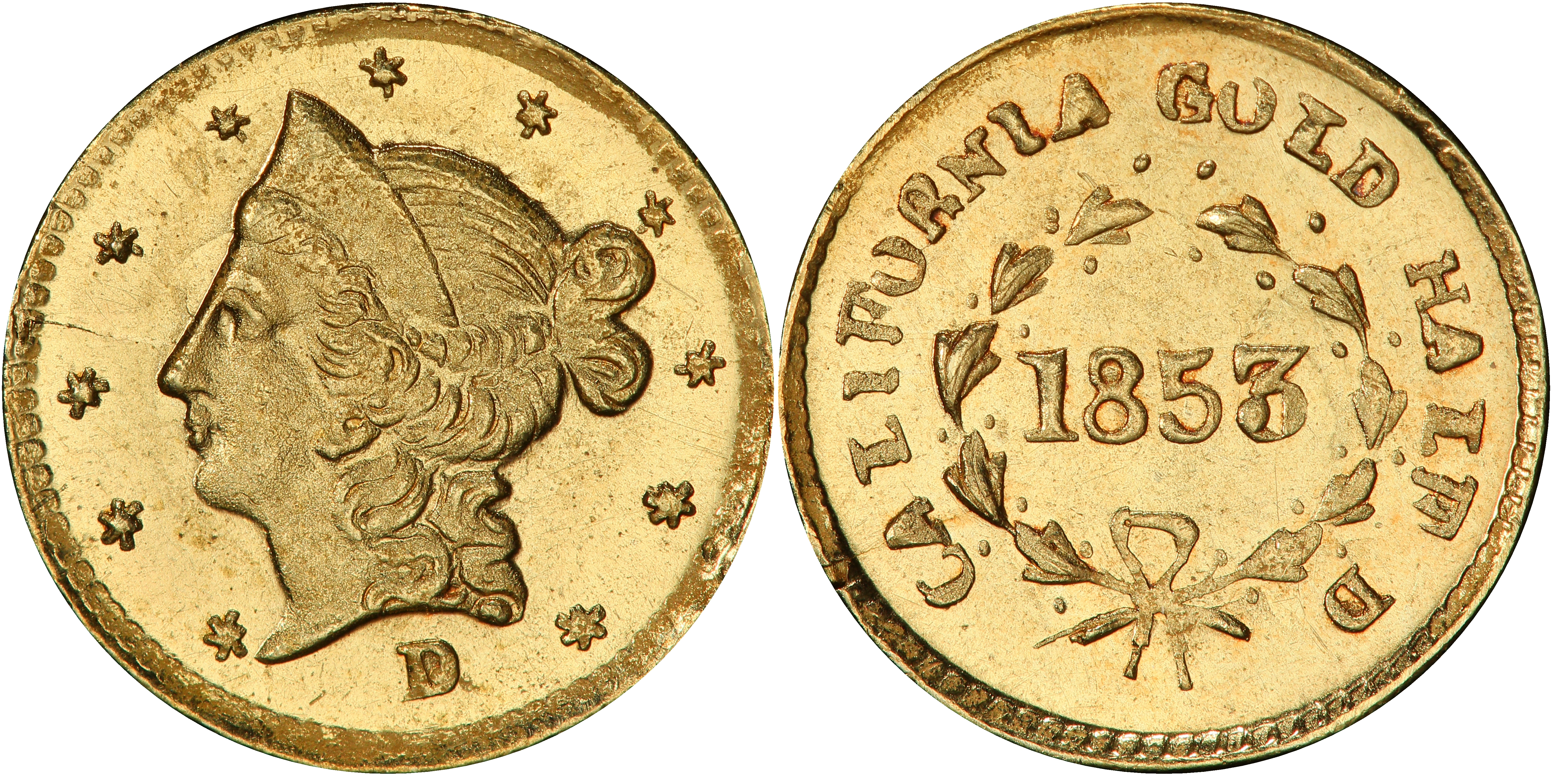 Reverse DescriptionThe denomination 'HALF DOL.' is centrally located within a simple wreath composed of two branches tied by a bow at the bottom. Outside the wreath, the legend 'CALIFORNIA GOLD' curves along the upper periphery. The date '1853' is positioned at the bottom, below the wreath.