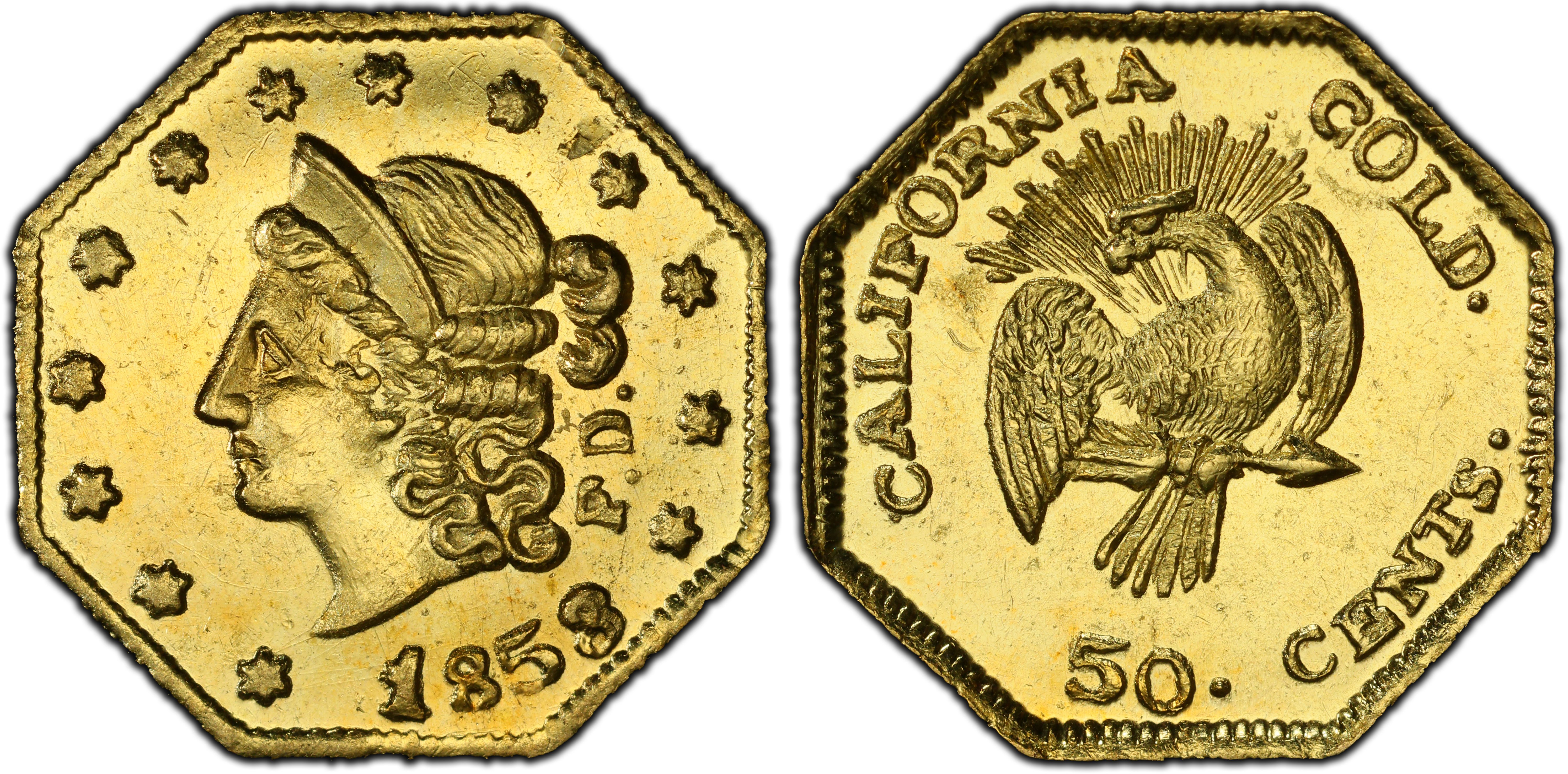 The 1853 'Peacock' Half Dollar is one of the most iconic and eagerly sought-after issues within the entire California Fractional Gold series. Its existence is a direct consequence of the chaotic and economically primitive conditions of the early California Gold Rush. Following the discovery of gold in 1848, a massive influx of population created a burgeoning economy, yet the region was starved for circulating coinage, particularly for small daily transactions. Gold dust, weighed in 'pinches,' proved to be an imprecise and untrustworthy medium of exchange. While several private mints began issuing larger denomination coins ($5 to $50), the need for fractional currency to supplant the confusing mix of foreign silver coins was acute. Manufacturing jewelers in San Francisco stepped into this void. The firm of Frontier, Deviercy & Co., active from 1852-1856, is credited with producing this specific piece. These tiny, octagonal gold coins were intended to pass for fifty cents in local commerce. They were crudely but effectively made using the 'hammer method,' where dies were struck by hand, leading to significant variations in strike quality. While their intrinsic gold value was often less than their face value, they were indispensable for a time. However, their minuscule size made them impractical and easy to lose, and as the official San Francisco Mint ramped up production of federal coinage after 1854, these private issues quickly fell out of favor for circulation. They soon found a new, enduring purpose as popular souvenirs and keepsakes—small, affordable tokens of the California adventure that could be easily mailed back East. The BG-302, with its distinctive and artistically appealing reverse, was a particular favorite, ensuring a higher survival rate than many of its more prosaic contemporaries. Today, it stands as a tangible link to the rugged commerce of the Gold Rush and the ingenuity of the private minters who served a vital economic need.