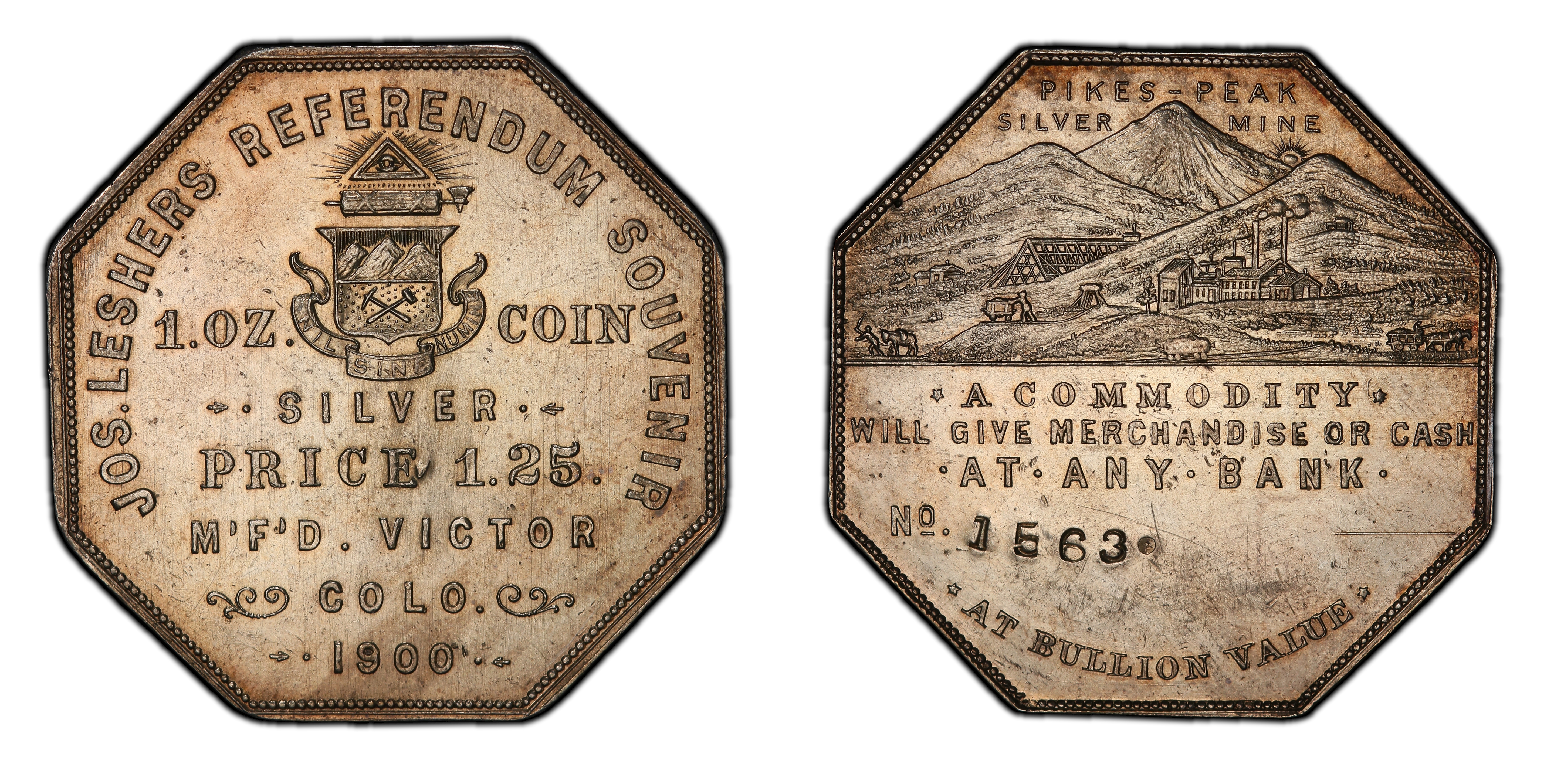 Reverse InscriptionJOS • LESHERS • REFERENDUM • SILVER • SOUVENIR • MEDAL • / ONE OZ. COIN / SILVER / PRICE / $1.25 / VICTOR, / COLO. / 1900