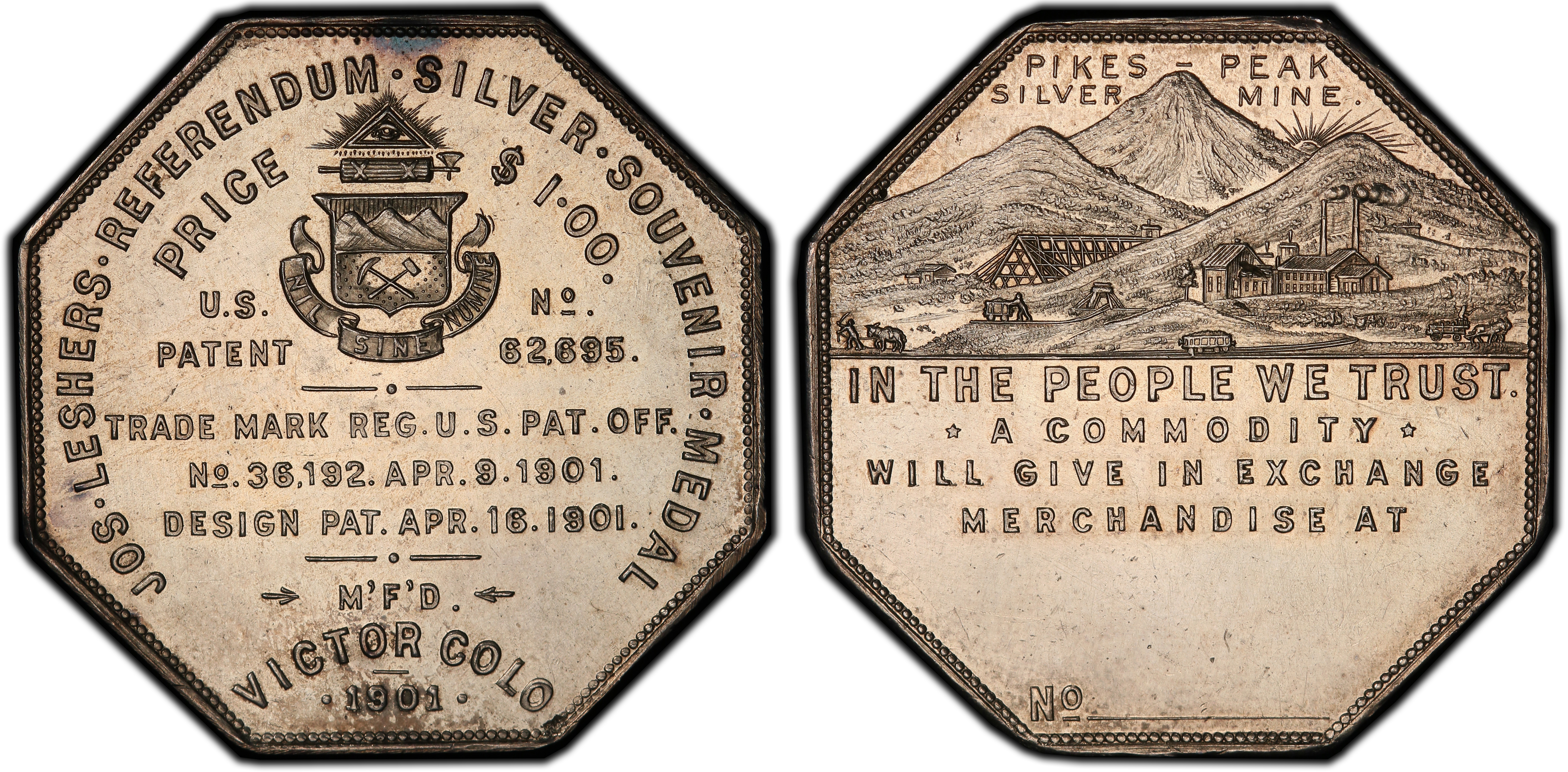 Obverse InscriptionJOS. LESHERS REFERENDUM SOUVENIR / PIKES PEAK SILVER MINE / (view of mountains) / (Colorado state seal) / A COMMODITY. / WILL GIVE IN EXCHANGE / MERCHANDISE OR CASH AT / PRICE $1.00 / U.S. PATENT / No. 62695.