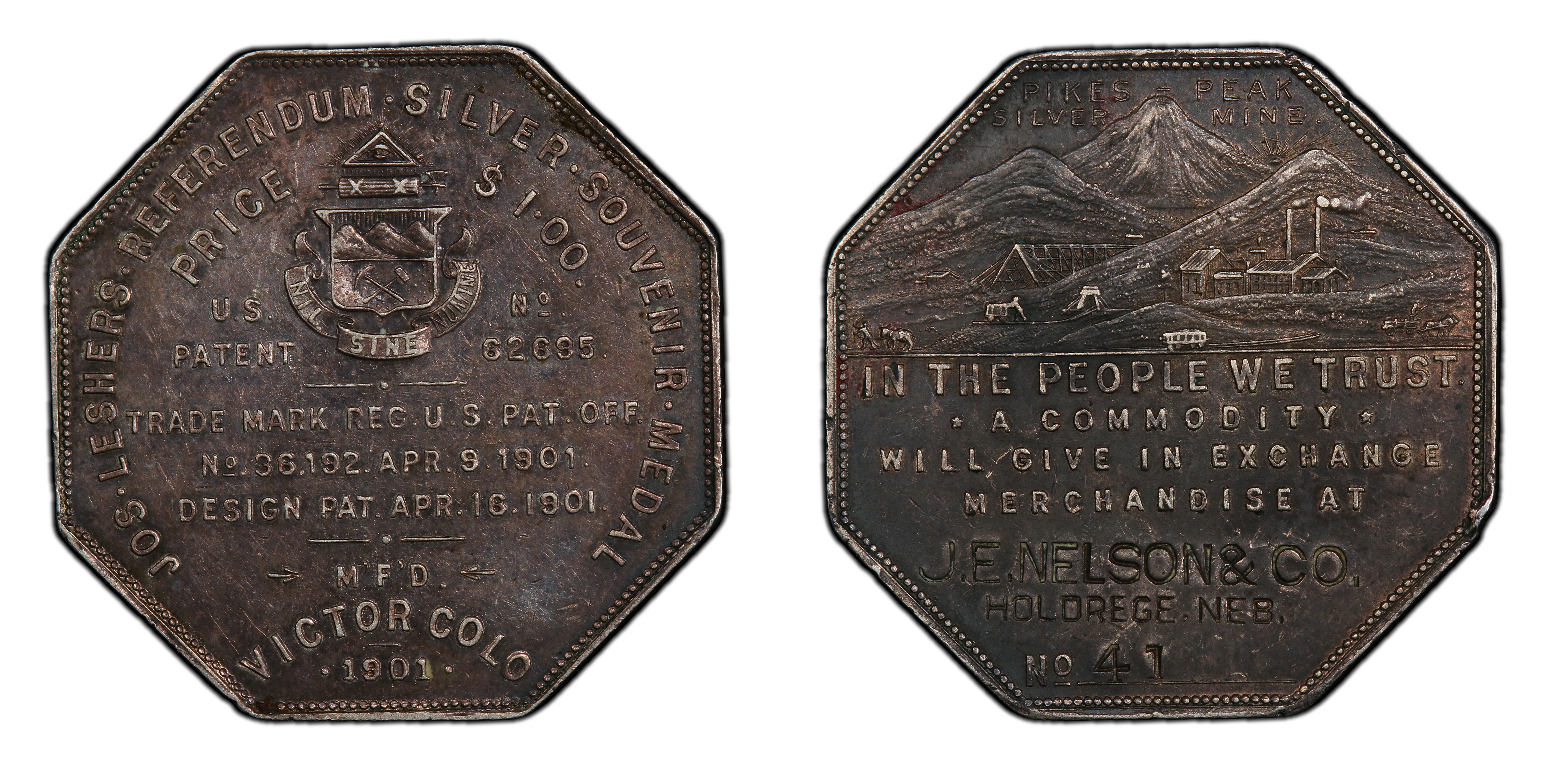 Obverse DescriptionOctagonal medal featuring a detailed mining scene of the Pikes Peak silver mine, with buildings and smoke rising from a smokestack against a mountain backdrop. Above the scene is the inscription 'PIKES PEAK / SILVER MINE'. Below is the motto 'IN THE PEOPLE WE TRUST' and the text 'A COMMODITY / WILL GIVE / IN EXCHANGE / MERCHANDISE AT', followed by a blank space where the merchant's name is stamped. For this variety, the space is stamped 'J. E. NELSON & CO. / HOLDREGE, NEB.' A serial number, individually hand-punched, appears below the merchant stamp.
