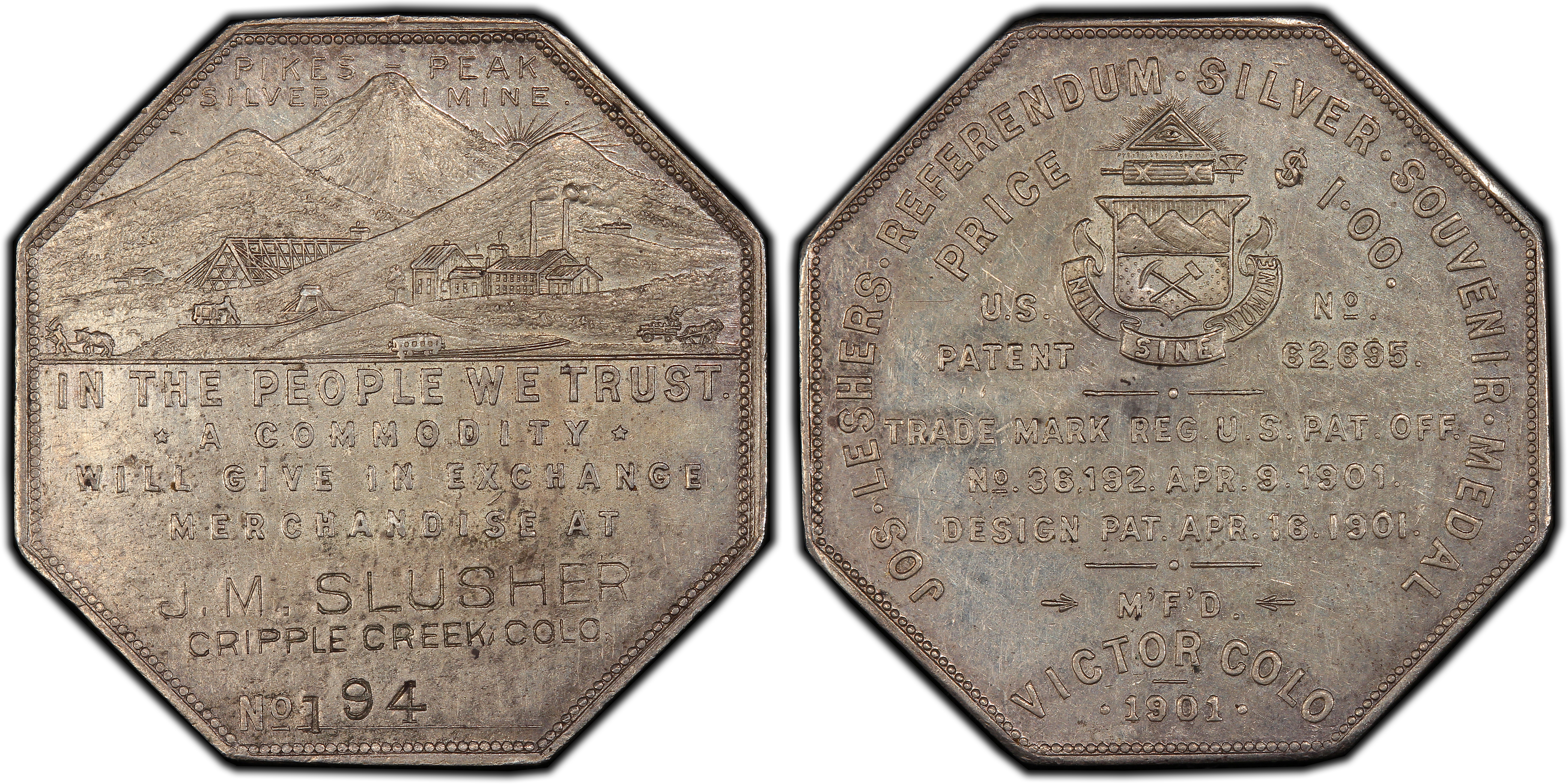 Reverse InscriptionA COMMODITY / WILL GIVE IN EXCHANGE / MERCHANDISE OR CASH / AT FACE VALUE / PRICE $1.00 / NO. [Serial Number] / M'F'D VICTOR, COLO. / 1901 / U.S. PATENT No 62695 TRADE MARK REG. U.S. PAT. OFF. No 36192 APR. 9. 1901 DESIGN PAT. APR. 16. 1901