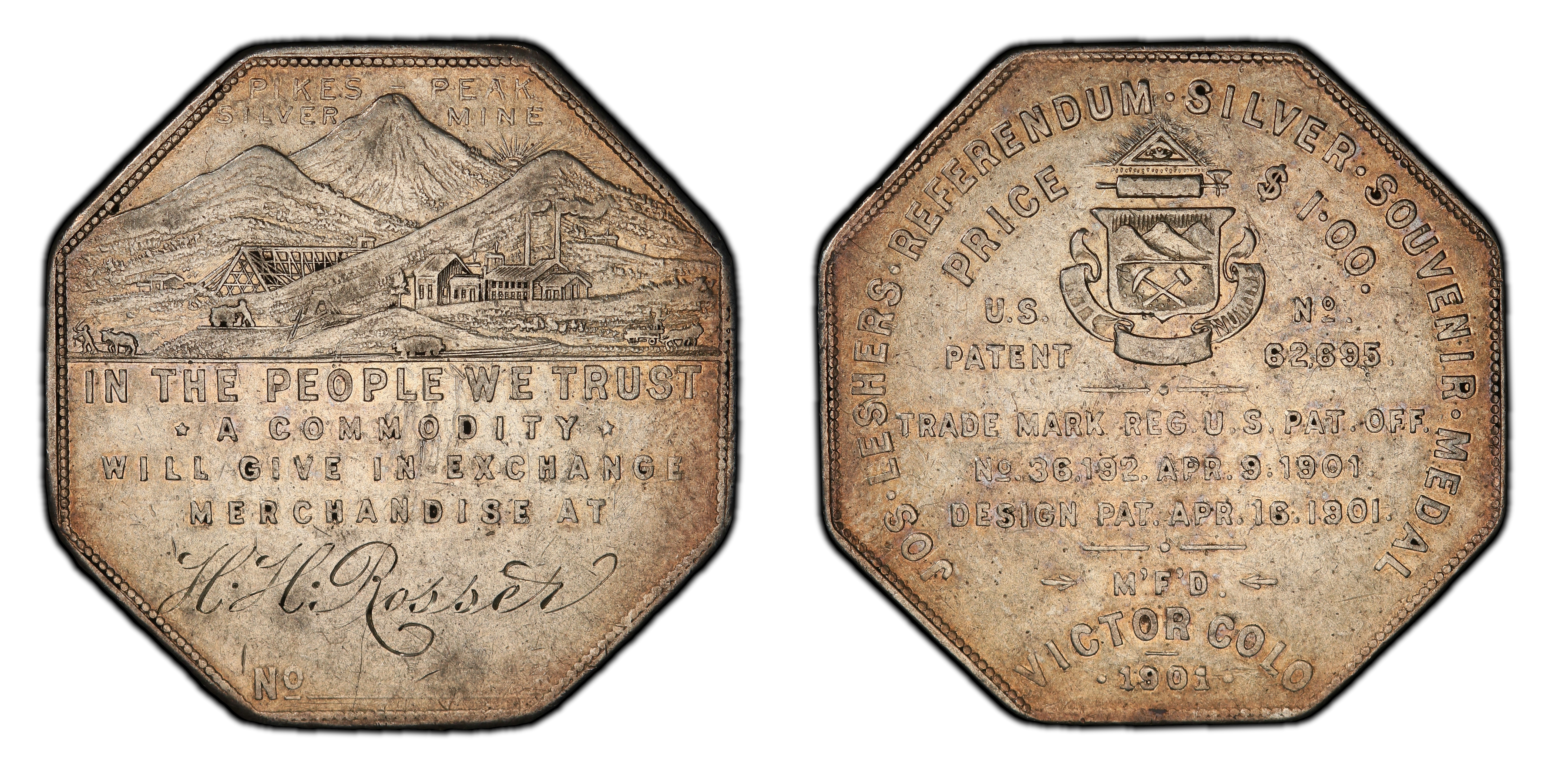 Obverse DescriptionOctagonal shape. A detailed vignette of a mining complex is depicted in the center, with mountains in the background, likely representing the local Cripple Creek district. The inscription 'PIKES PEAK' is visible above the mountains. Below the mining scene, in a recessed panel, is the stamped imprint of the distributing merchant: H. H. ROSSER.