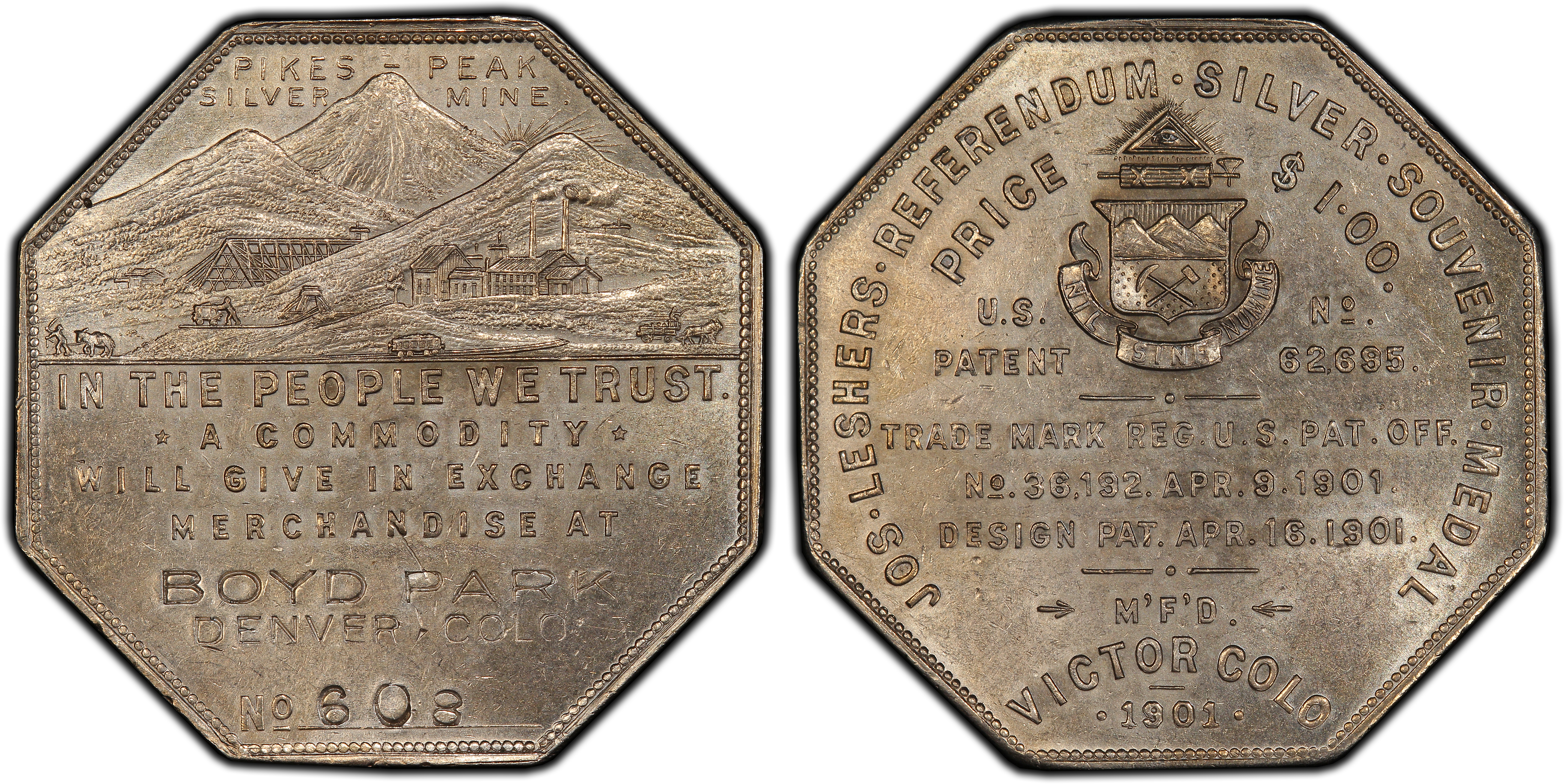 Obverse DescriptionOctagonal medal. The upper portion features a detailed vignette of the Pikes Peak silver mine and surrounding buildings, with mountains in the background. Arched above is 'PIKES-PEAK SILVER MINE' and below is 'IN THE PEOPLE WE TRUST'. The central and lower fields contain the inscription 'A COMMODITY / WILL GIVE / IN EXCHANGE / MERCHANDISE AT', followed by a space with the merchant's imprint, in this case hand-stamped 'BOYD PARK / DENVER, COLO.'. Below the imprint is a space for a hand-punched serial number.