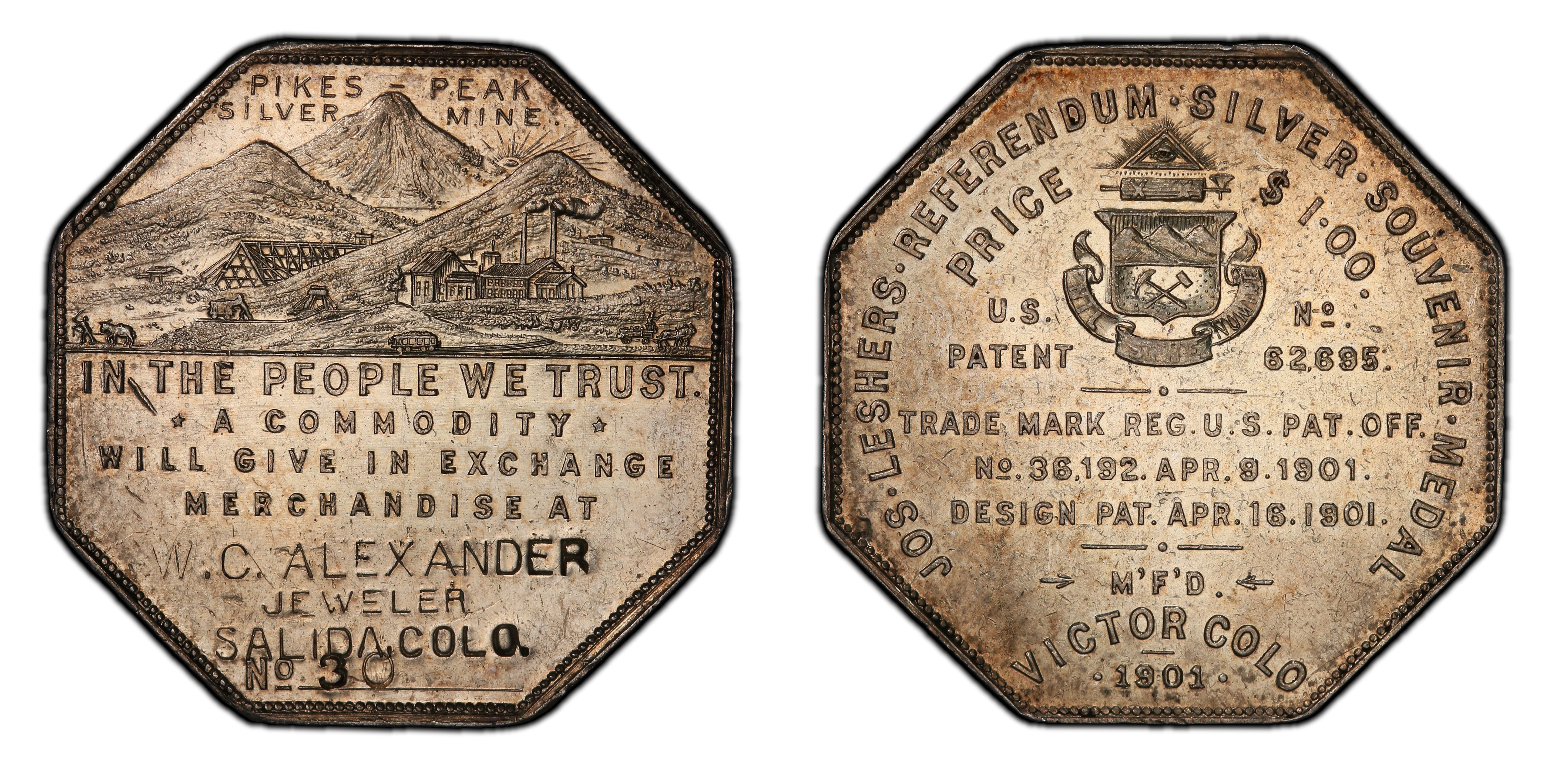 Obverse InscriptionJOS. LESHERS REFERENDUM SOUVENIR / PIKES PEAK / SILVER MINE / PRICE $1.00 / VICTOR. / COLO. / 1901 / [Merchant Stamp: W.C. ALEXANDER / JEWELER / SALIDA, COLO.]