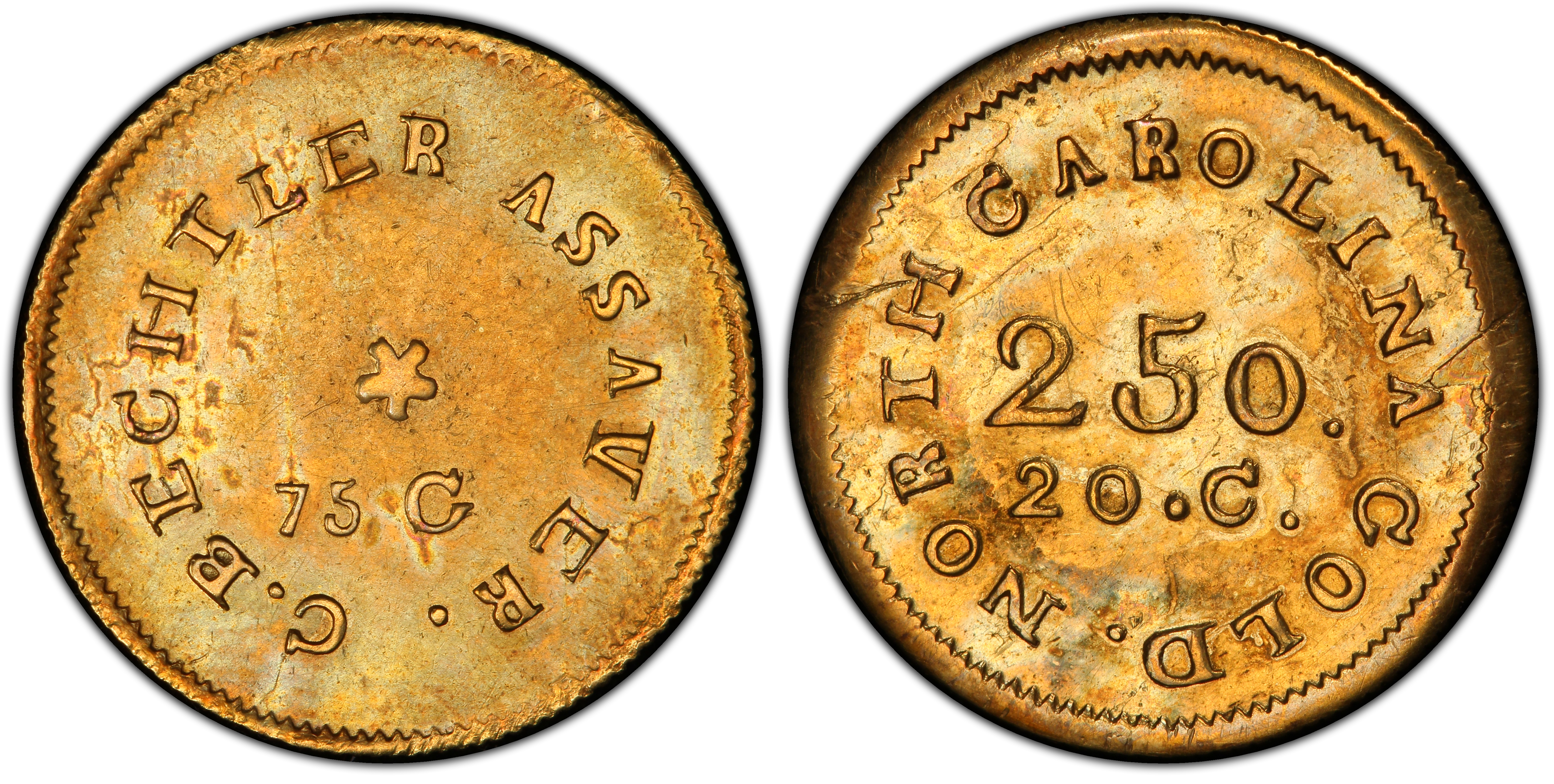 Obverse DescriptionThe central design consists of the denomination '250.' above '20.' and 'C.' within a circle of text. The legend reads 'NORTH CAROLINA GOLD.'